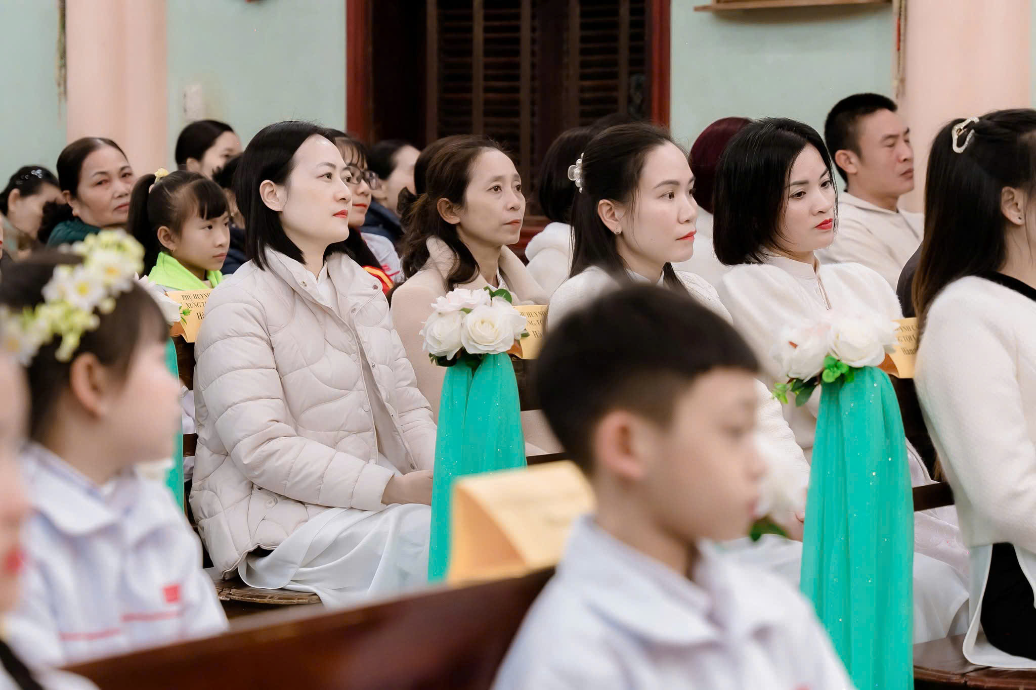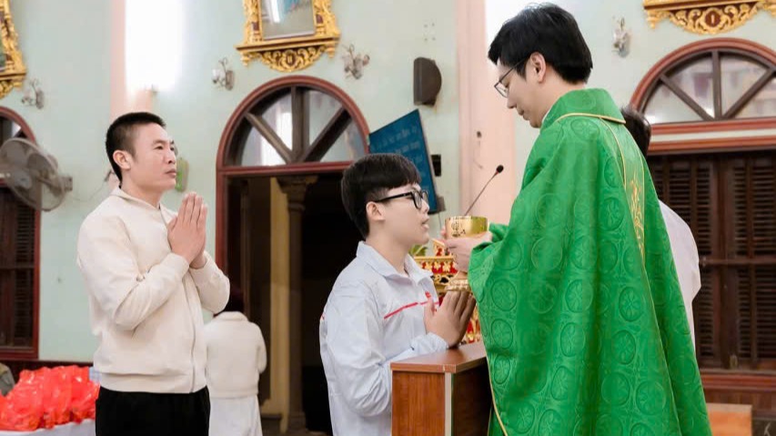 Thánh lễ được tiếp tục trong bầu khí linh thiêng và sốt sáng. Trong khoảnh khắc linh thiêng, cao trọng, các em hân hoan, xúc động khi lần đầu được rước Mình Máu Thánh Chúa vào lòng. Đó như một dấu ấn thiêng liêng không thể xóa nhòa trong tâm hồn các em.