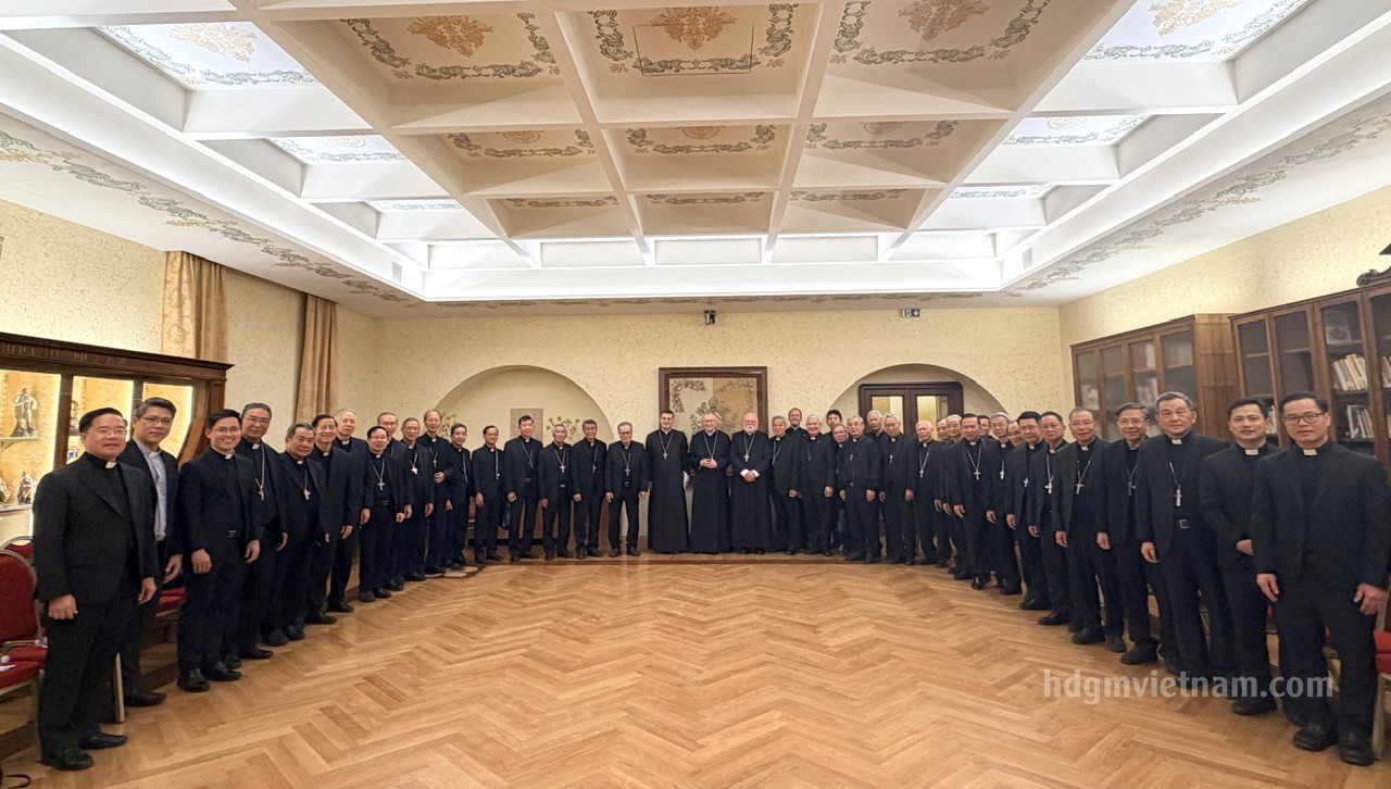 Chiều tối, đoàn đến chào thăm Phủ Quốc vụ khanh Toà thánh. Đức Hồng y Pietro Parolin, Quốc vụ khanh Toà thánh, cùng Đức Hồng Y Gallagher vui mừng tiếp đón quý Đức Giám mục Việt Nam. Sau lời chào của Đức cha Chủ tịch HĐGMVN, Đức Hồng y ân cần thăm hỏi từng vị và chia sẻ niềm vui về sự phát triển của Giáo hội Việt Nam. Ngài cũng nhắc đến cuộc gặp gỡ gần đây với phái đoàn Chủ tịch Quốc hội Việt Nam, đồng thời lắng nghe quý Đức Giám mục chia sẻ về tình hình của các giáo phận.