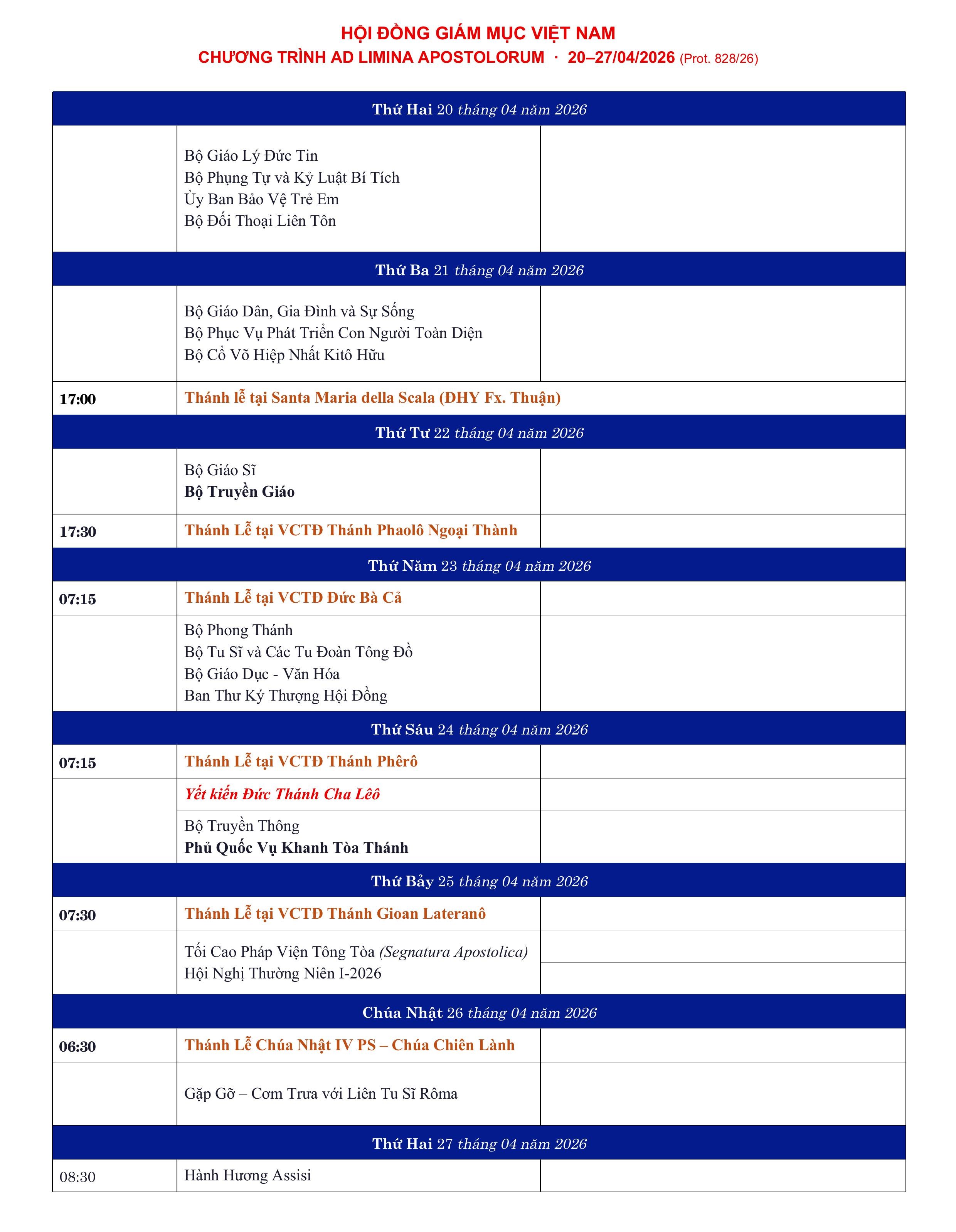 Trong thời gian ở Rôma, các Giám mục sẽ ở, sinh hoạt và hội họp tại Foyer Phát Diệm. Chương trình tuần Ad Limina năm nay diễn ra từ ngày 20 đến 27 tháng 4 năm 2026, với nhiều điểm nhấn quan trọng.