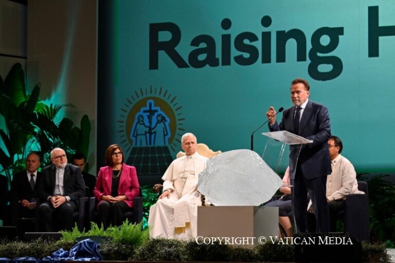 Cựu diễn viên và cựu thống đốc bang California khẳng định: “Chúng ta chỉ có thể đạt được mục tiêu và chấm dứt ô nhiễm bằng cách hợp tác cùng nhau”. Ông nhấn mạnh tầm quan trọng của sự cam kết dấn thân cá nhân và sự đóng góp của Giáo hội Công giáo. Giáo hội đã thực hiện “những điều phi thường” và với 1,4 tỷ tín hữu, “những người có thể trở thành ‘đội quân thập tự về môi trường’”, Giáo hội có “một sức mạnh đặc biệt”.