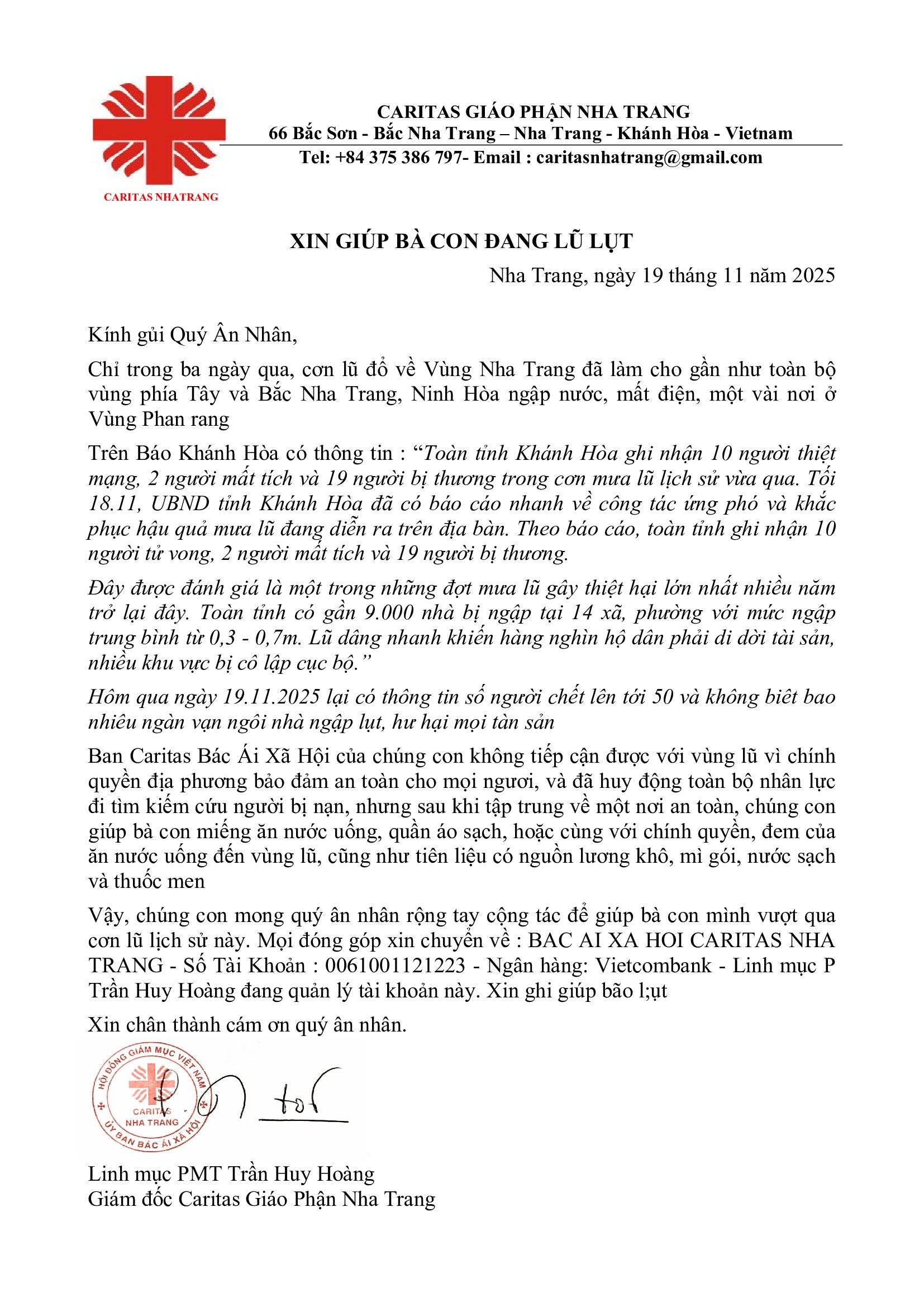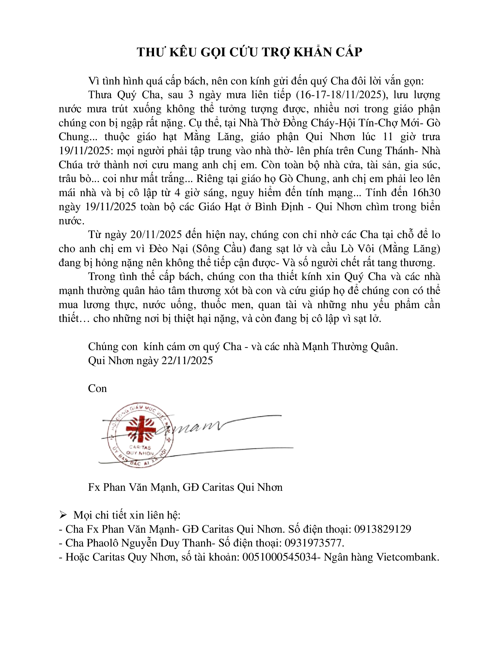 Thư kêu gọi giúp đỡ của Caritas Quy Nhơn và Caritas Nha Trang