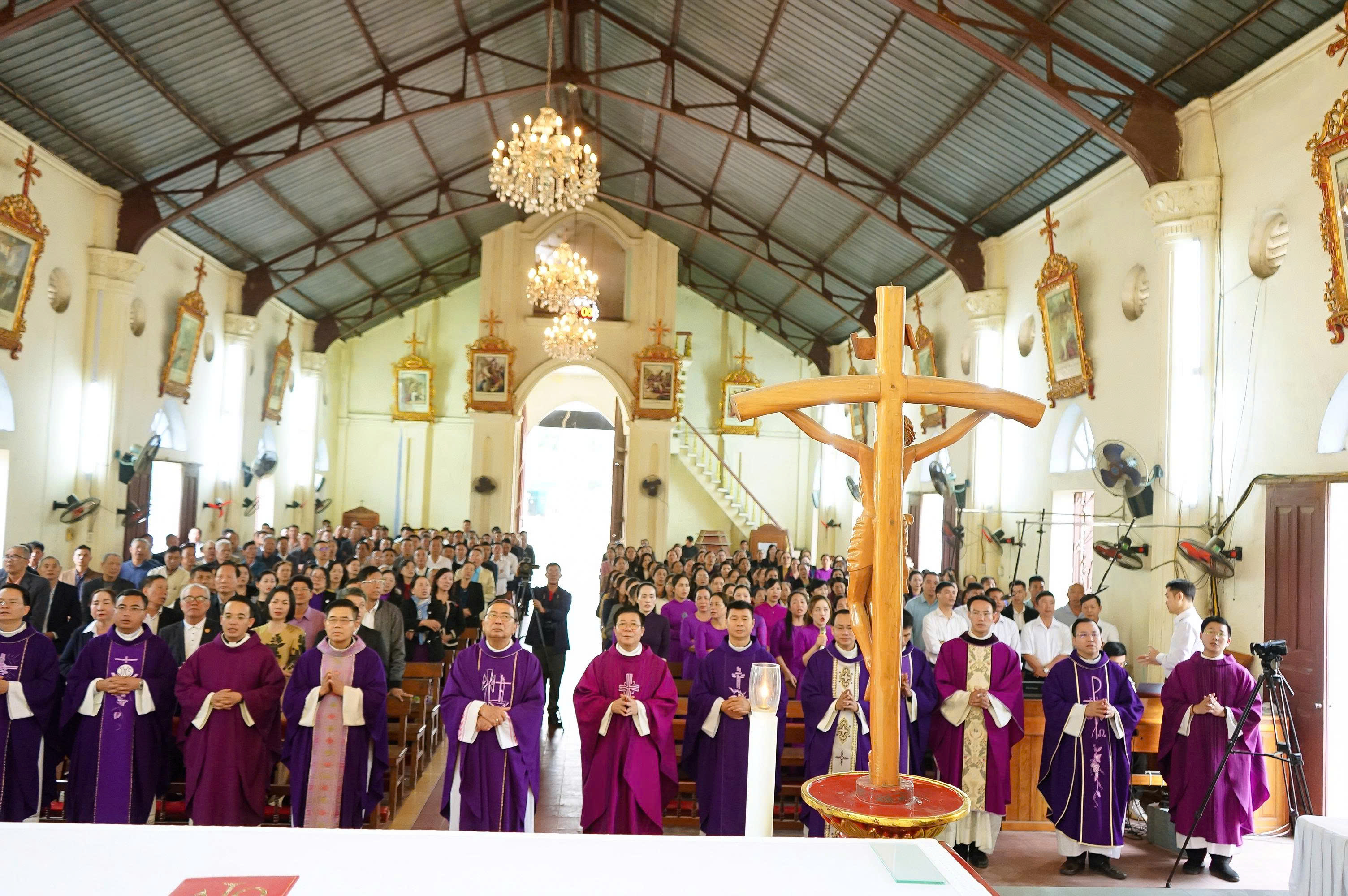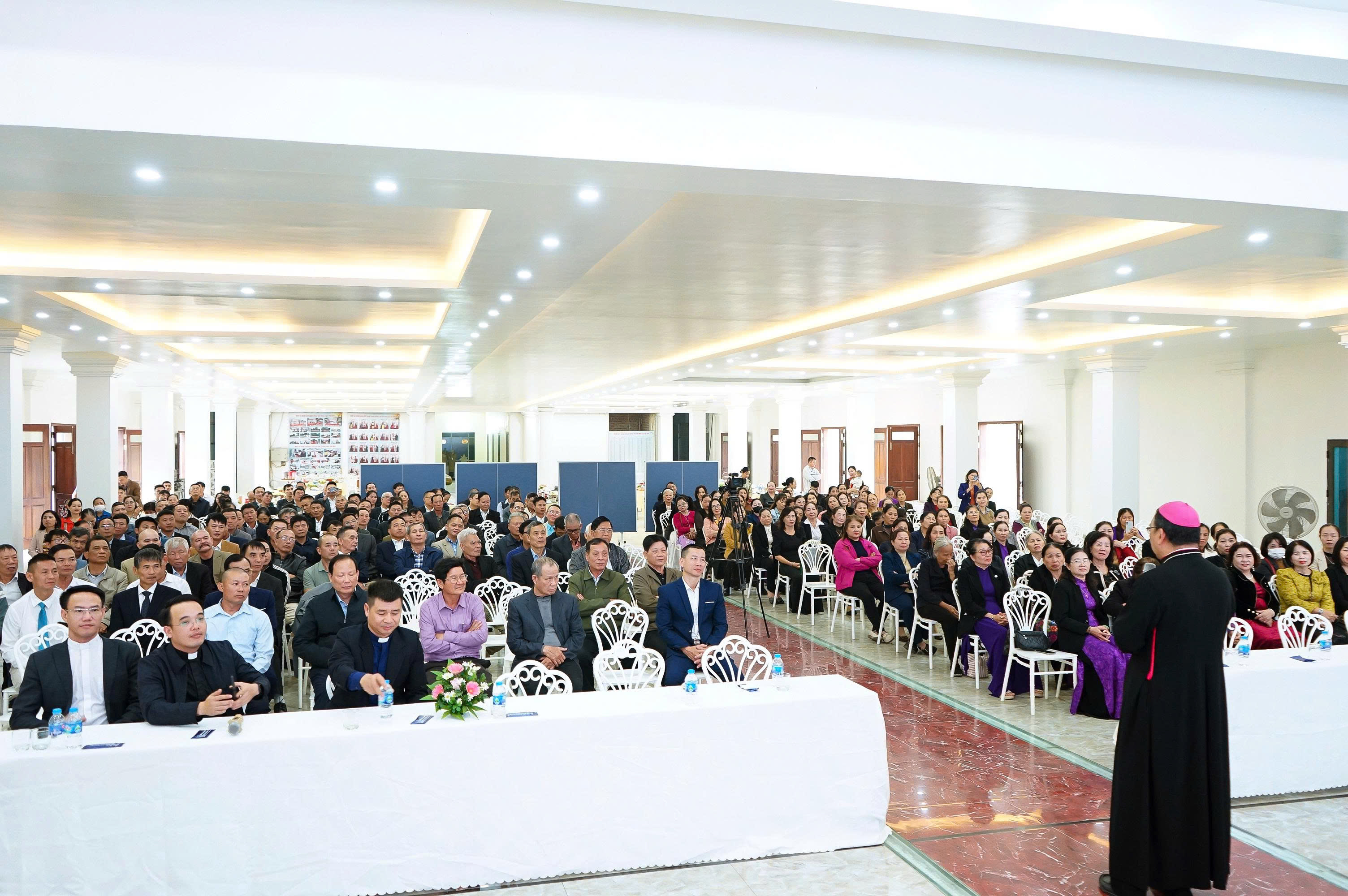 Trước giờ cử hành Thánh Lễ, các tham dự viên hân hoan chào đón sự hiện diện thân thương của Đức Cha Vinh Sơn – Chủ chăn Giáo phận. Trong cuộc gặp gỡ ngắn gọn nhưng sâu sắc, Đức Cha đã bày tỏ niềm vui mừng và gửi lời cảm ơn tới quý chức vì sự hy sinh quảng đại và tinh thần cộng tác trong việc xây dựng Giáo xứ và Giáo hội. Ngài khẳng định: tinh thần hiệp hành không chỉ là một định hướng mục vụ, nhưng phải trở thành lối sống của mỗi tín hữu, được thể hiện qua sự lắng nghe, phân định và cùng nhau đồng hành trong tình huynh đệ. Đức Cha cũng mời gọi mọi người hãy khiêm tốn nhìn nhận những yếu đuối của bản thân, đồng thời mở lòng đón nhận người khác để cùng nhau xây dựng Giáo hội trong niềm hy vọng như lòng Chúa và Hội Thánh mong ước.