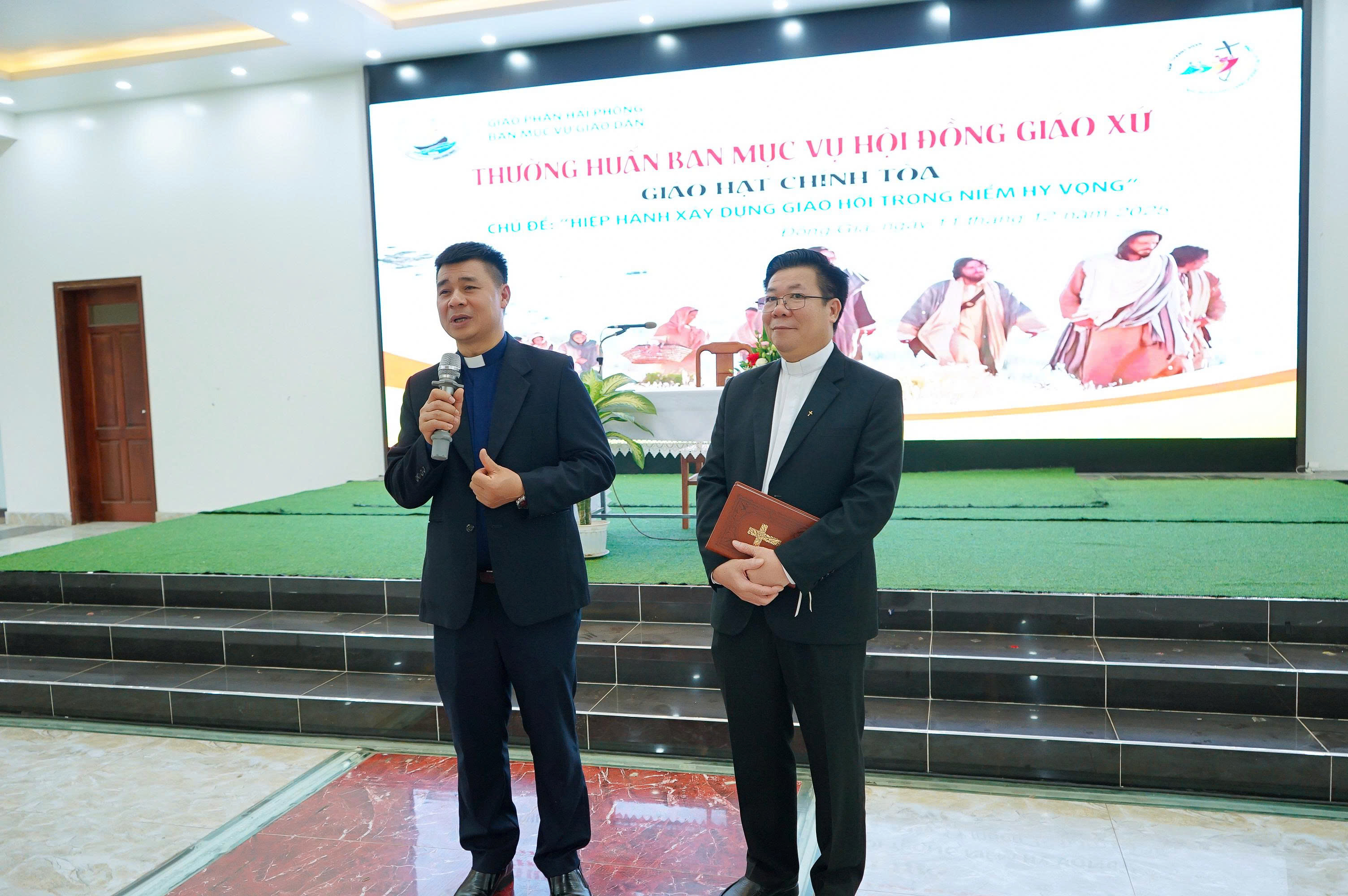 Mở đầu chương trình, Cha Giuse Bùi Văn Đạo – Trưởng ban Giảng huấn, trình bày đề tài: “Hiệp hành xây dựng Giáo hội trong niềm hy vọng”. Dựa trên nền tảng Kinh Thánh và giáo huấn của Giáo hội, Cha Giuse nhấn mạnh tính thời sự và tầm quan trọng của tiến trình hiệp hành – như một lối sống không thể thiếu trong đời sống Dân Chúa hôm nay. Qua đó, ngài tha thiết mời gọi các quý chức – những người đang thi hành sứ vụ giữa cộng đoàn – hãy biết đồng hành với nhau cách chân thành và cùng với quý Cha xứ xây dựng các giáo xứ ngày càng hiệp nhất, trưởng thành trong đức tin và đức ái.