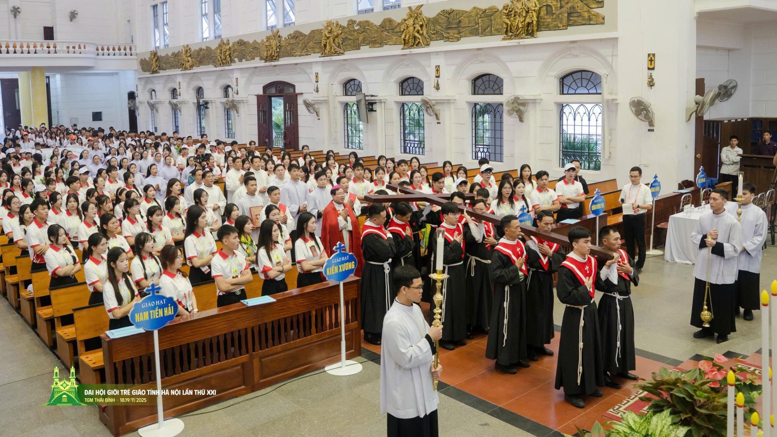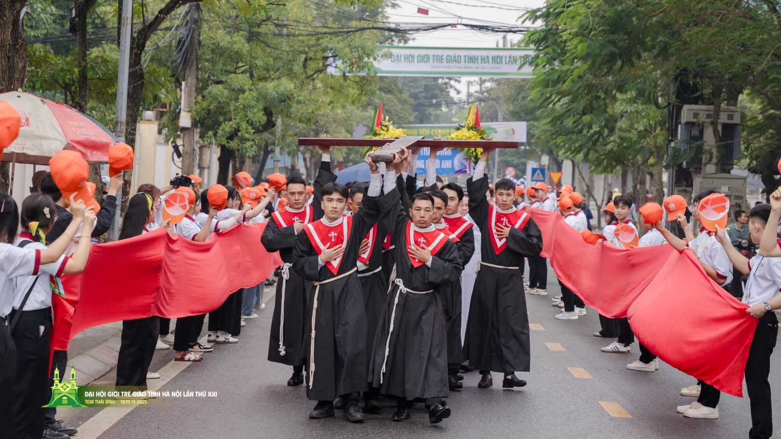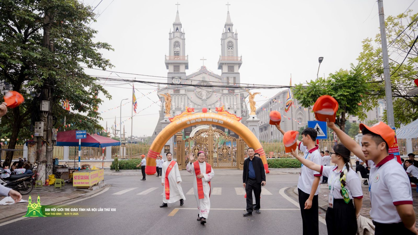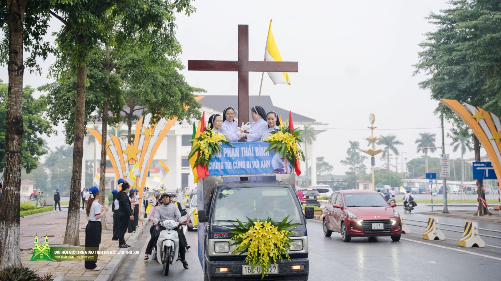 Ngay sau đó, Thánh Giá Đại hội được cung nghinh từ Hội dòng Nữ Đa Minh Thái Bình về đến Nhà thờ Chính toà Thái Bình, thu hút ánh mắt và niềm hân hoan của mọi người, mở đầu cho những khoảnh khắc trang nghiêm và đầy cảm xúc.