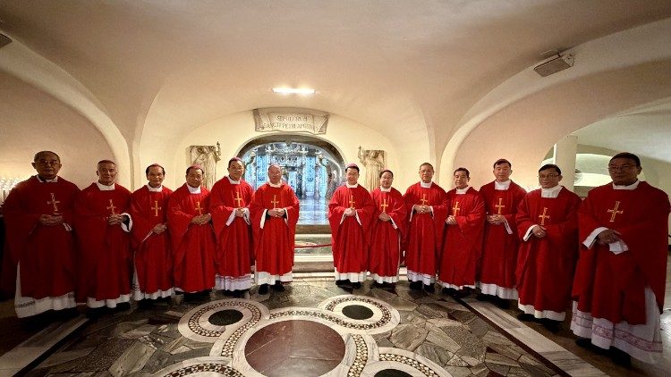 Trước khi cử hành Thánh lễ, các Đức Cha đã có giây phút suy tư cầu nguyện trước Mộ Thánh Phêrô, vị Giáo hoàng đầu tiên của Hội Thánh.