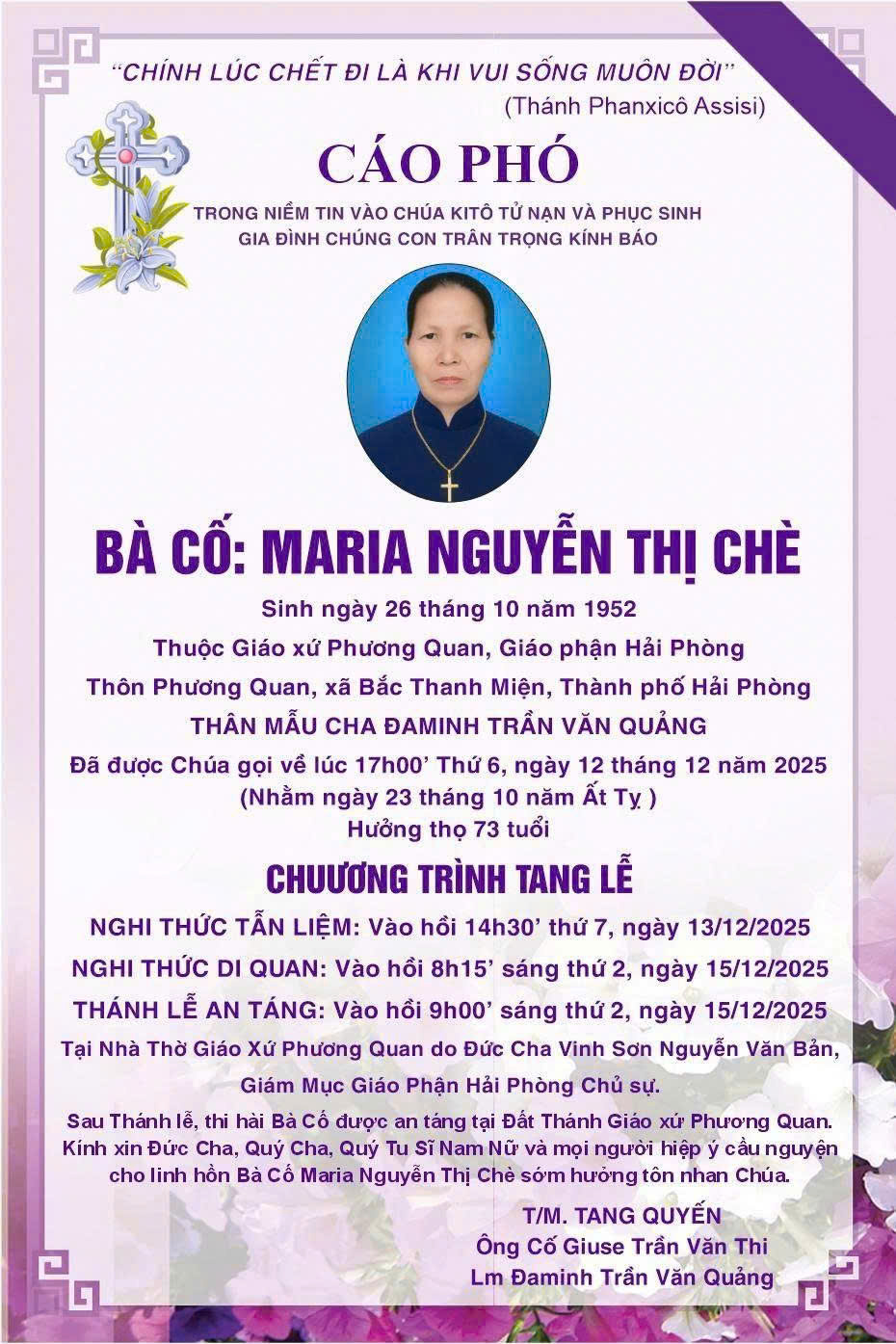 Trong niềm tin và phó thác vào Đức Ki-tô Phục Sinh, gia đình và dòng tộc trân trọng kính báo: Bà Cố Maria Nguyễn Thị Chè, thân mẫu của Linh mục Đaminh Trần Văn Quảng, đã được Chúa gọi về lúc 17h00’, Thứ Sáu, ngày 12 tháng 12 năm 2025