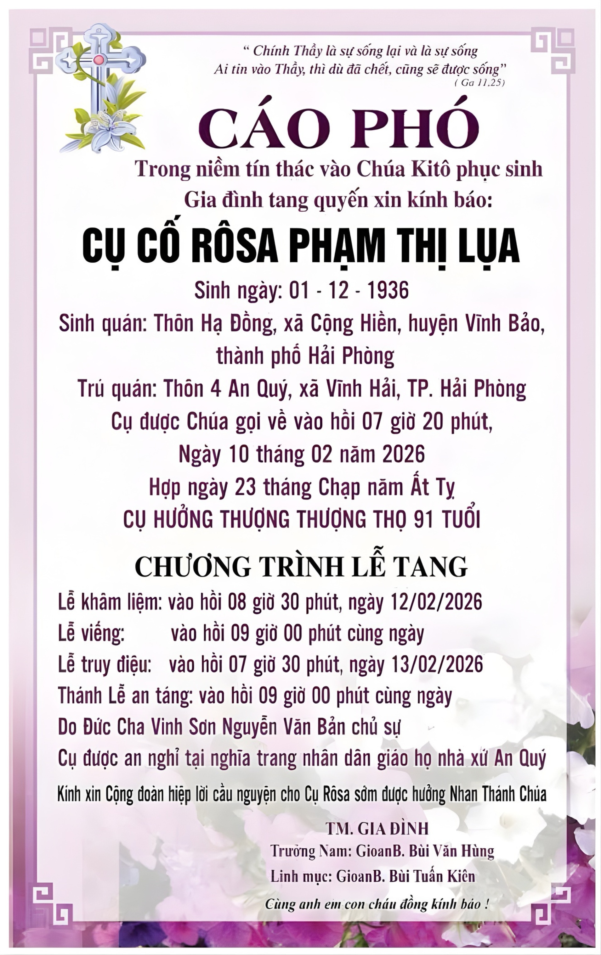 Trong niềm tin và phó thác vào Đức Kitô Phục Sinh, gia đình và dòng tộc trân trọng kính báo: Cụ Cố Rôsa Phạm Thị Lụa, thân mẫu Cha Gioan Baotixita Bùi Tuấn Kiên, đã được Chúa gọi về vào hồi 07 giờ 20 phút ngày 10 tháng 02 năm 2026.