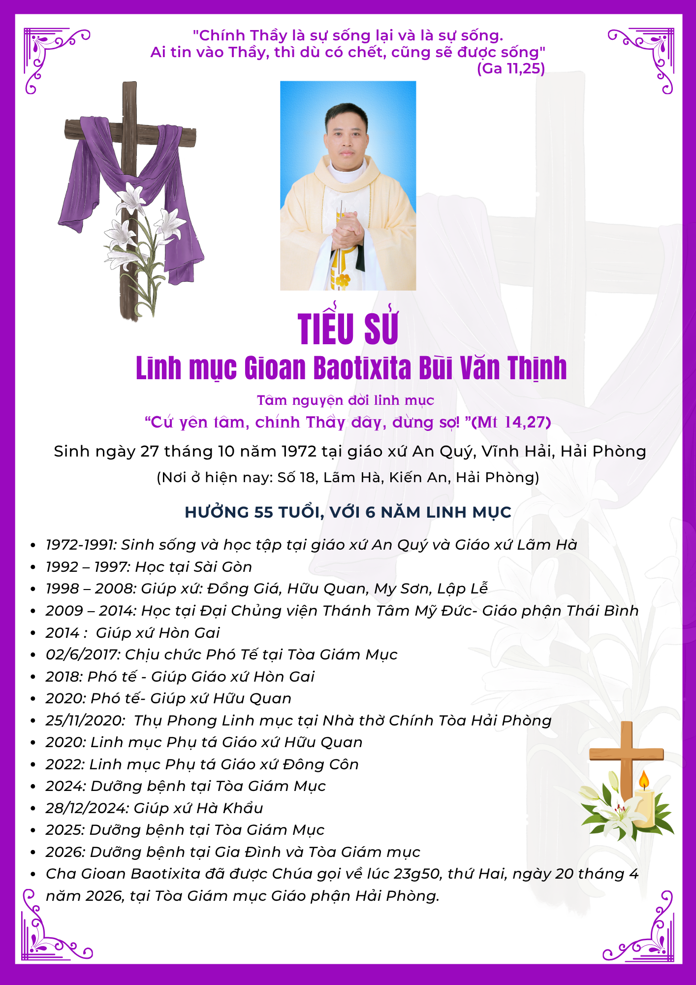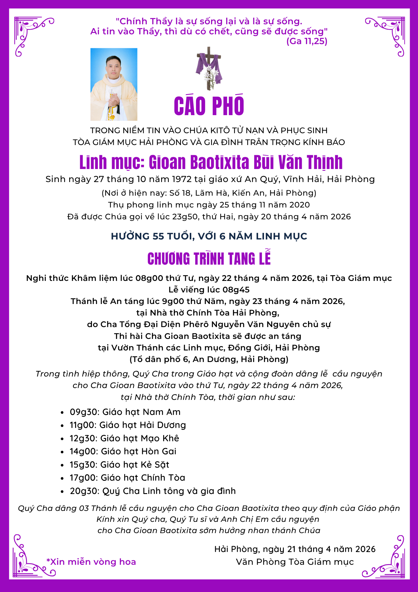 Trong niềm tin vào Chúa Kitô Tử nạn và Phục sinh, Tòa Giám mục Hải Phòng và gia đình trân trọng kính báo: Linh mục Gioan Baotixita Bùi Văn Thịnh, sinh ngày 27 tháng 10 năm 1972 tại giáo xứ An Quý, Vĩnh Hải, Hải Phòng, được thụ phong Linh mục ngày 25 tháng 11 năm 2020, đã được Chúa gọi về lúc 23g50, thứ Hai, ngày 20 tháng 4 năm 2026.