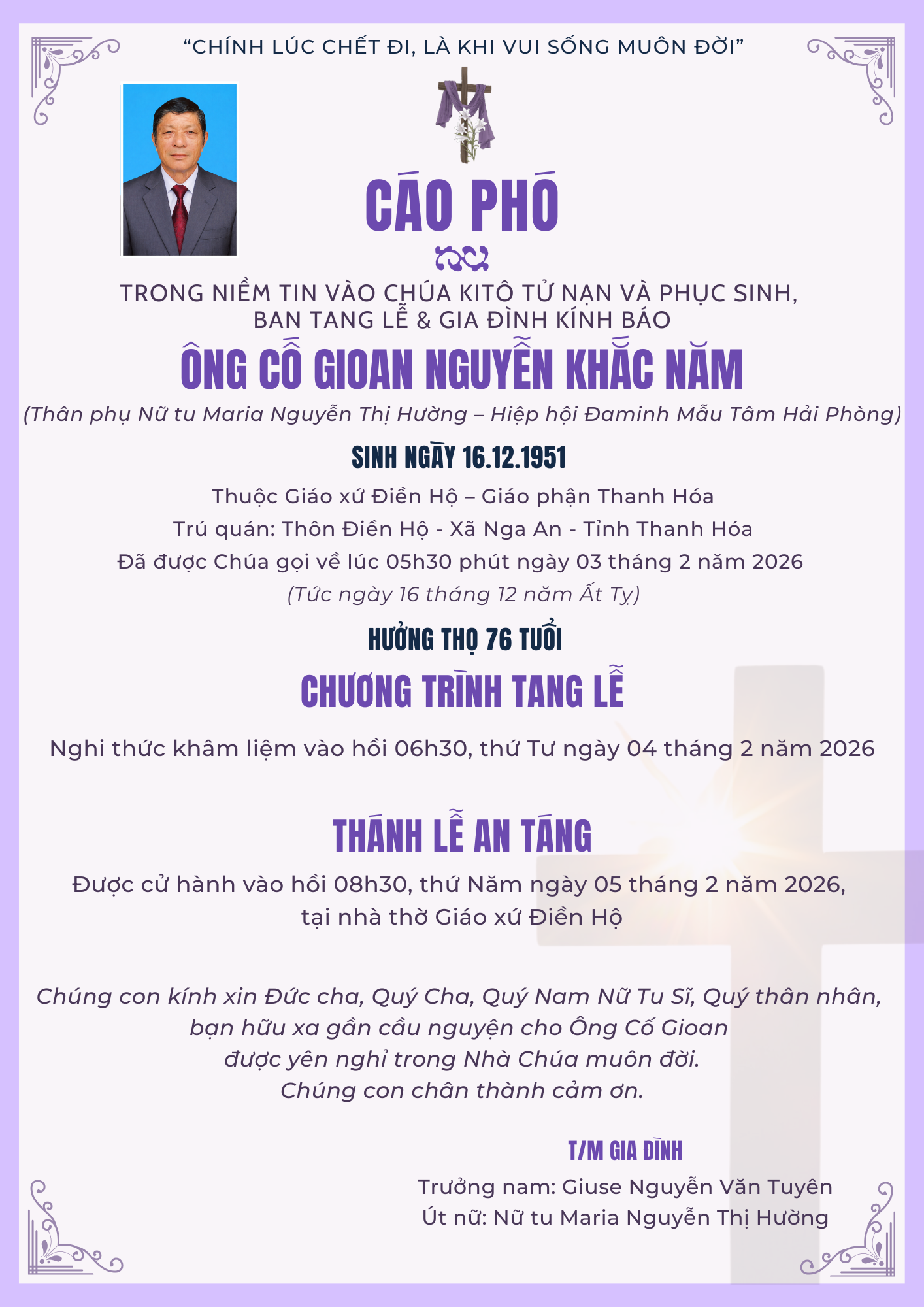 Trong niềm tin và phó thác vào Đức Kitô Phục Sinh, gia đình và dòng tộc trân trọng kính báo: ÔNG CỐ GIOAN NGUYỄN KHẮC NĂM, Thân phụ Nữ tu Maria Nguyễn Thị Hường – Hiệp hội Đaminh Mẫu Tâm Hải Phòng, đã được Chúa gọi về vào hồi 05 giờ 30 phút ngày 03 tháng 02 năm 2026.
