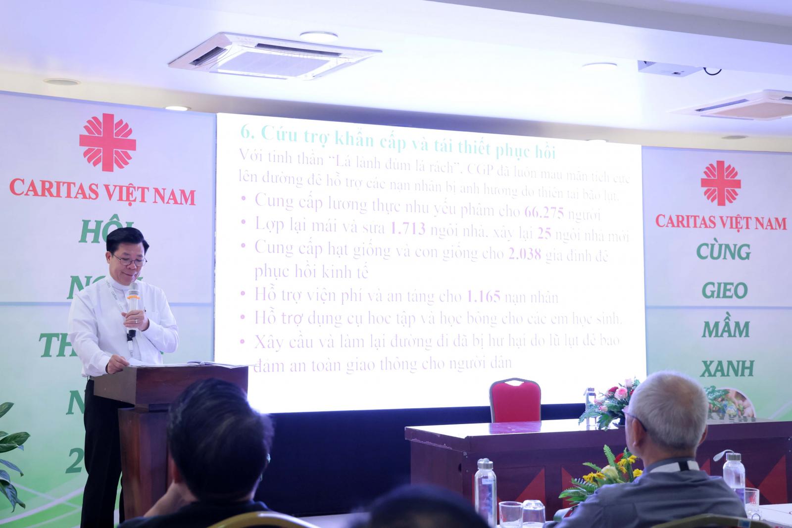 Tiếp đến cha Gioan Baotixita Vũ Văn Kiện báo cáo các hoạt động của văn phòng Caritas Việt Nam cũng như của các hoạt động của 27 Caritas giáo phận.