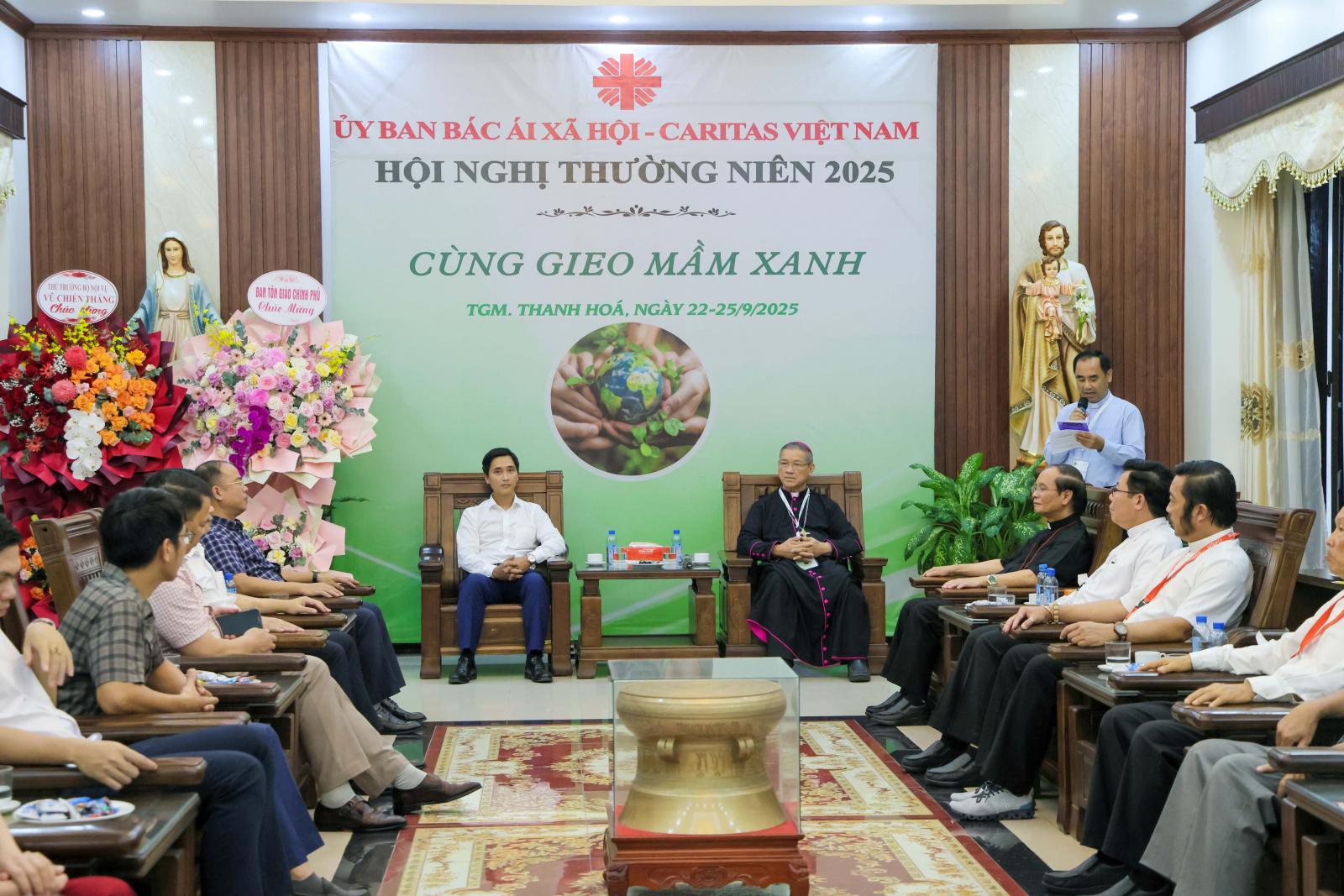 Sau Thánh lễ, tại Hội trường, Đức cha chủ tịch đọc diễn văn khai mạc với chủ đề: “Cùng Gieo Mầm Xanh”. Trong bài diễn văn, Đức cha Tôma nhấn mạnh đến vai trò, trách nhiệm của từng người nhất là các thành viên Caritas Việt Nam hãy bắt tay vào việc chăm sóc Ngôi Nhà Chung. Đức cha mời gọi hãy bắt đầu gieo Mầm Xanh từ cá nhân. Đó có thể là những hành vi nhỏ như tắt một bóng đèn khi ra khỏi phòng, sử dụng đồ tái chế, phân loại rác, trồng một cây xanh…. Sau đó đến việc chung tay, cùng gieo Mầm Xanh bởi đó là trách nhiệm của mọi người. Để làm được điều này, Caritas cần liên đới, hiệp hành trong Hội thánh và cộng tác với nhau. Đức cha nói, công việc này không phải dễ dàng nhưng hãy tin vào Chúa như lời Thánh vịnh 125 “Ai gieo trong lệ sầu, sẽ gặt trong hân hoan” và như lời của thánh Phaolô “Tôi trồng, Apollo tưới, Thiên Chúa cho mọc lên” (1 Cr 3,6). Caritas chúng ta tin rằng, phần chúng ta cứ gieo, chính Thiên Chúa mới là Người cho mọc lên.