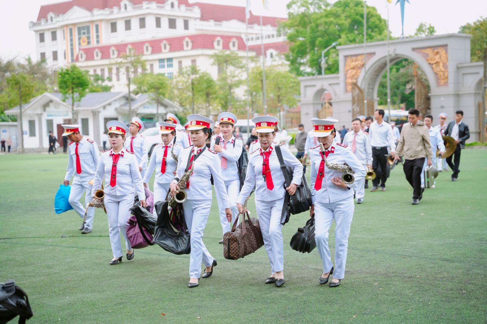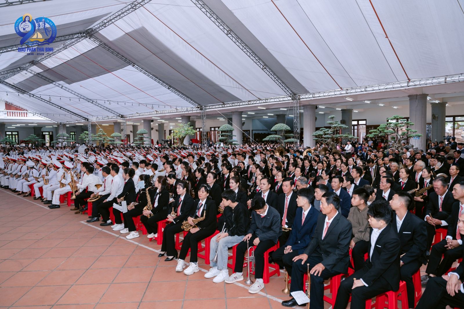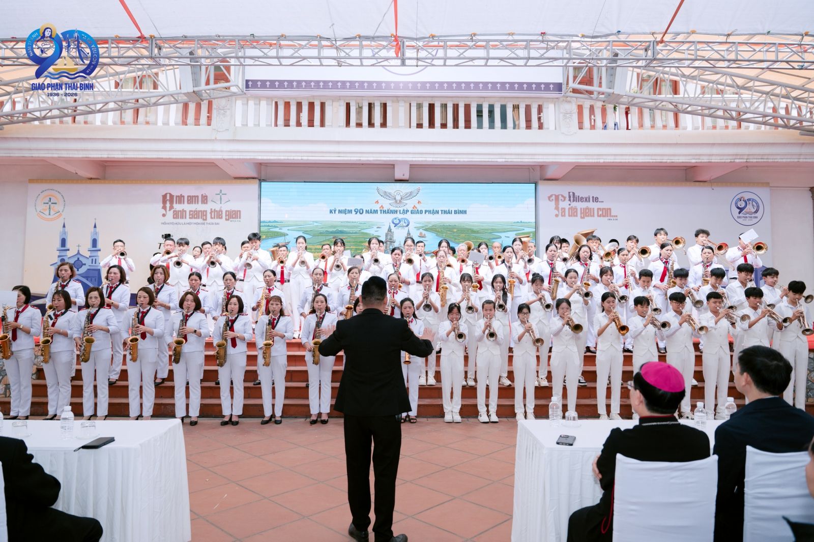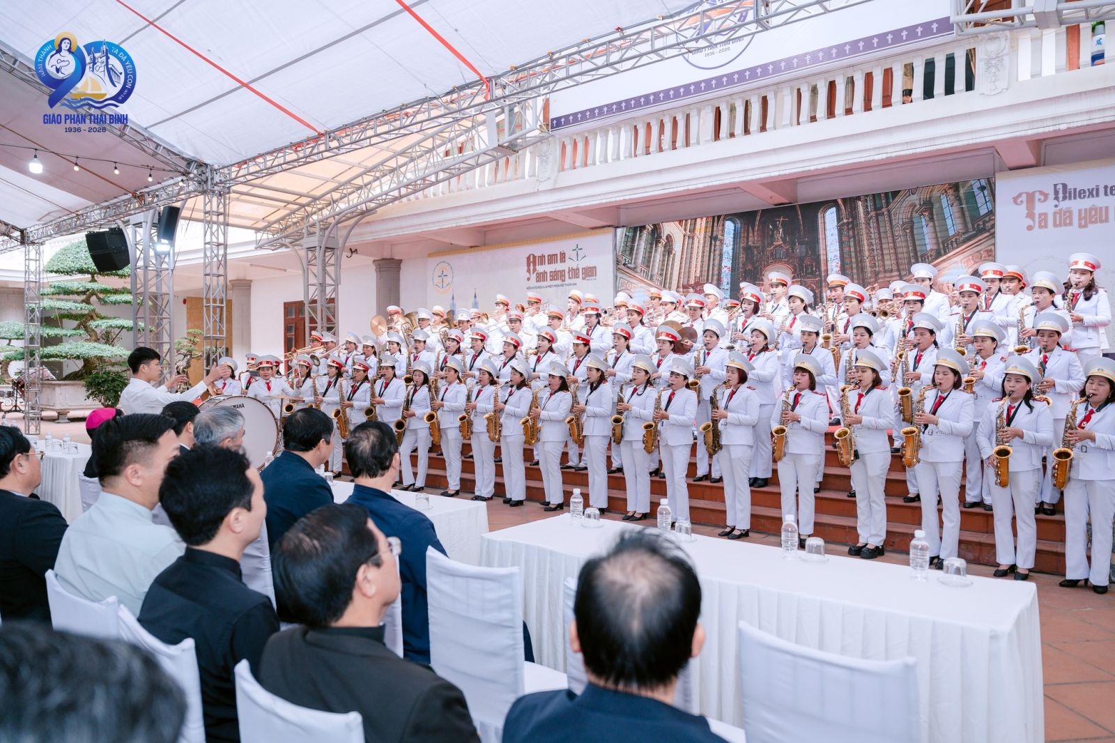 Vào lúc 08g00, các thành phần dân Chúa đã quy tụ tại Giếng Trời – Toà Giám mục, để cùng nhau hoà khúc tri ân. Ngày Đại hội Kim Nhạc hôm nay không chỉ là một cuộc gặp gỡ, nhưng mỗi tiếng kèn vang lên đã trở thành bản hòa ca của đức tin, khúc nhạc của niềm hy vọng và giai điệu của lời tạ ơn. Tất cả hòa quyện để làm vang lên lời xác tín của Giáo phận trong Năm Thánh với chủ đề: “Ta đã yêu con” (Kh 3,9).