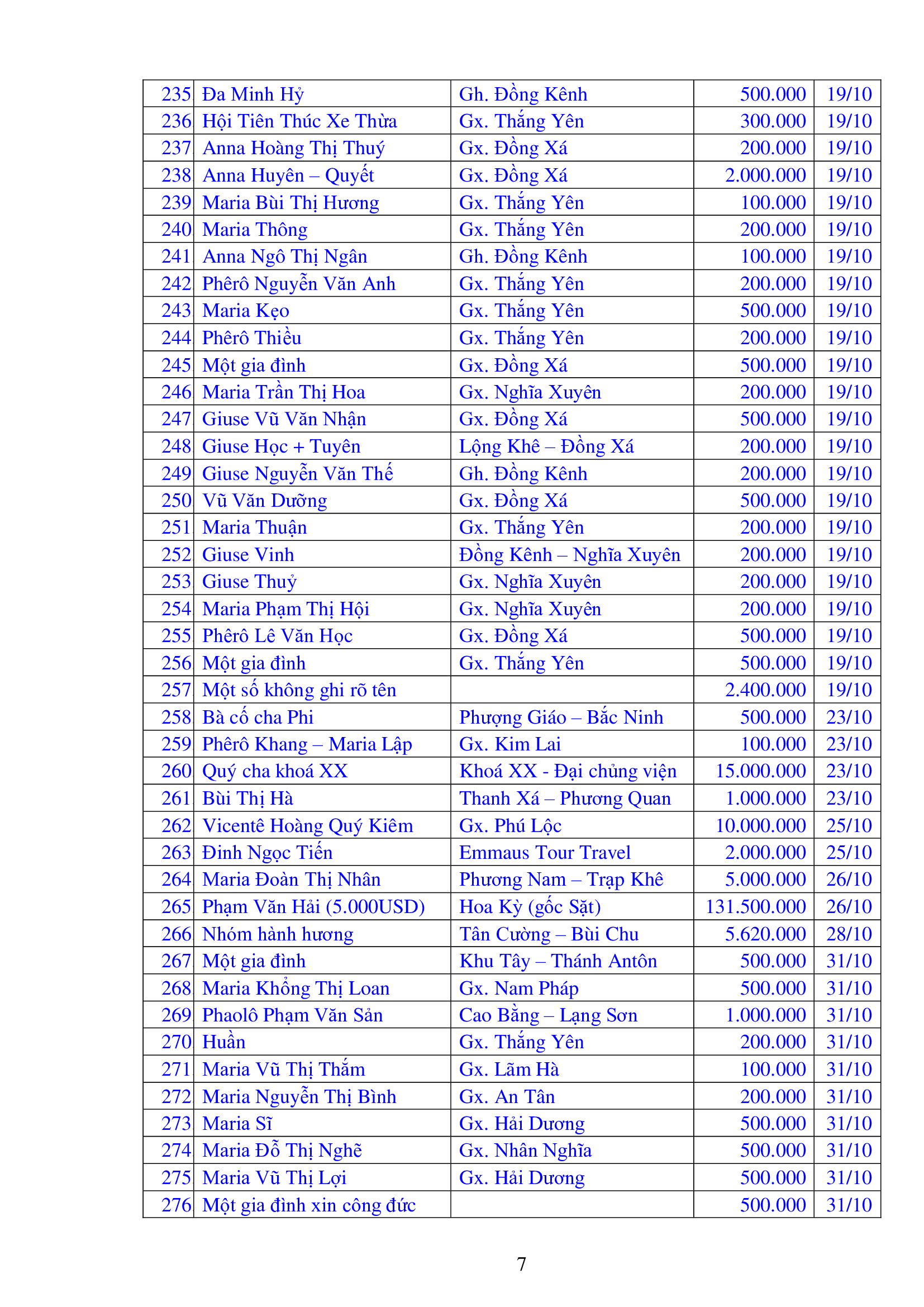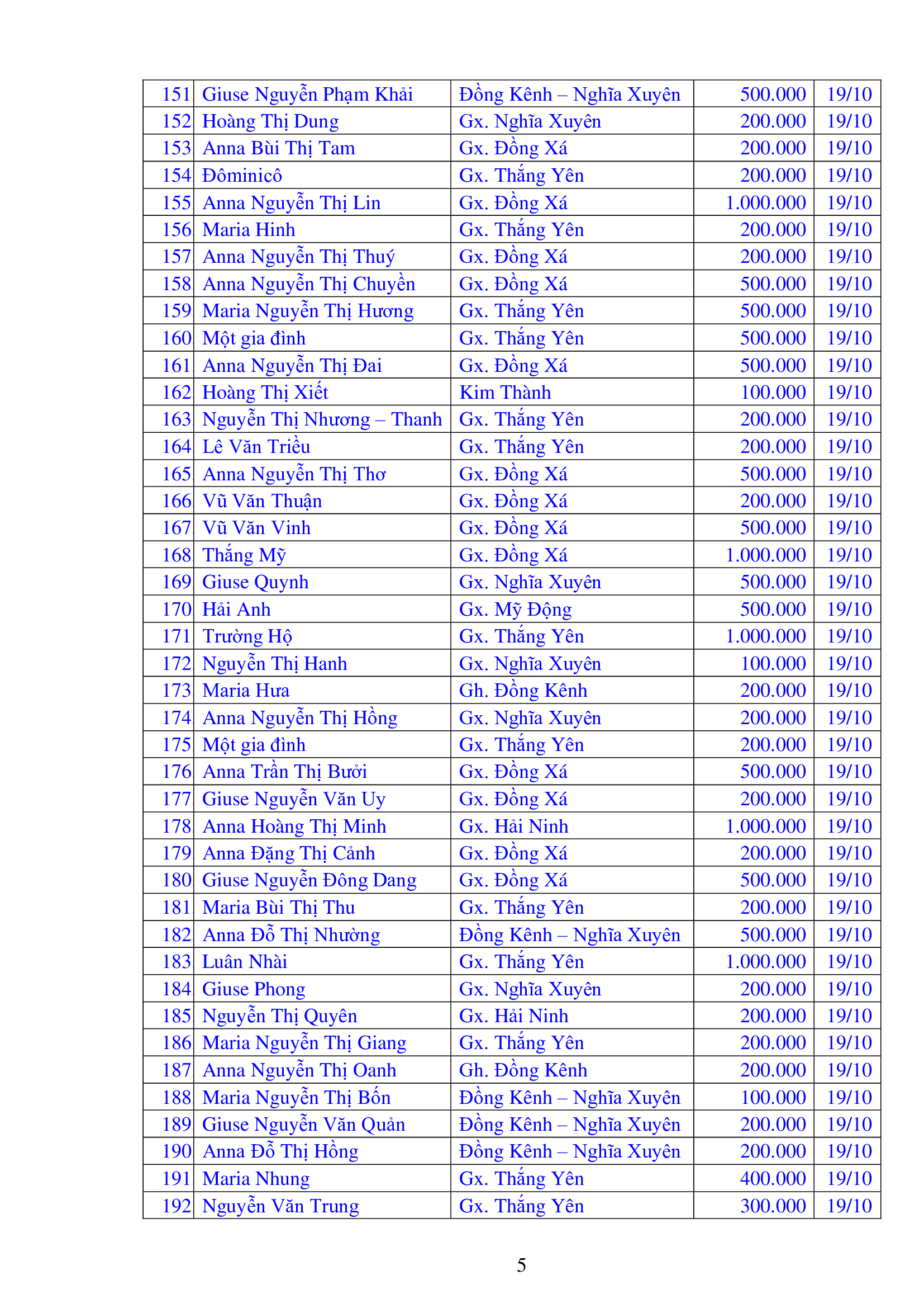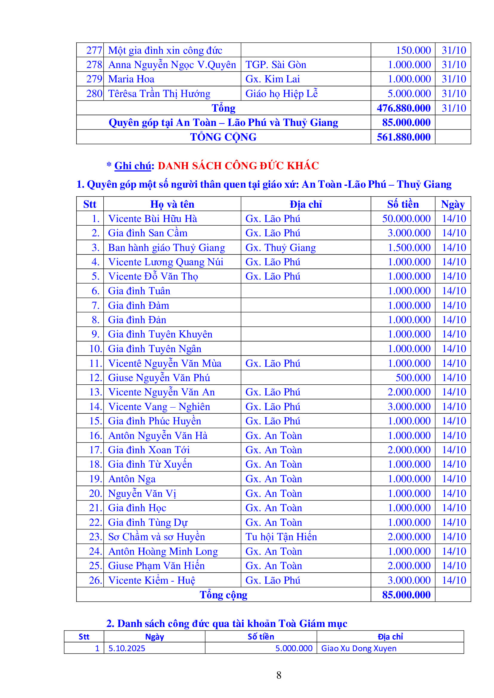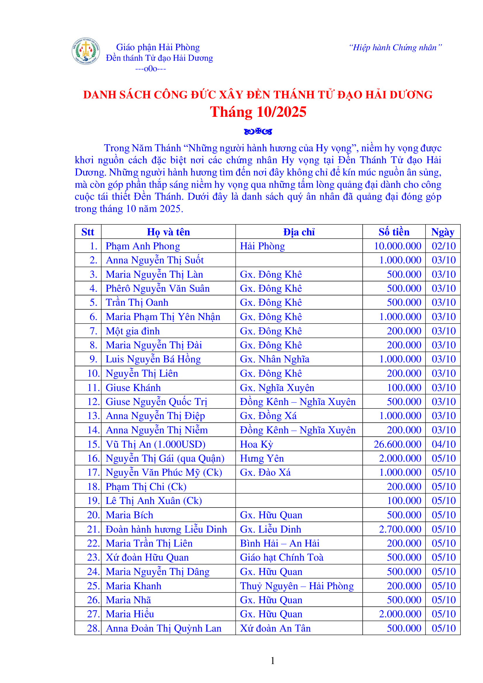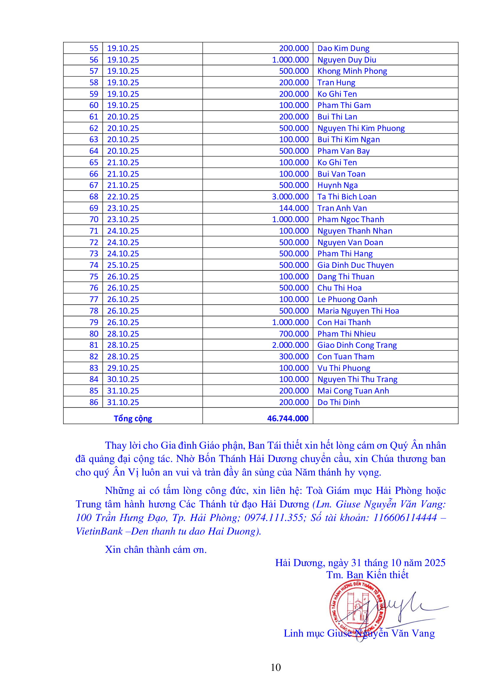 Danh sách công đức xây dựng Đền Thánh Tử Đạo Hải Dương - Tháng 10 năm 2025