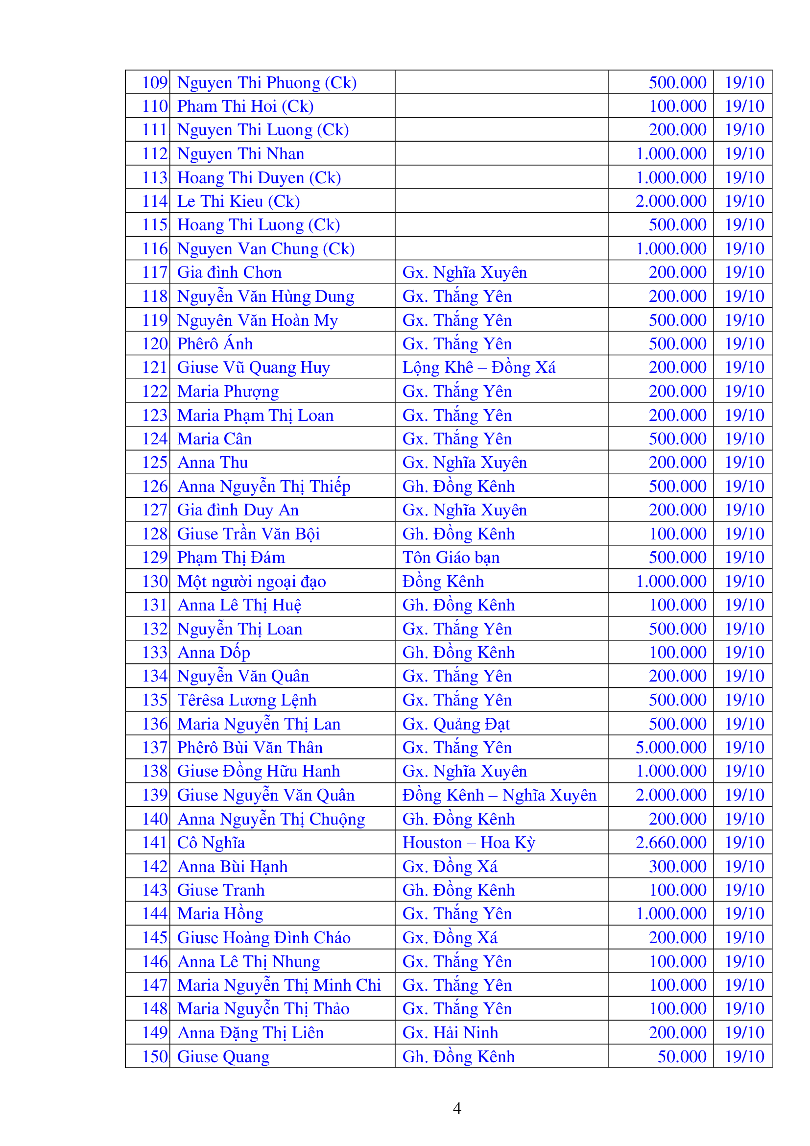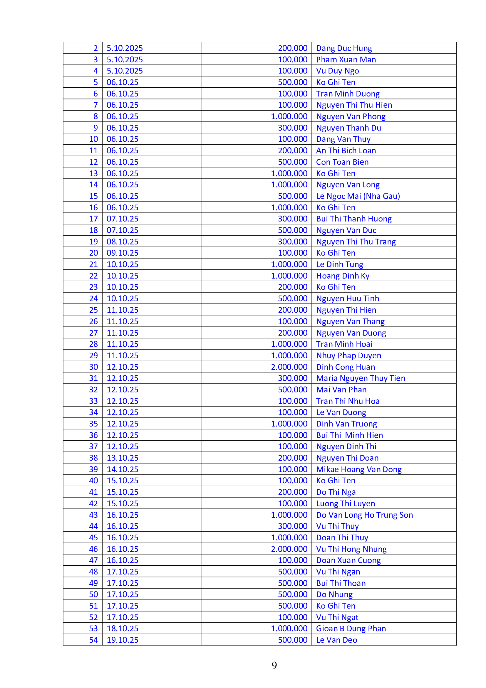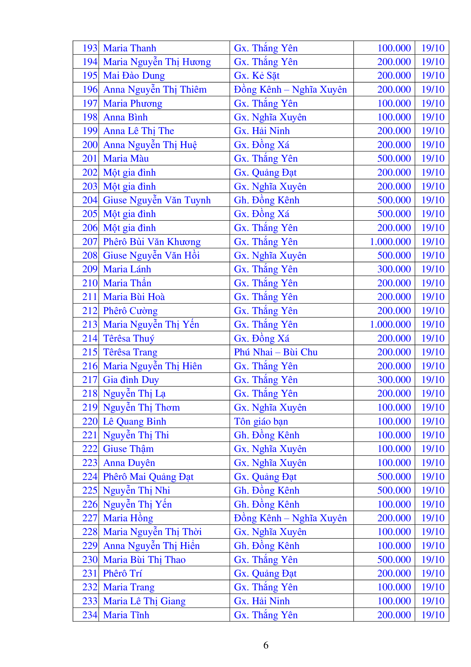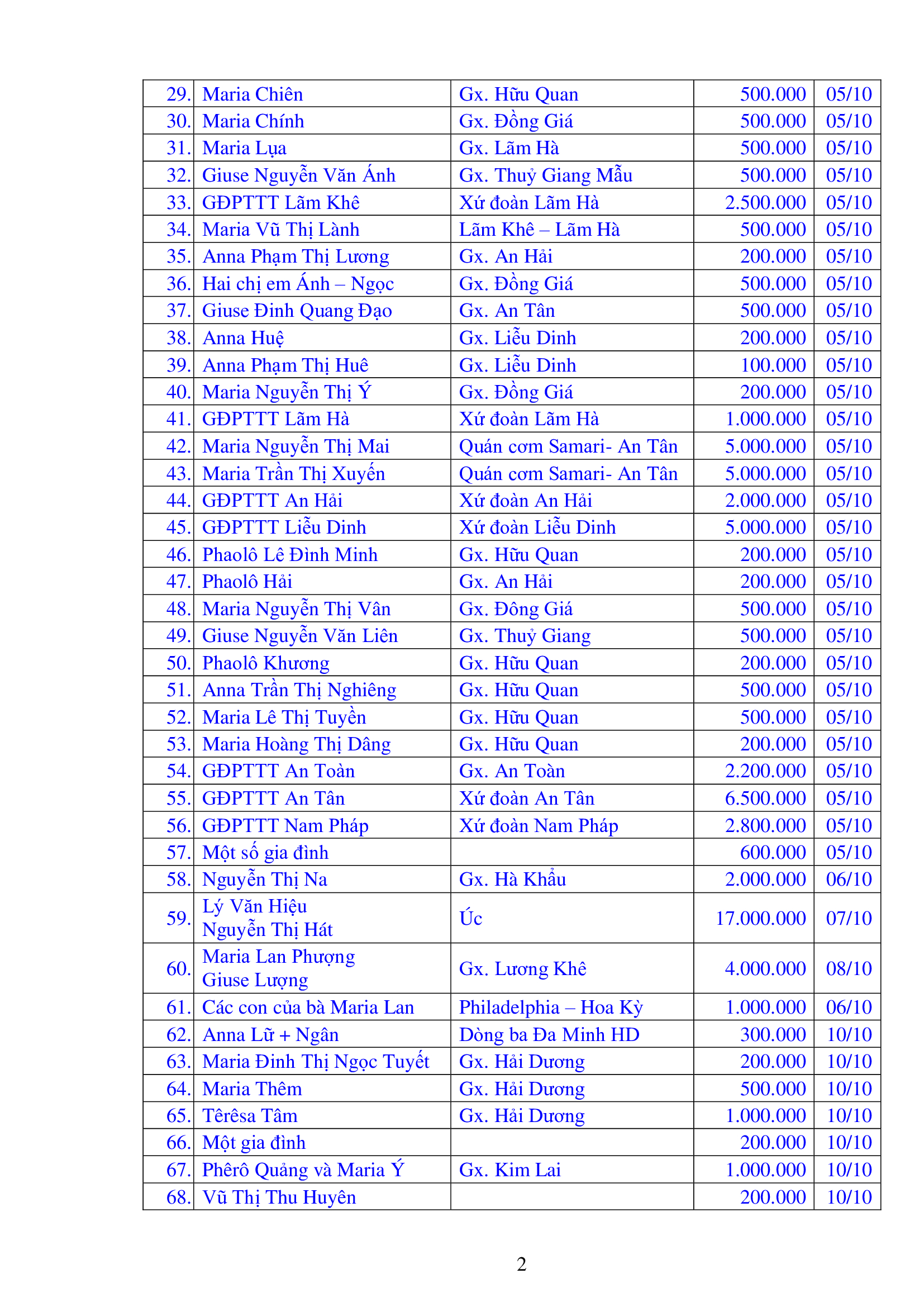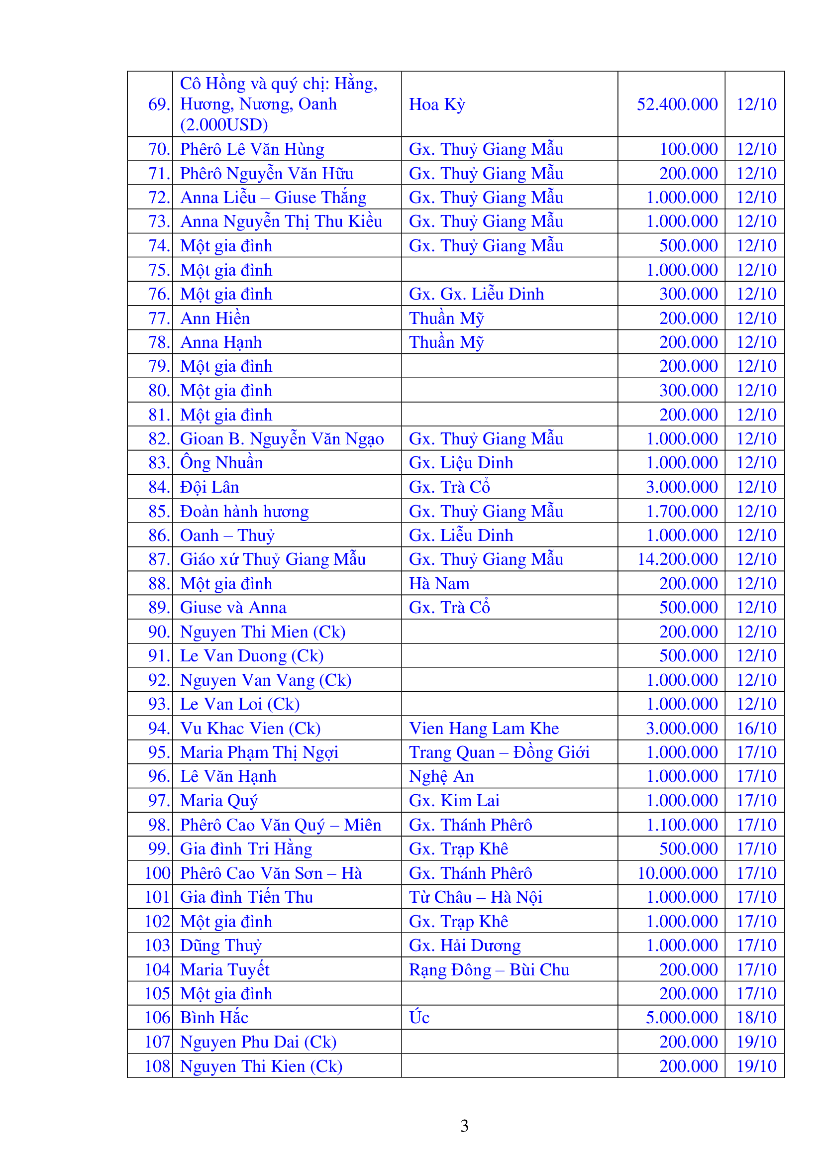Danh sách công đức xây dựng Đền Thánh Tử Đạo Hải Dương - Tháng 10 năm 2025