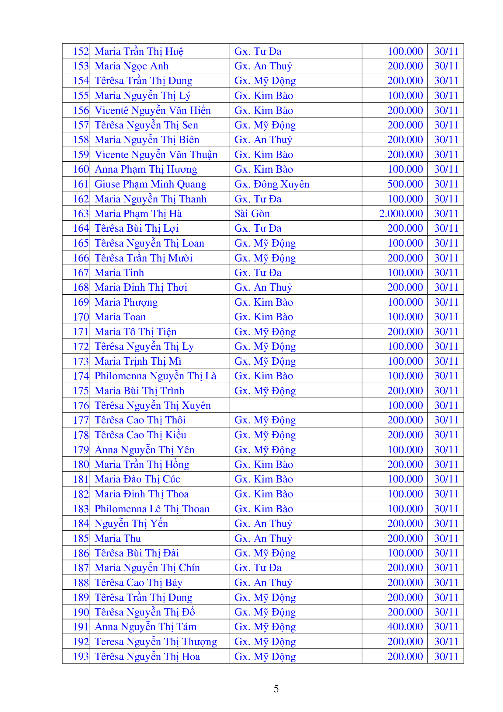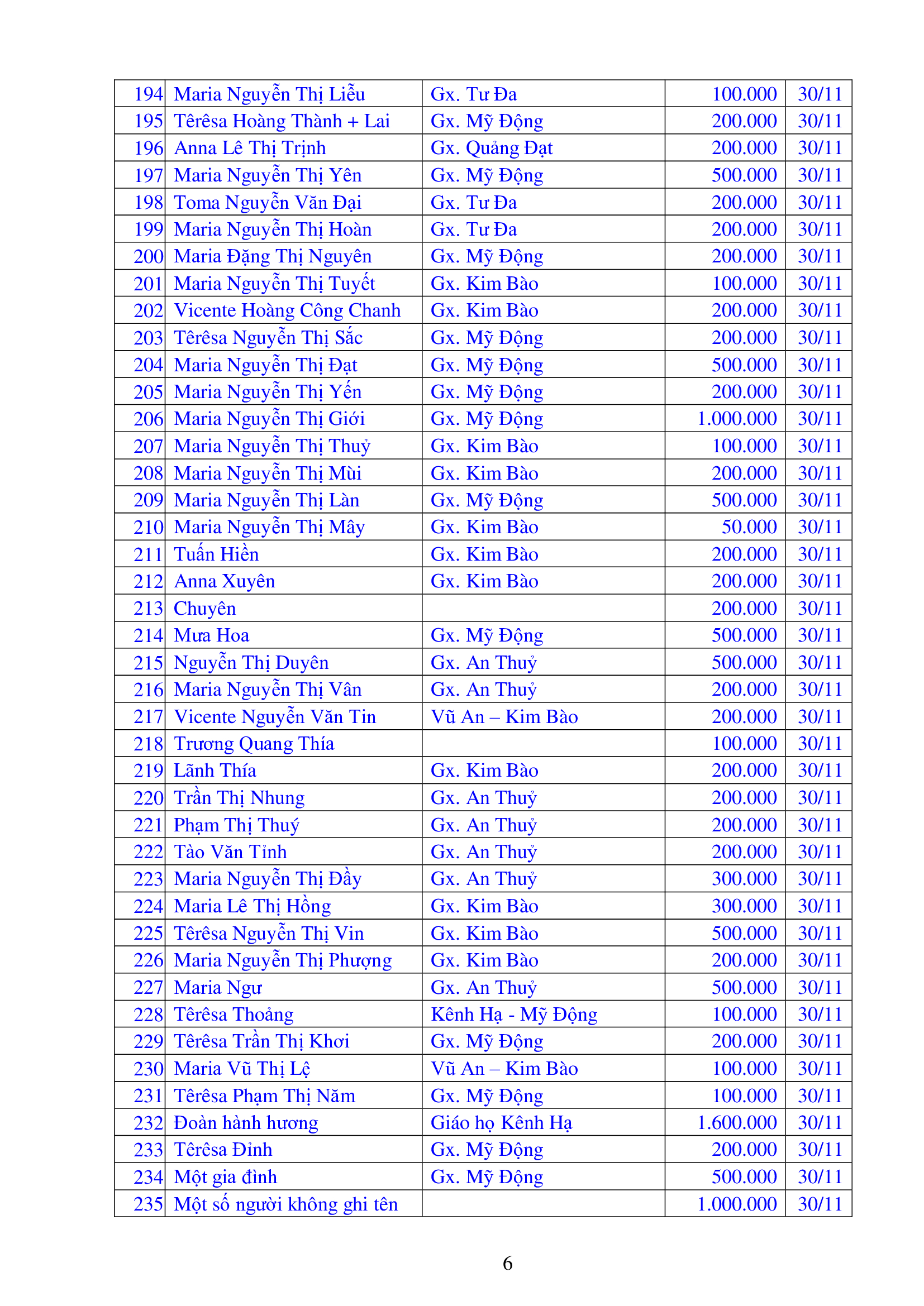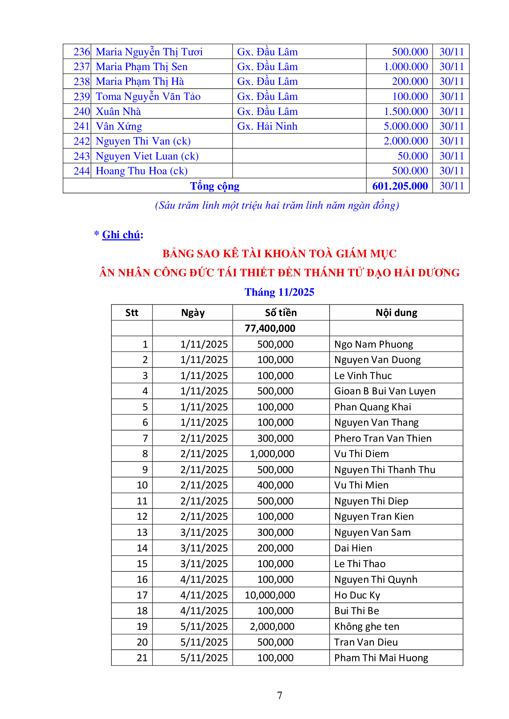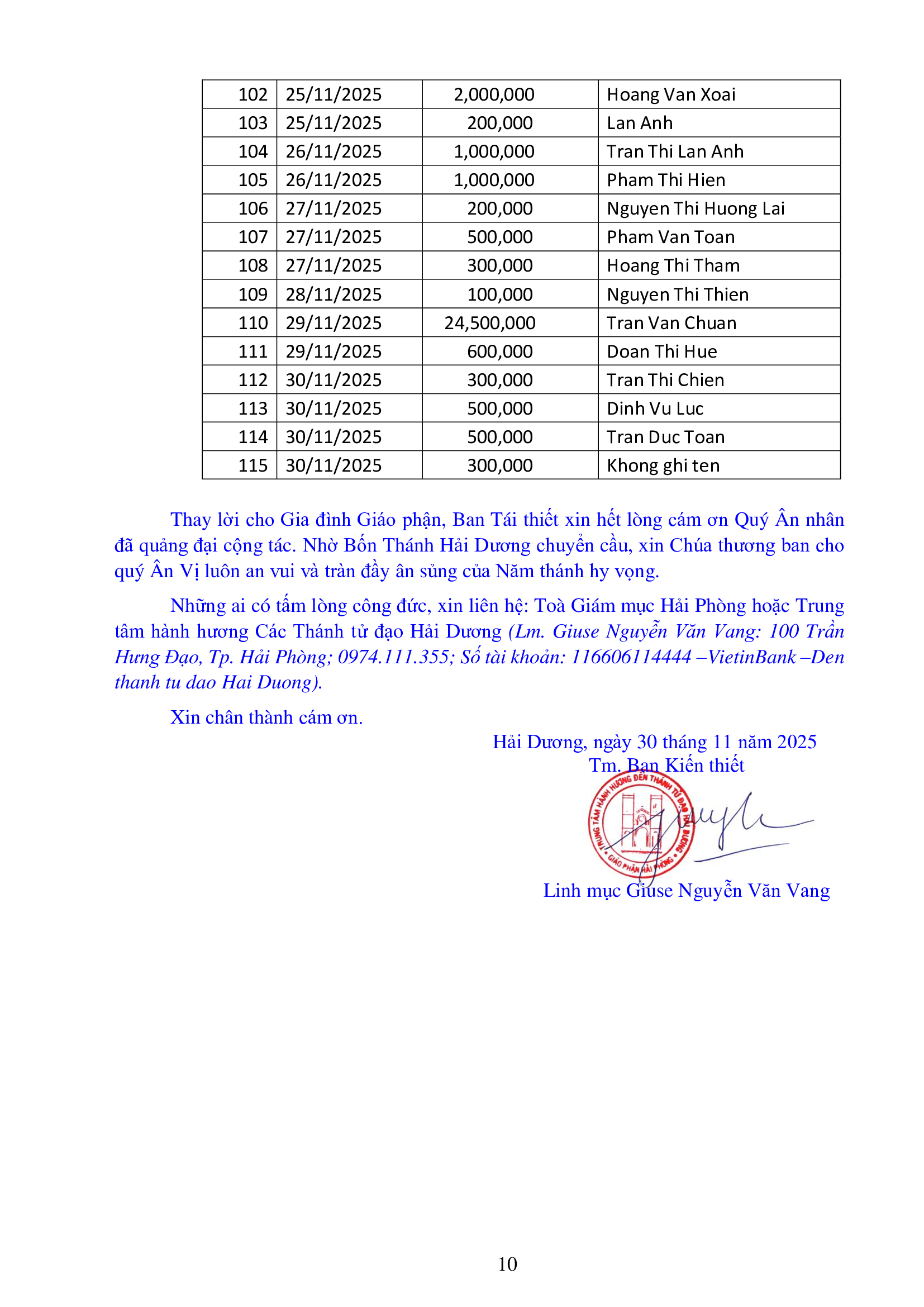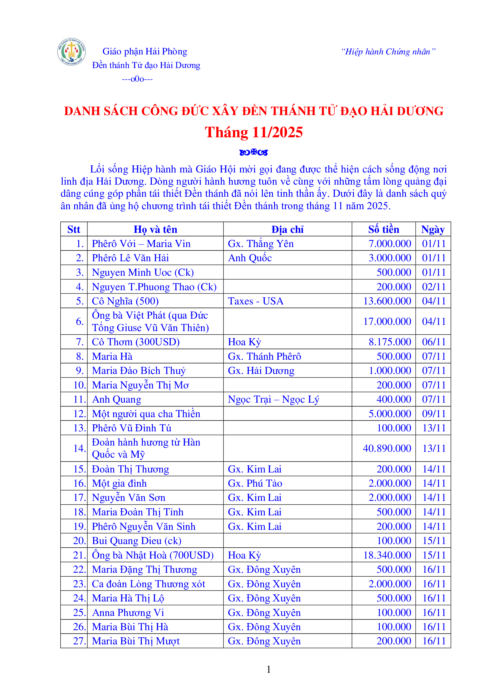 Danh sách công đức xây dựng Đền Thánh Tử Đạo Hải Dương - Tháng 11 năm 2025