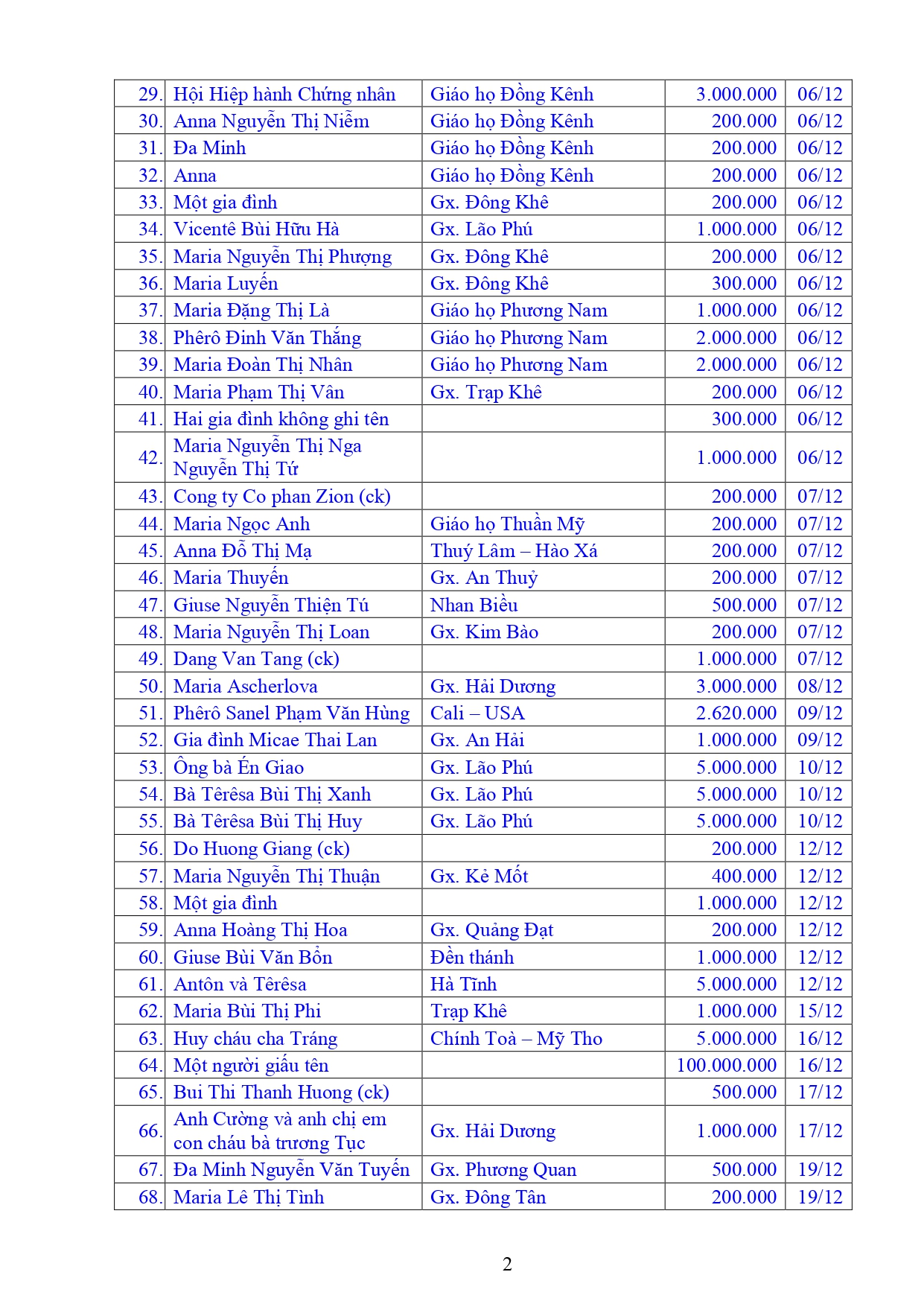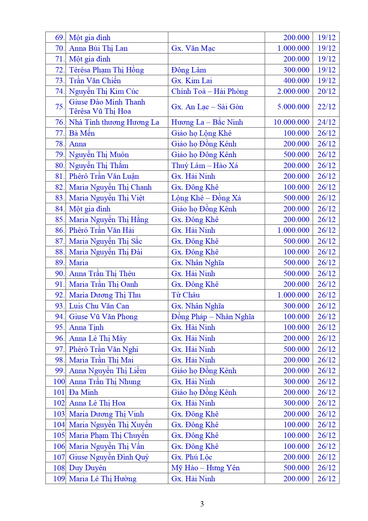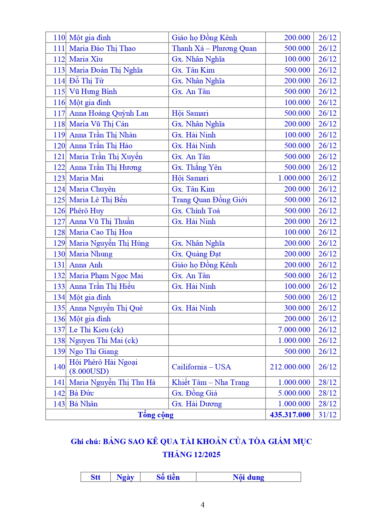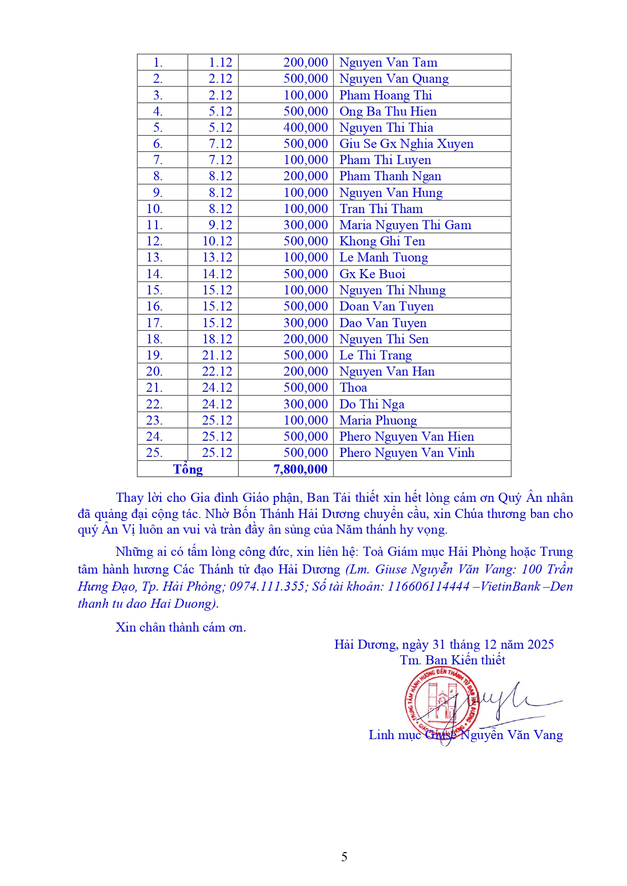 Danh sách công đức xây dựng Đền Thánh Tử Đạo Hải Dương - Tháng 12 năm 2025