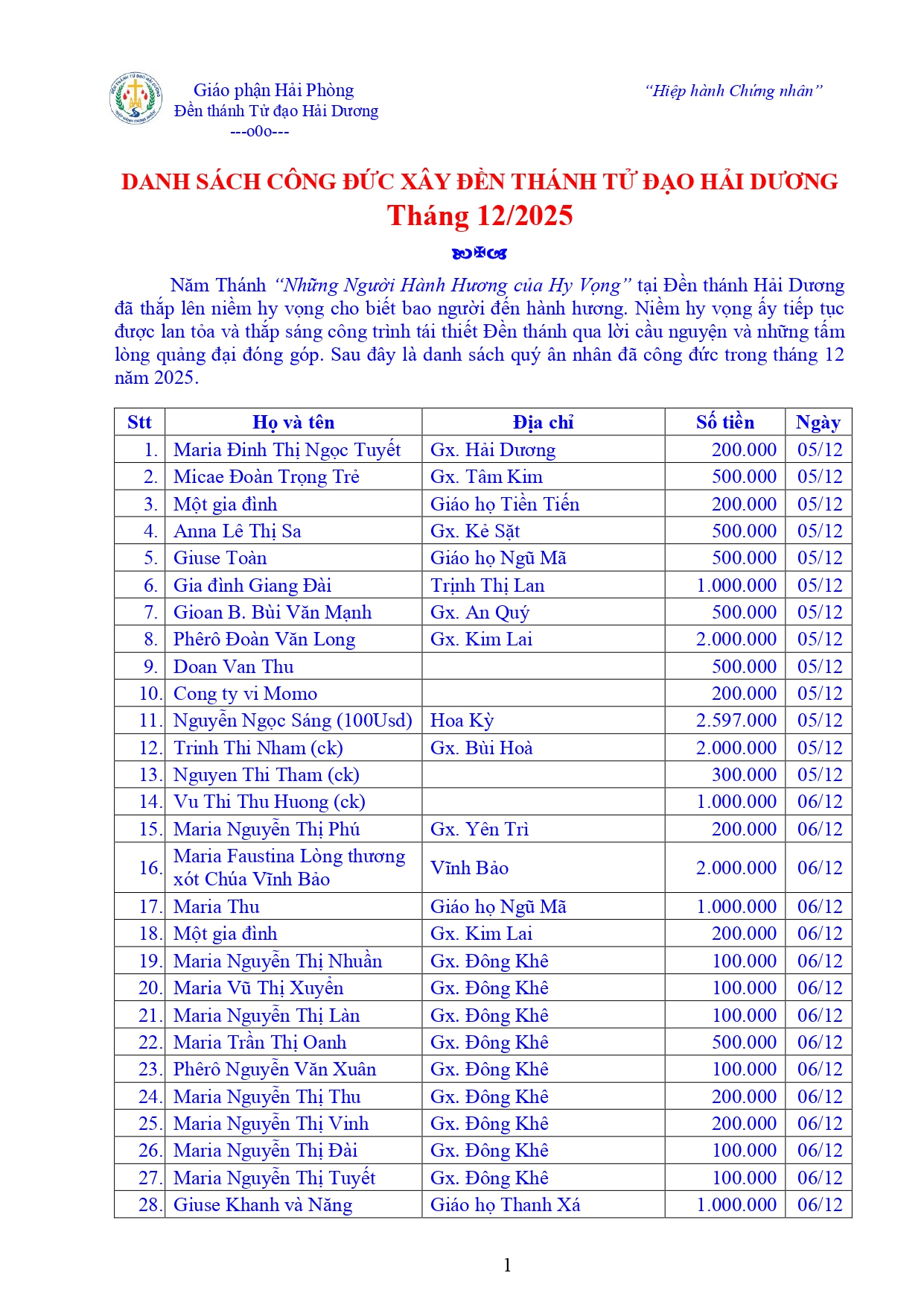 Lối sống Hiệp hành mà Giáo Hội mời gọi đang được thể hiện cách sống động nơi linh địa Hải Dương. Dòng người hành hương tuôn về cùng với những tấm lòng quảng đại dâng cúng góp phần tái thiết Đền thánh đã nói lên tinh thần ấy. Dưới đây là danh sách quý ân nhân đã ủng hộ chương trình tái thiết Đền thánh trong tháng 12/2025