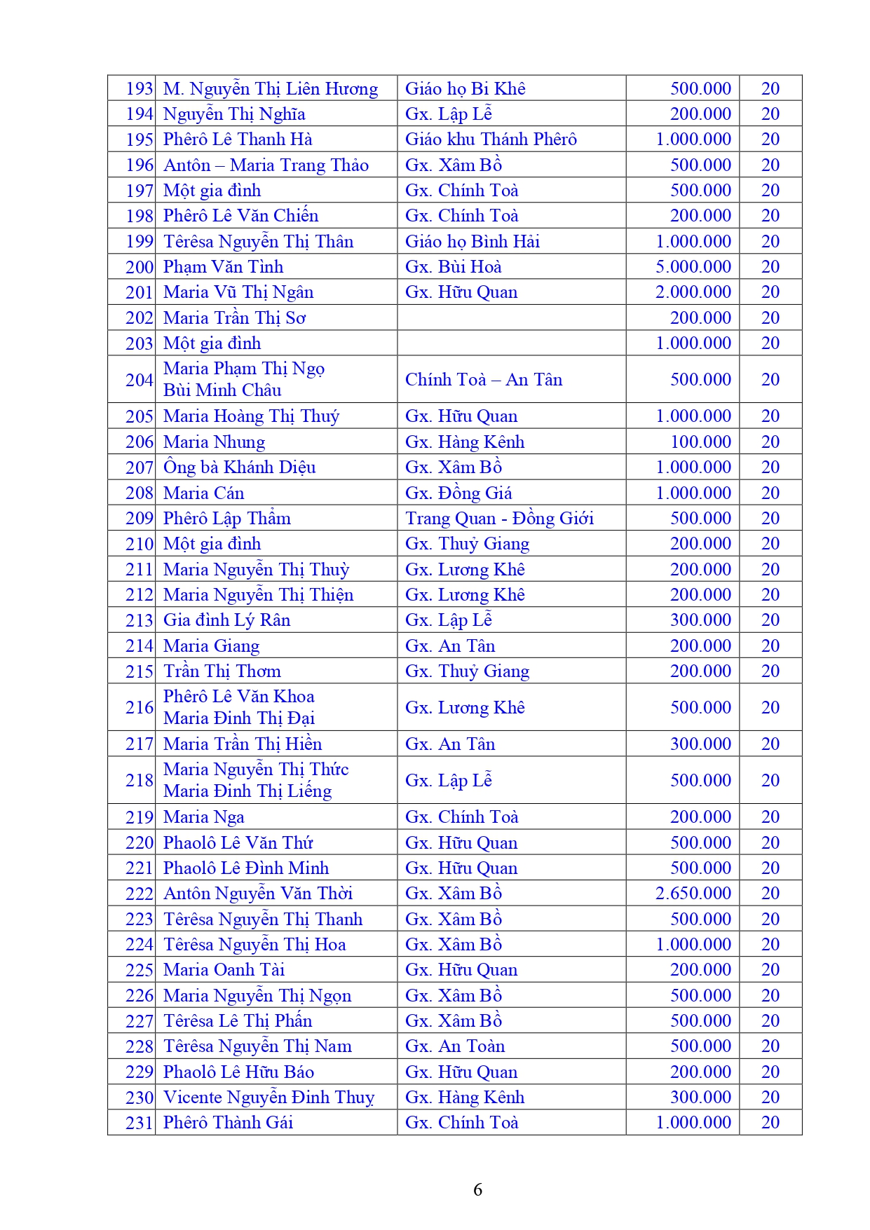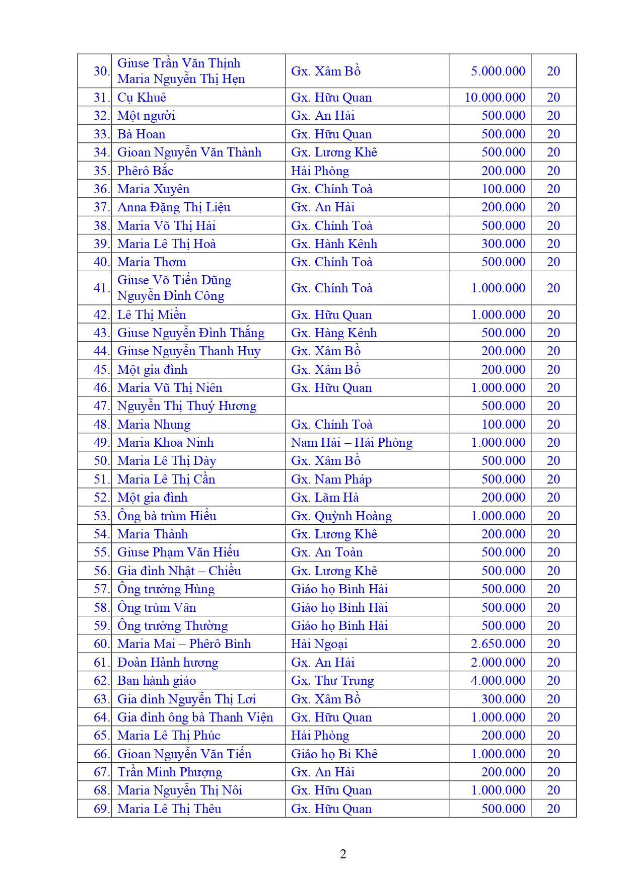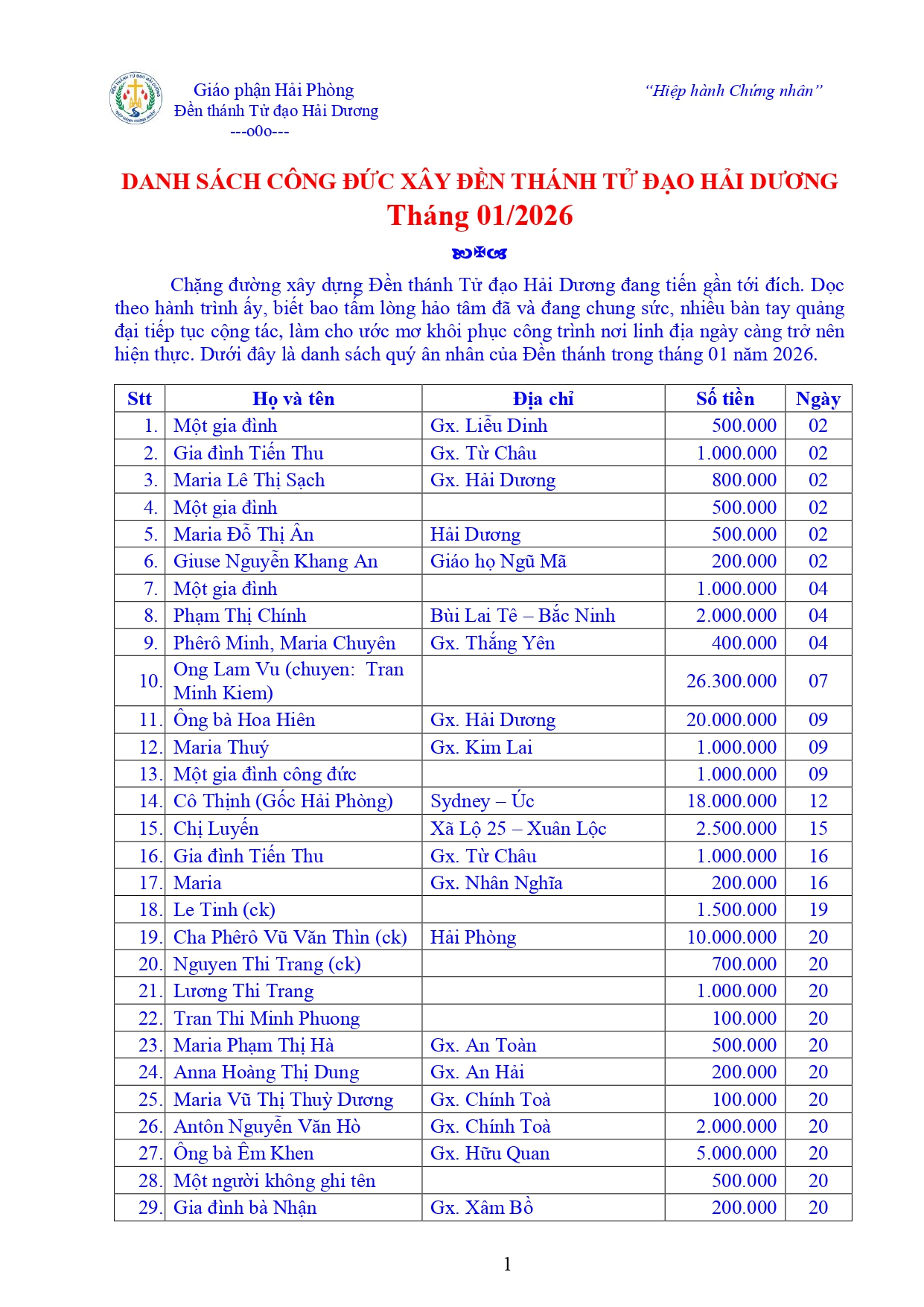 Danh sách Công đức xây dựng Đền Thánh Tử Đạo Hải Dương - Tháng 01 năm 2026