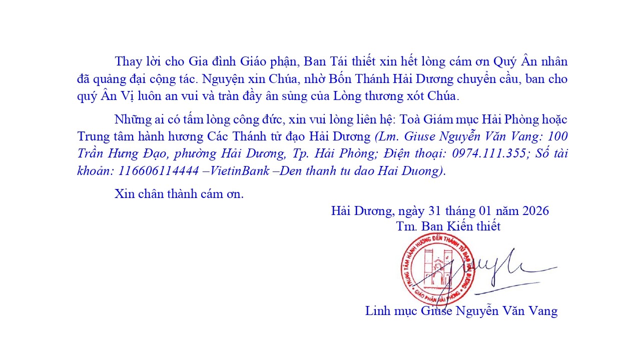 Chặng đường xây dựng Đền thánh Tử đạo Hải Dương đang tiến gần tới đích. Dọc theo hành trình ấy, biết bao tấm lòng hảo tâm đã và đang chung sức, nhiều bàn tay quảng đại tiếp tục cộng tác, làm cho ước mơ khôi phục công trình nơi linh địa ngày càng trở nên hiện thực. Dưới đây là danh sách quý ân nhân của Đền thánh trong tháng 01 năm 2026.