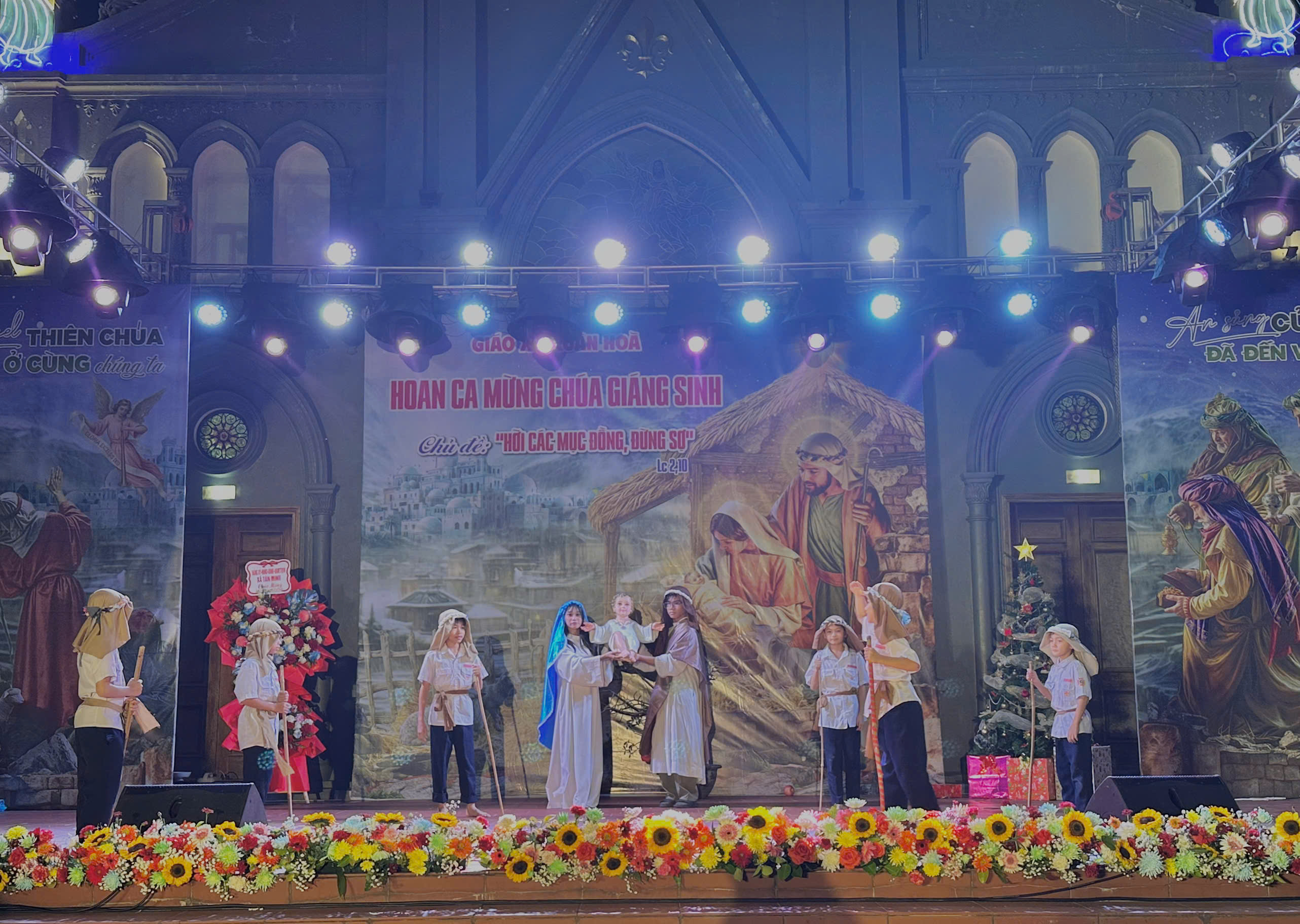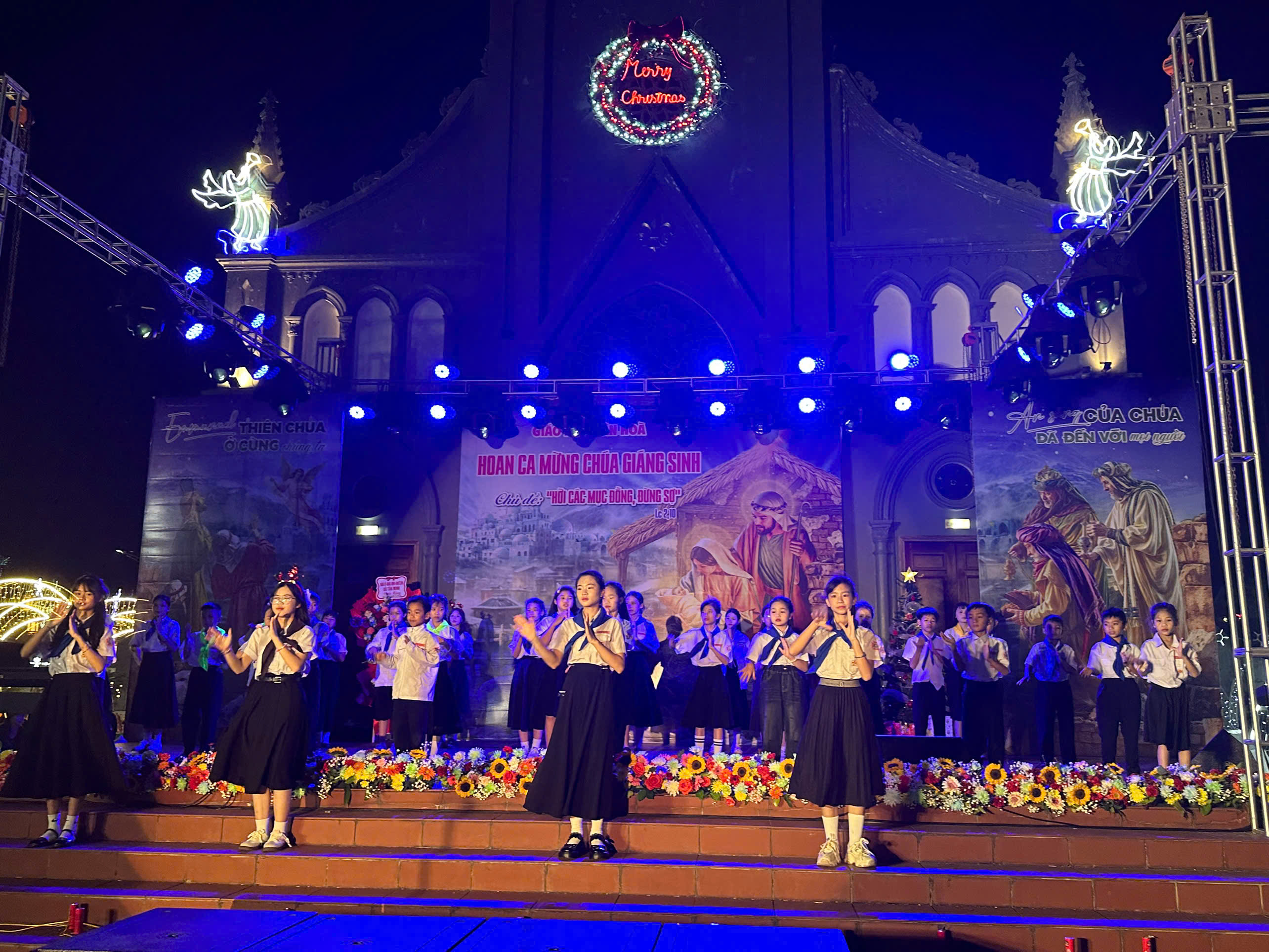 Chương trình văn nghệ bắt đầu từ 19h30, biến khuôn viên giáo xứ thành một sân khấu rực rỡ sắc màu. Các tiết mục diễn nguyện và văn nghệ được dàn dựng công phu bởi chính những “diễn viên không chuyên” đến từ các hội đoàn trong giáo xứ, tái hiện sống động mầu nhiệm Giáng Sinh.