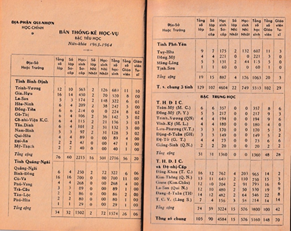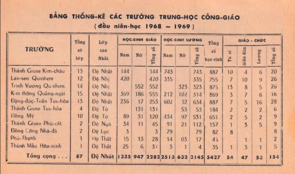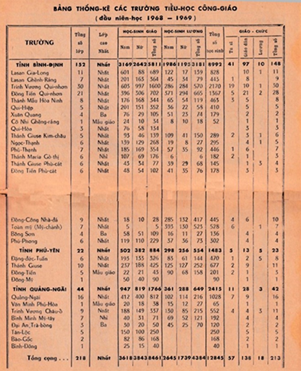 Sau khi tách Quảng Nam, Quảng Tín để thành lập giáo phận Đà Nẵng, giáo phận Qui Nhơn còn lại ba tỉnh Quảng Ngãi, Bình Định, Phú Yên. Bản thống kê học vụ niên khóa 1963-1964 của giáo phận: