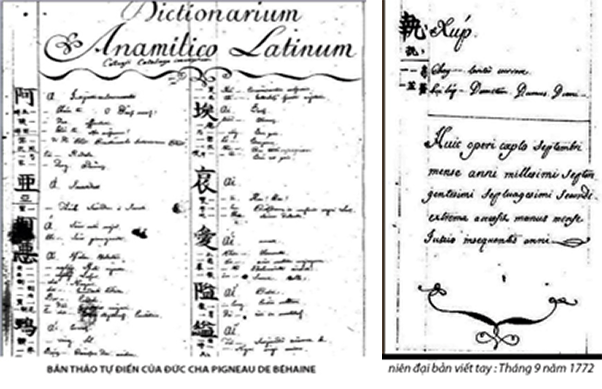 Hơn 100 năm sau kể từ khi cha Đắc Lộ xuất bản tự điển Việt-Bồ-La (1651), Đức cha Pigneau de Béhain, Giám mục Tông tòa Đàng Trong (1771-1779) đã soạn quyển tự điển “Anamitico-Latinum – Việt-La-tinh”. Bản gốc tự điển này chưa kịp xuất bản thì bị cháy vào năm 1778 trong vụ hỏa hoạn tại Chủng viện Truyền giáo Đàng Trong. Tuy nhiên, một bản viết tay của từ điển này có niên đại là năm 1772 may mắn được gìn giữ tại Văn khố của Hội Truyền giáo Nước ngoài Paris (MEP).
