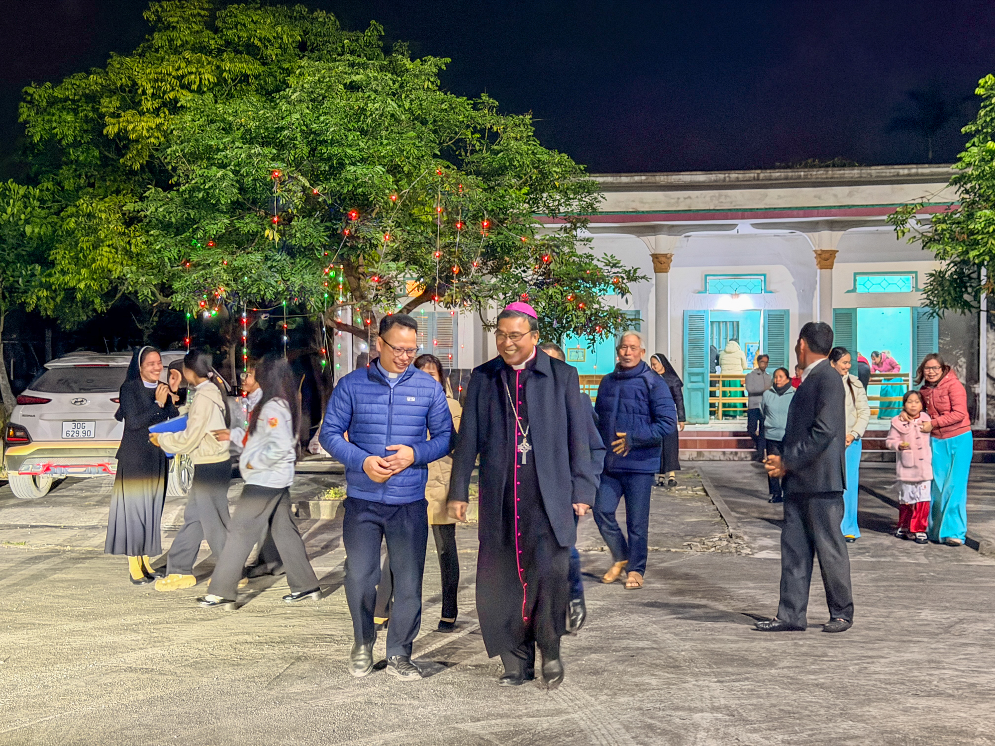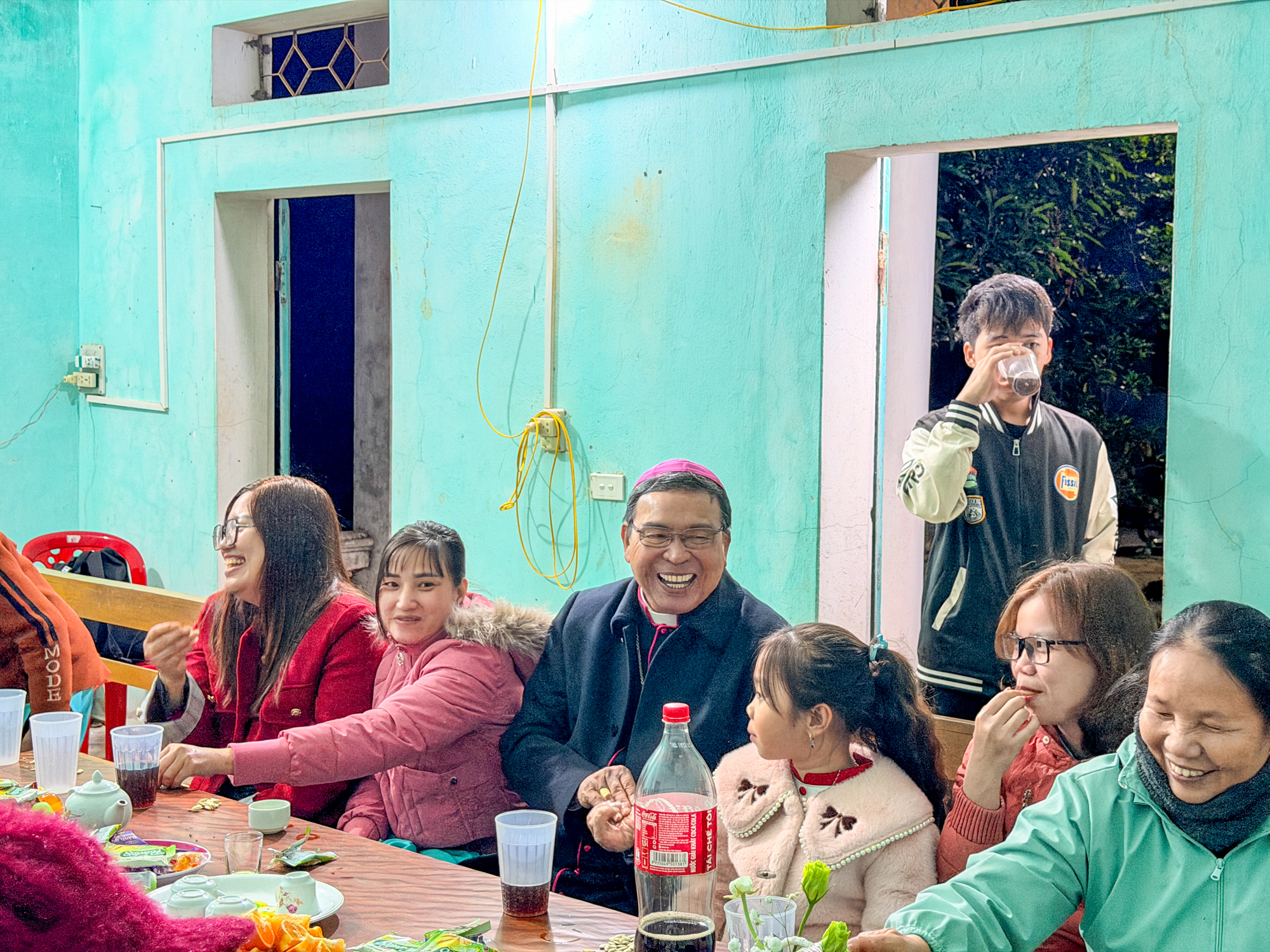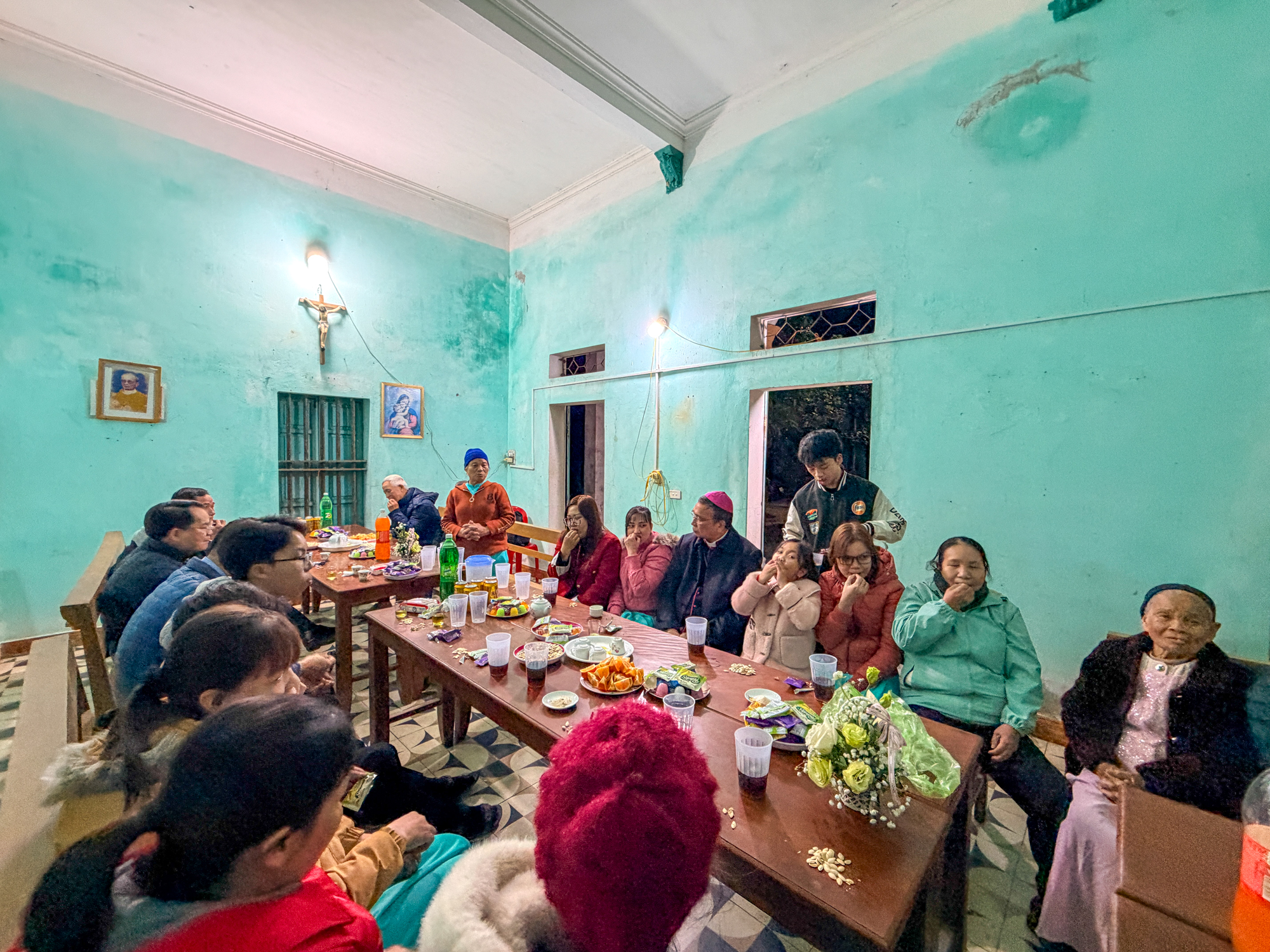 Sau Thánh lễ, Đức Cha và quý Cha cùng cộng đoàn quy tụ tại nhà phòng, chia sẻ ly nước thân tình, khép lại một buổi tối chan chứa tình Chúa và tình người.