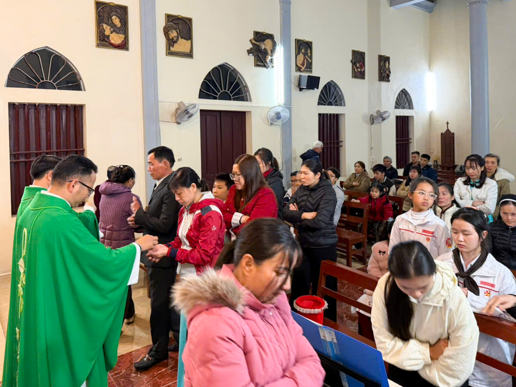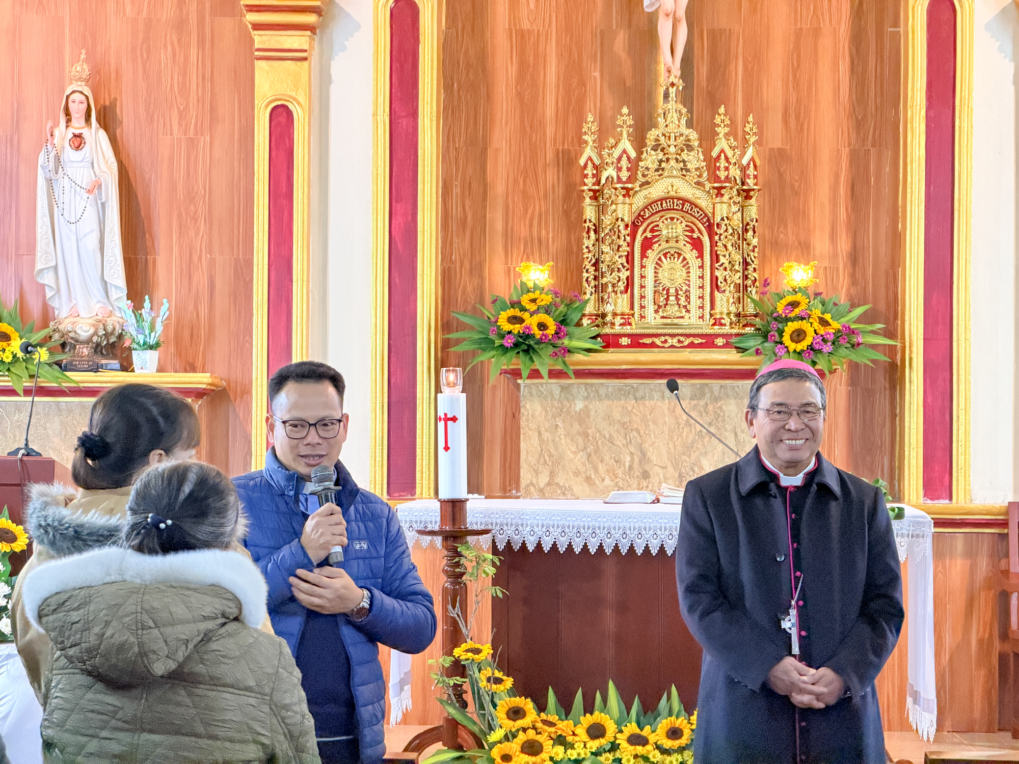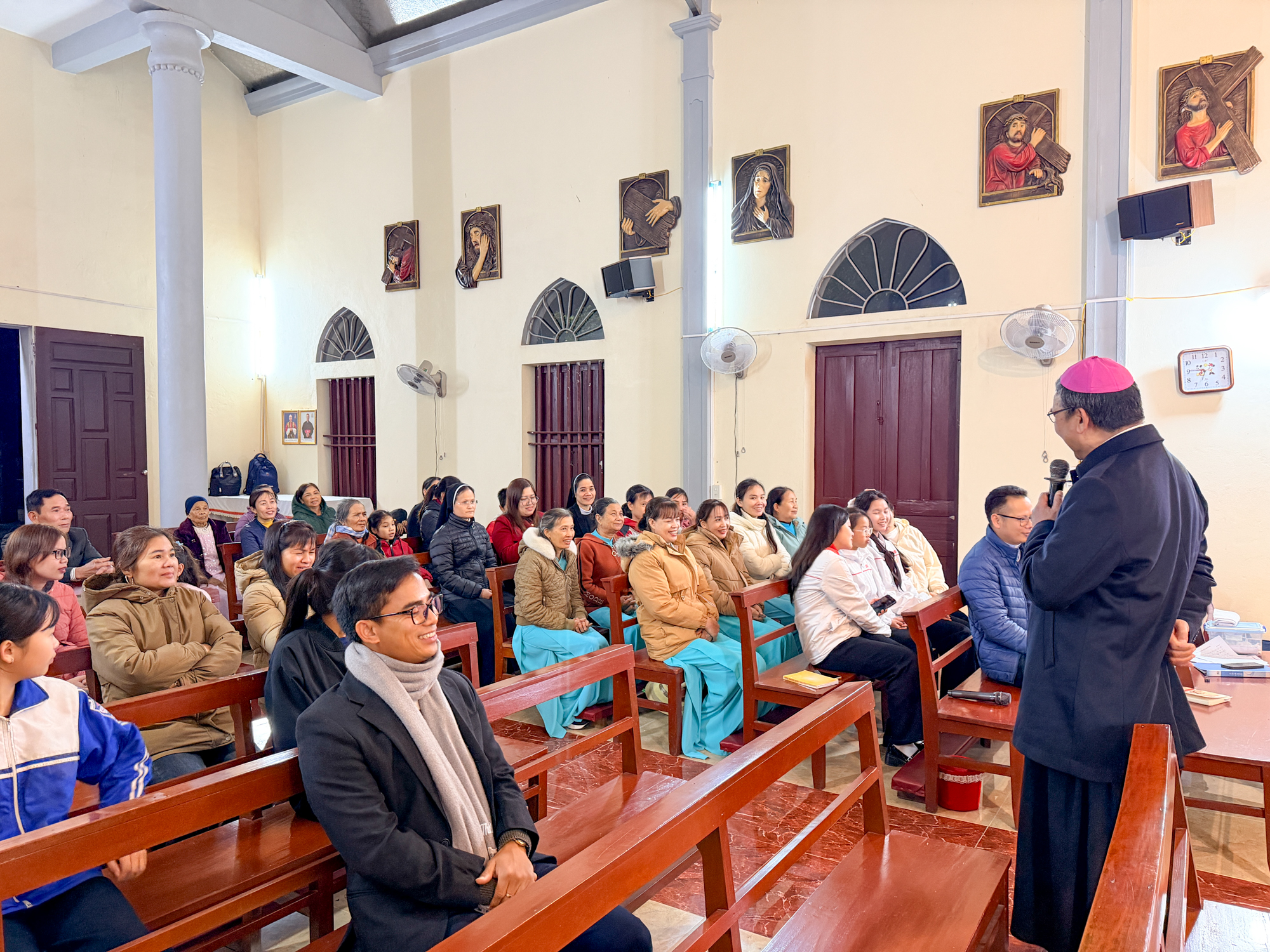 Trước Thánh lễ, Đức Cha đã dành thời gian gặp gỡ, thăm hỏi bà con giáo dân trong nhà thờ. Với tâm tình của người mục tử, Ngài lắng nghe những chia sẻ đơn sơ nhưng chan chứa đức tin của cộng đoàn – những người con bé nhỏ mà trung kiên giữa bao khó khăn, thử thách.