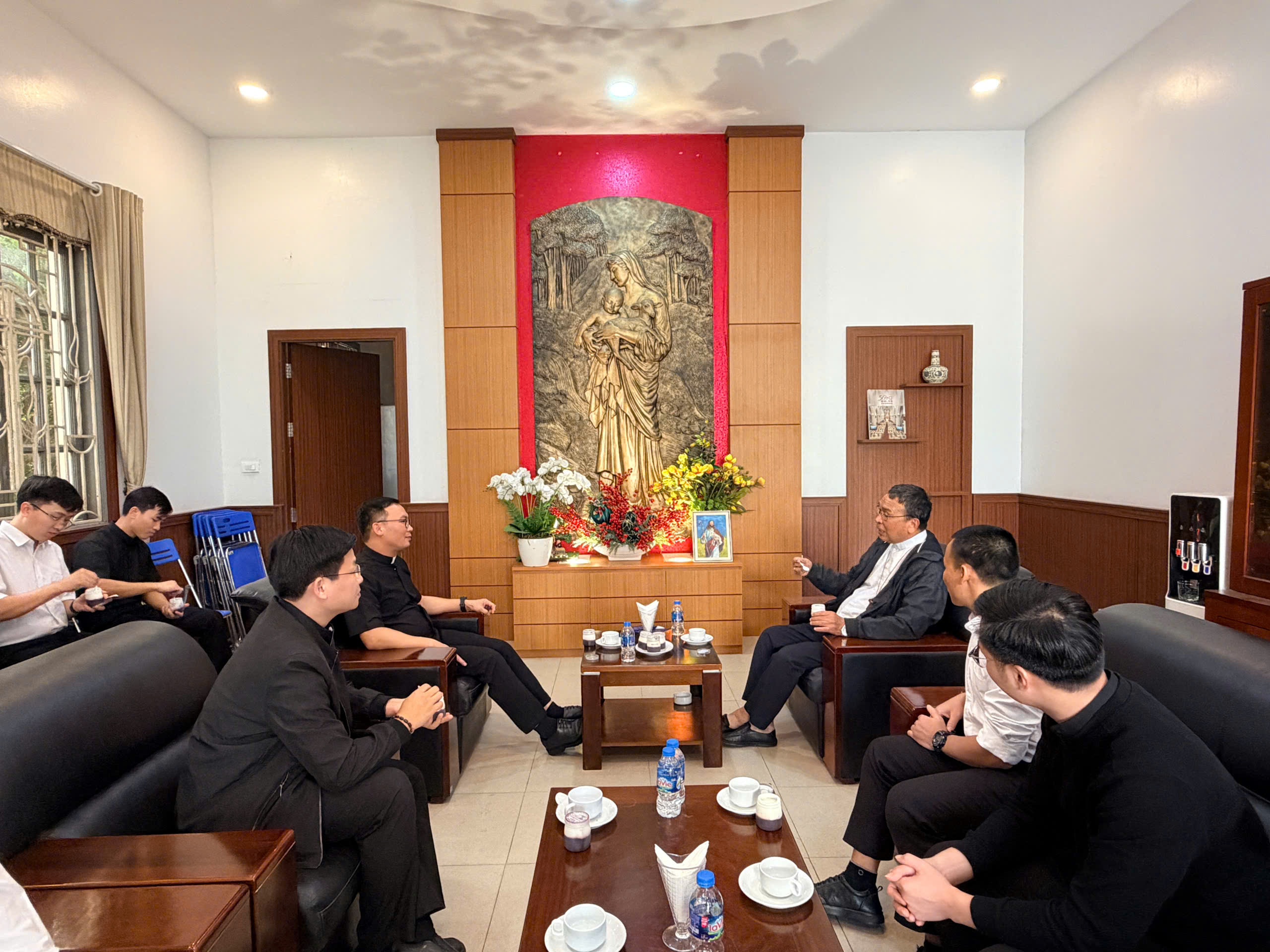 Khi Đức Cha tới nơi, Cha Giuse Nguyễn Anh Đua và quý Thầy Chủng sinh chào đón ngài trong bầu khí thân tình, ấm áp của gia đình chủng viện.
