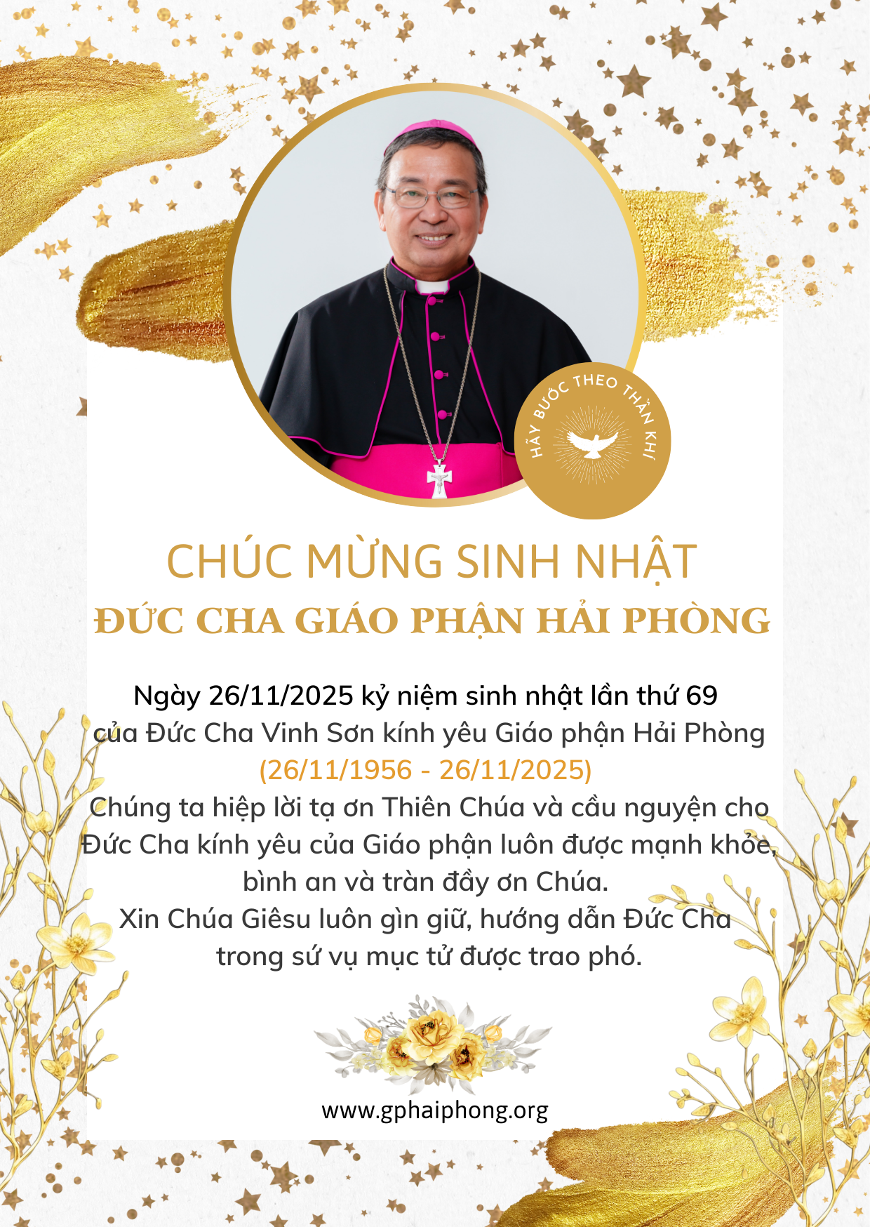 Ngày 26/11/2025 kỷ niệm sinh nhật lần thứ 69 của Đức Cha Vinh Sơn kính yêu Giáo phận Hải Phòng (26/11/1956 - 26/11/2025), chúng ta hiệp lời tạ ơn Thiên Chúa và cầu nguyện cho Đức Cha kính yêu của Giáo phận luôn được mạnh khỏe, bình an và tràn đầy ơn Chúa, xin Chúa Giêsu luôn gìn giữ, hướng dẫn Đức Cha trong sứ vụ mục tử được trao phó.