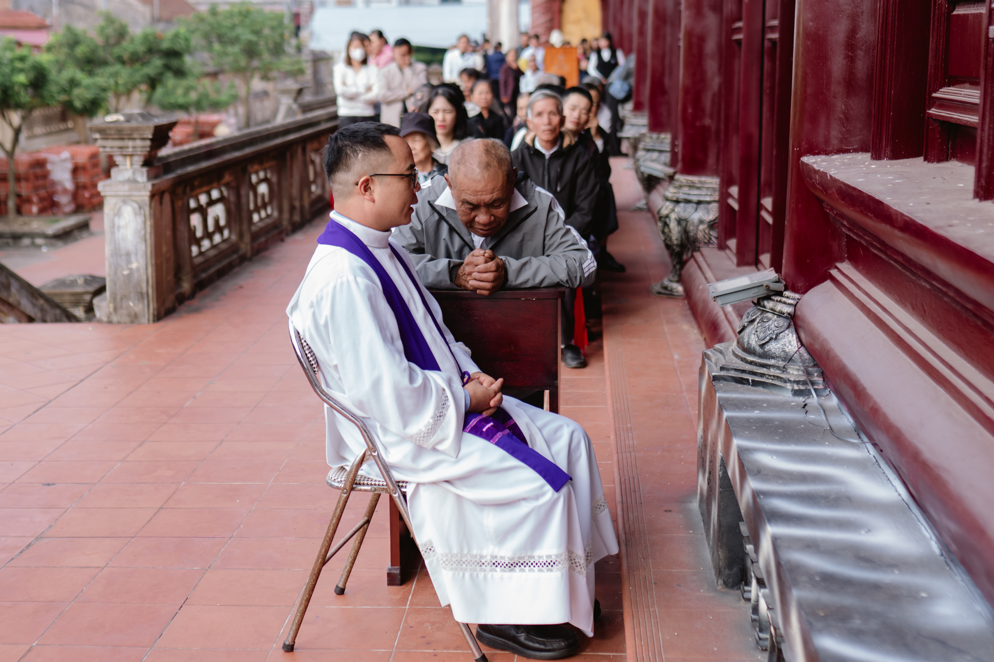 Ngay từ sớm, bà con giáo dân đã trở về Đền thánh Đức Mẹ Mân Côi Nam Am. Sau những giây phút hồi tâm, cộng đoàn cùng nhau đón nhận Bí tích Hòa giải như một lộ trình trở về với Thiên Chúa để đón nhận ơn tha thứ.
