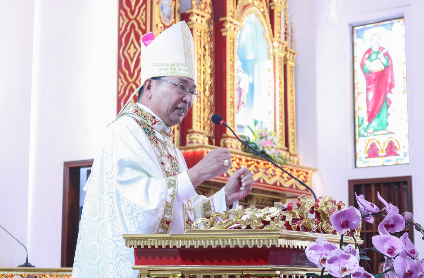 Trong phần giảng lễ, Đức Cha Vinh Sơn đã khai triển sâu sắc Lời Chúa trong bối cảnh của ngày lễ khánh thành và mừng kính Thánh Gioan Tông đồ. Ngài nhấn mạnh ý nghĩa của việc khánh thành ngôi thánh đường trong tuần Bát nhật Giáng Sinh – một niềm vui nhân đôi khi ánh sáng của Ngôi Lời nhập thể tiếp tục được chiếu tỏa nơi cộng đoàn An Khánh.