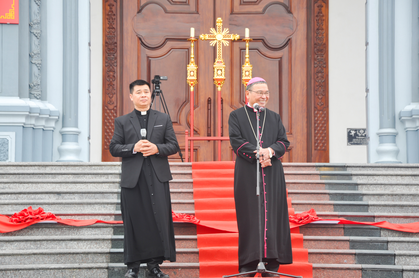 Đúng 9h30, nghi thức cắt băng khánh thành được cử hành trọng thể tại tiền sảnh nhà thờ. Đức Cha Giáo phận, Cha xứ hiện tại và Cha xứ tiền nhiệm cùng nhau thực hiện nghi thức trong tiếng vỗ tay hân hoan của cộng đoàn.