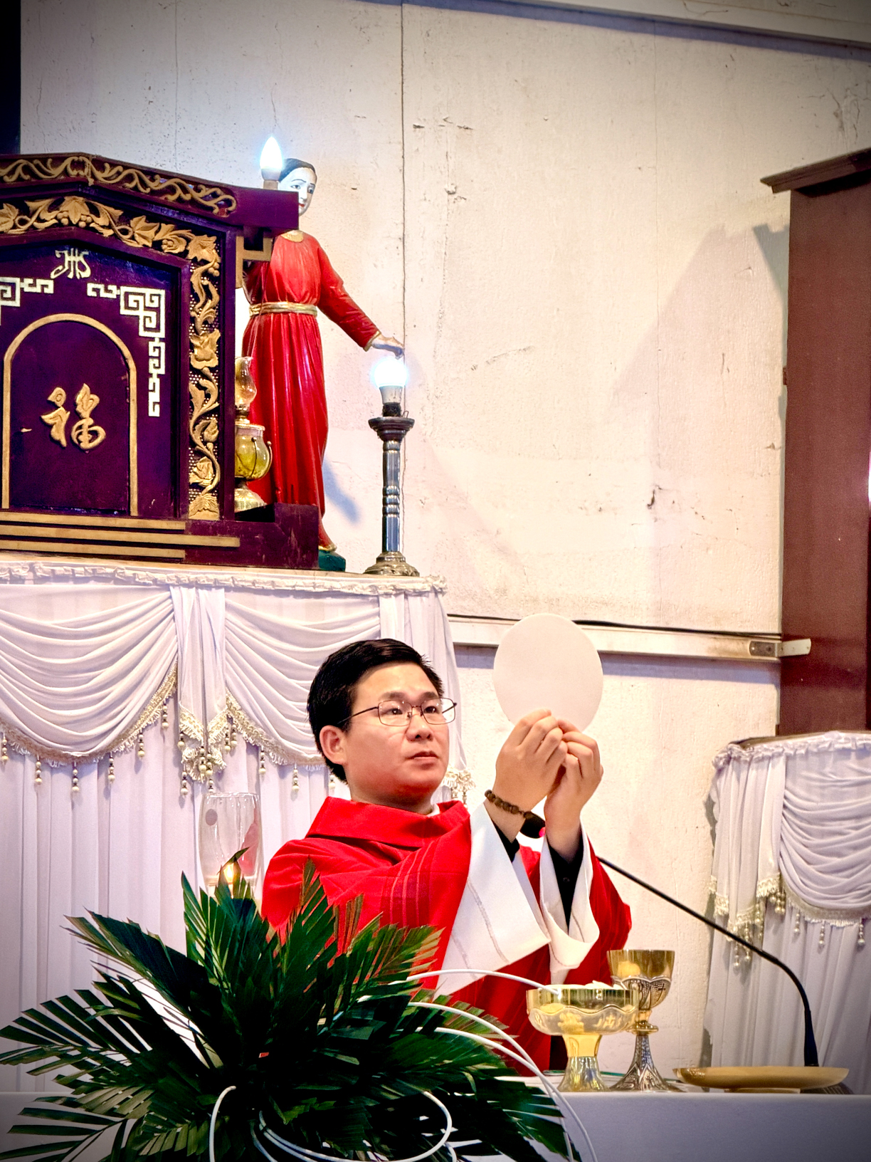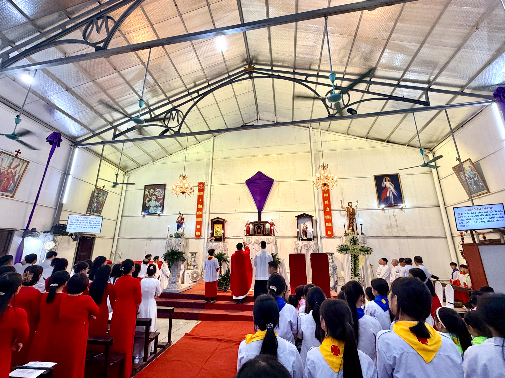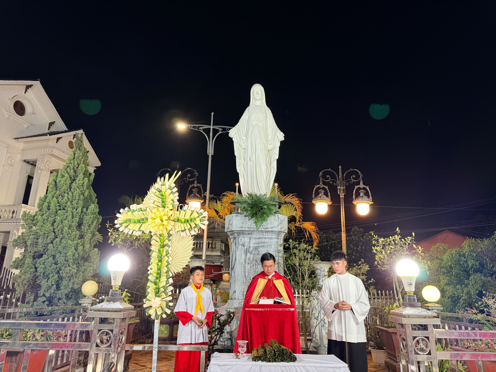 Mở đầu Thánh lễ, cha chủ sự Phêrô đã cùng cộng đoàn quy tụ tại tượng đài Đức Mẹ để cử hành nghi thức làm phép lá. Trong bầu khí trang nghiêm, cộng đoàn lắng nghe Tin Mừng thuật lại việc Chúa Giêsu tiến vào thành Giêrusalem giữa tiếng tung hô “Con Vua Đavít”. Cuộc rước lá sau đó diễn ra long trọng tiến vào nhà nguyện tạm, nơi cộng đoàn hiệp dâng Thánh lễ.