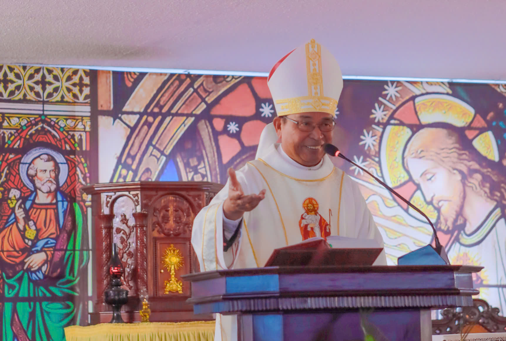 Mở đầu Thánh lễ, Đức cha bày tỏ niềm vui khi được hiện diện nơi vùng đất xa xôi này để cùng cộng đoàn mừng lễ Quan thầy. Ngài chúc mừng Giáo họ Móng Cái vì đã hoàn thiện phần tháp chuông – một dấu chỉ sống động của sự hiệp nhất và lòng nhiệt thành trong đức tin. Đức cha mời gọi mọi người tiếp tục cộng tác, đóng góp và cầu nguyện để sớm hoàn thiện toàn bộ ngôi Thánh đường.