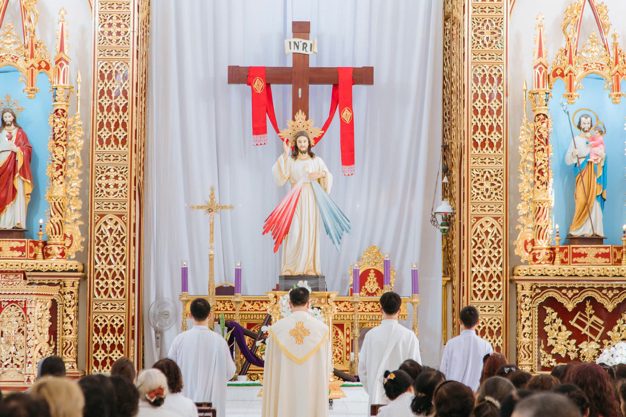 Đúng 15g00, Thánh lễ tôn vinh lòng Chúa thương xót do cha Giuse Dương Hữu Tình chủ sự. Cùng hiệp dâng trong Thánh lễ, có cha phó Giuse Phạm Quang Danh, quý tu sĩ, cùng đông đảo cộng đoàn dân Chúa.