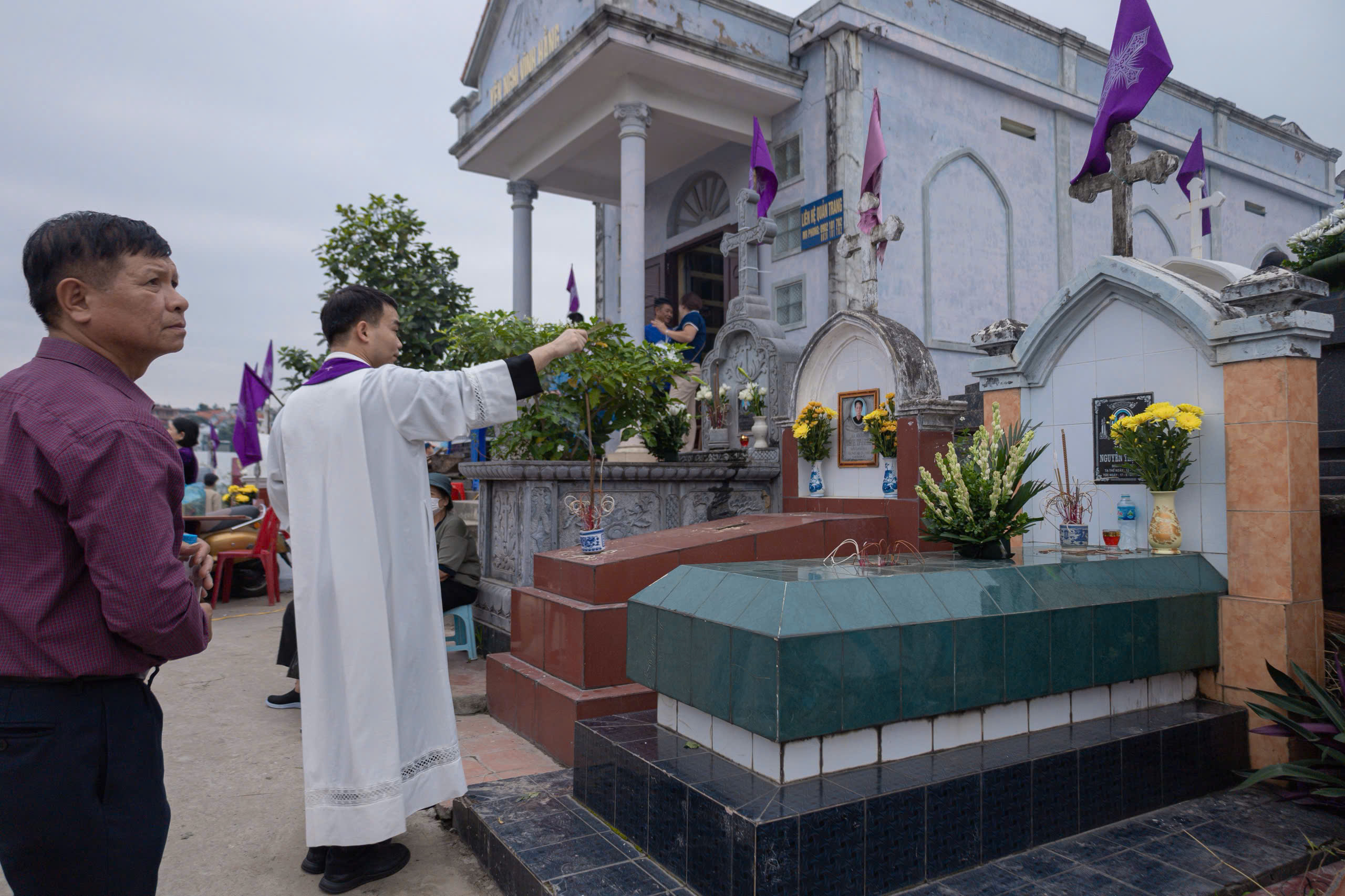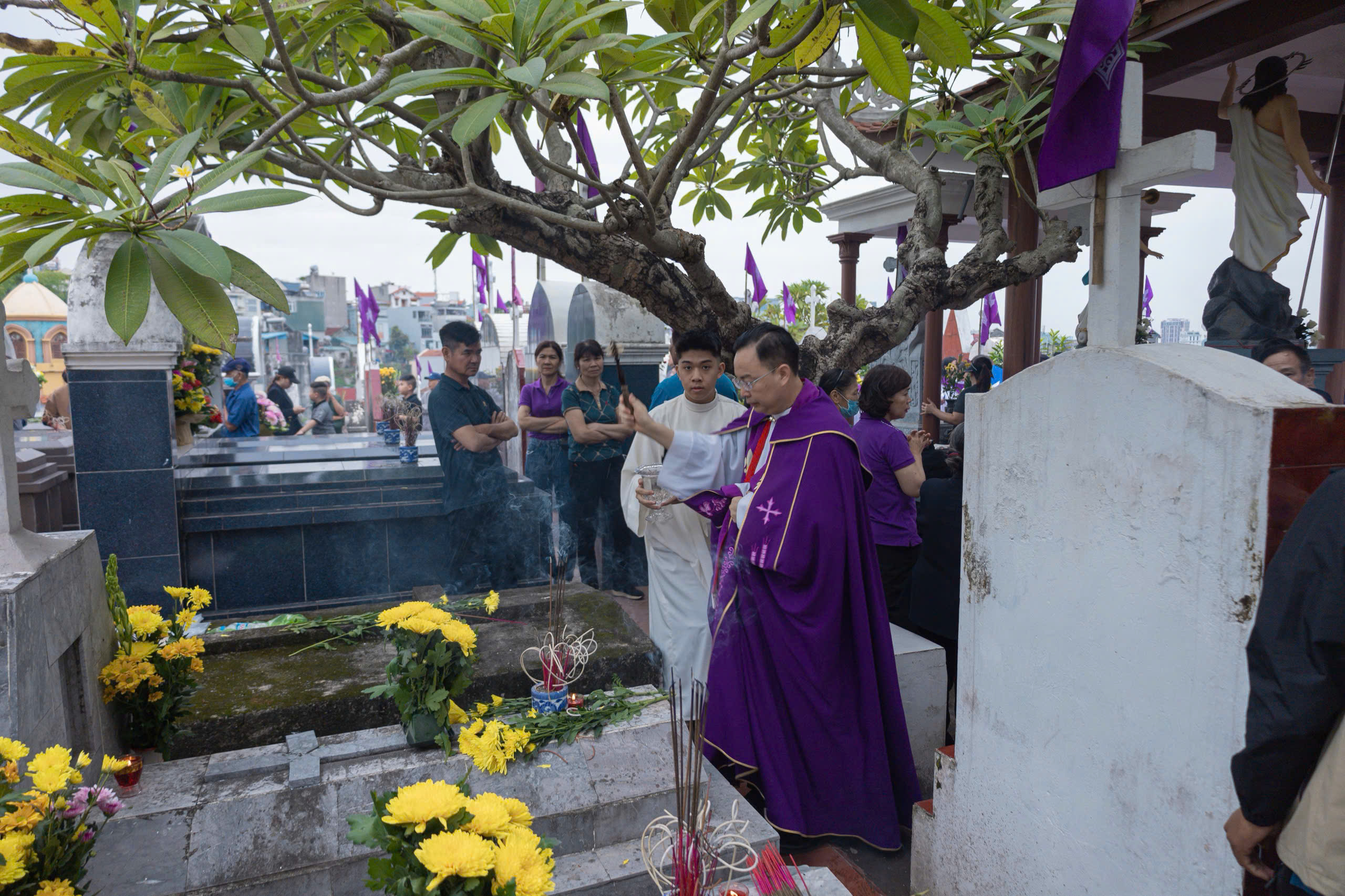 Sau Thánh Lễ, quý Cha đã đến từng phần mộ để rảy nước thánh, thánh hóa các ngôi mộ, như một cử chỉ đầy yêu thương và hiệp thông trong Đức Kitô Phục Sinh.