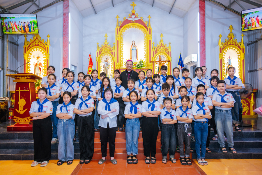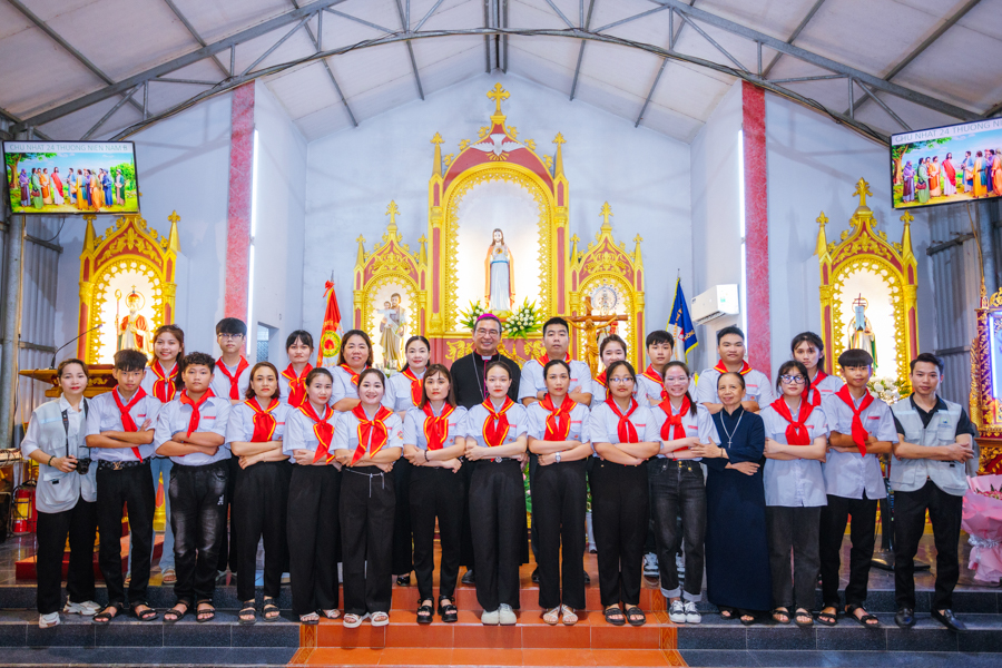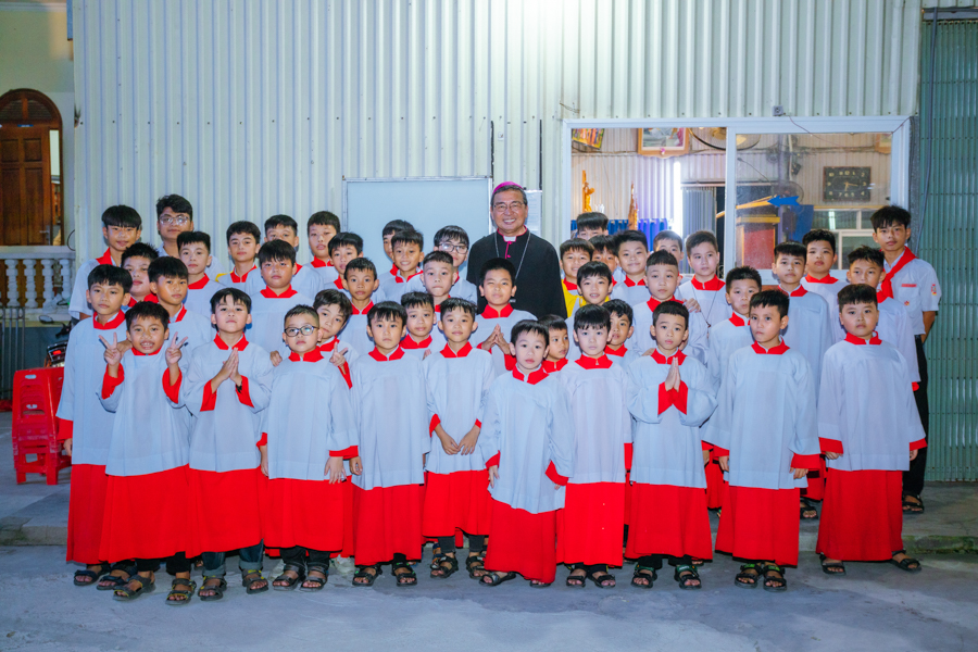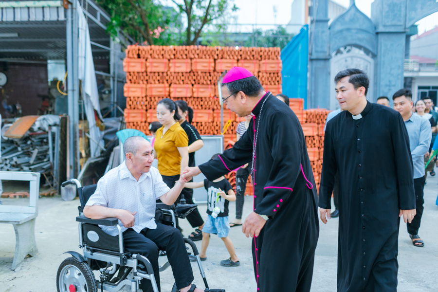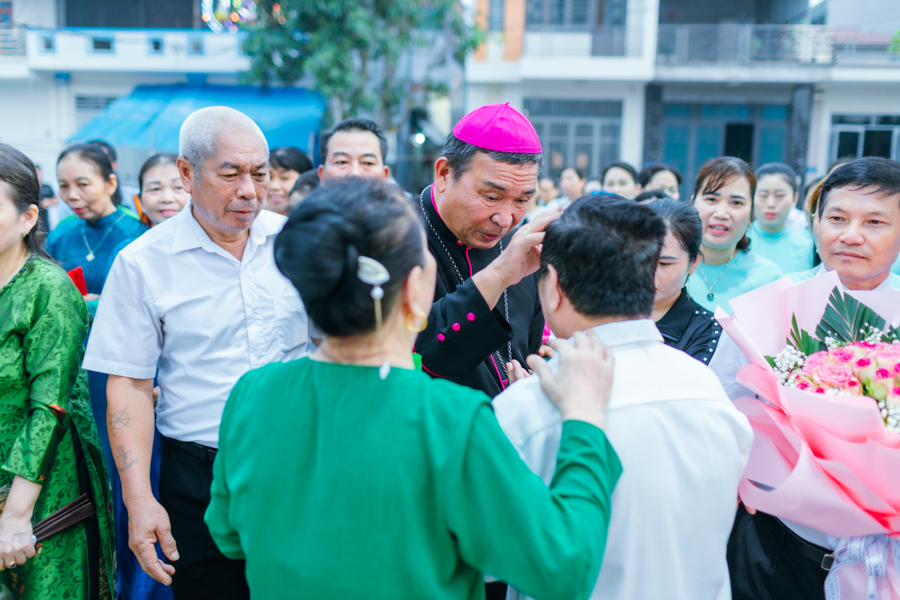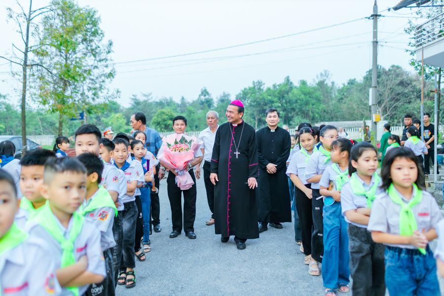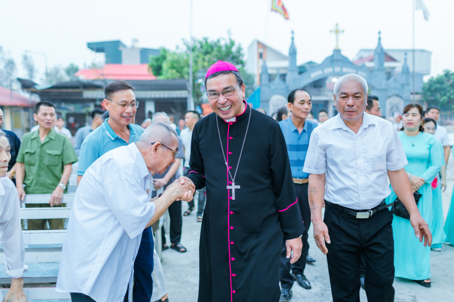 Đúng 18h00, Đức Cha Vinh sơn đặt chân đến mảnh đất Kim Lai thân thương trong sự chào đón nồng nhiệt của cộng đoàn giáo xứ.
