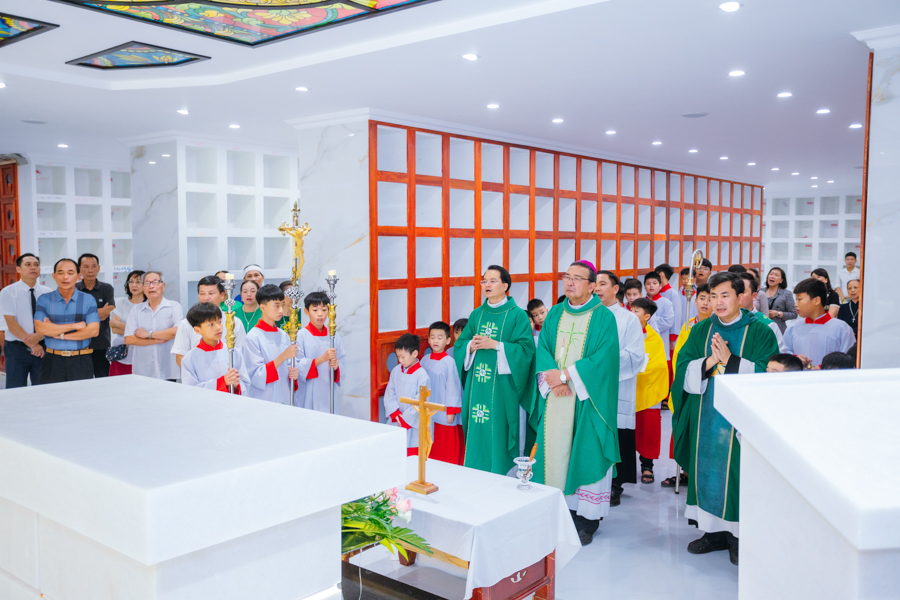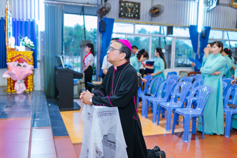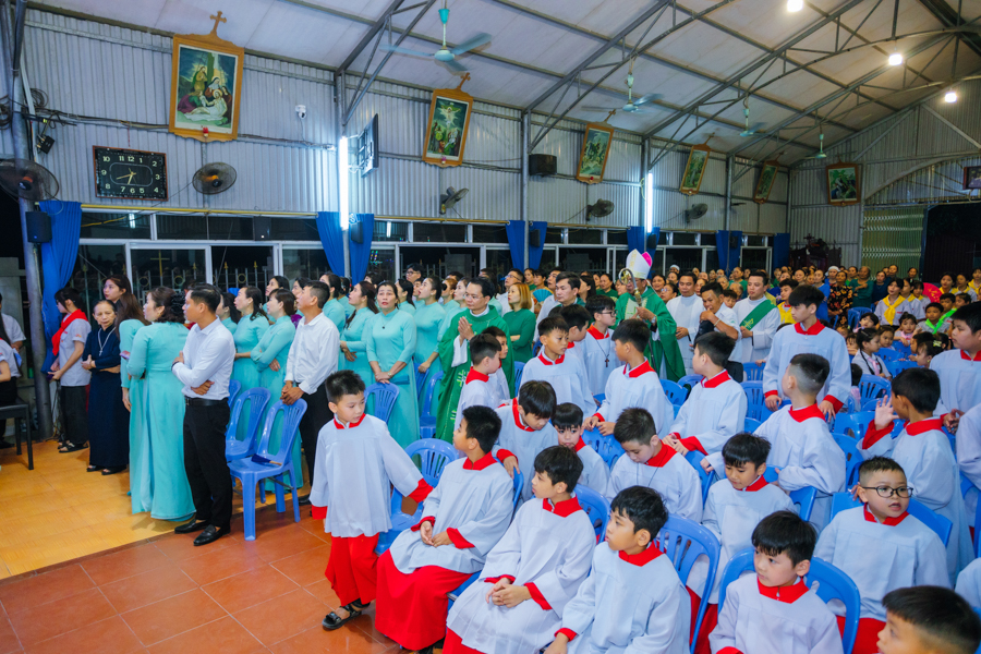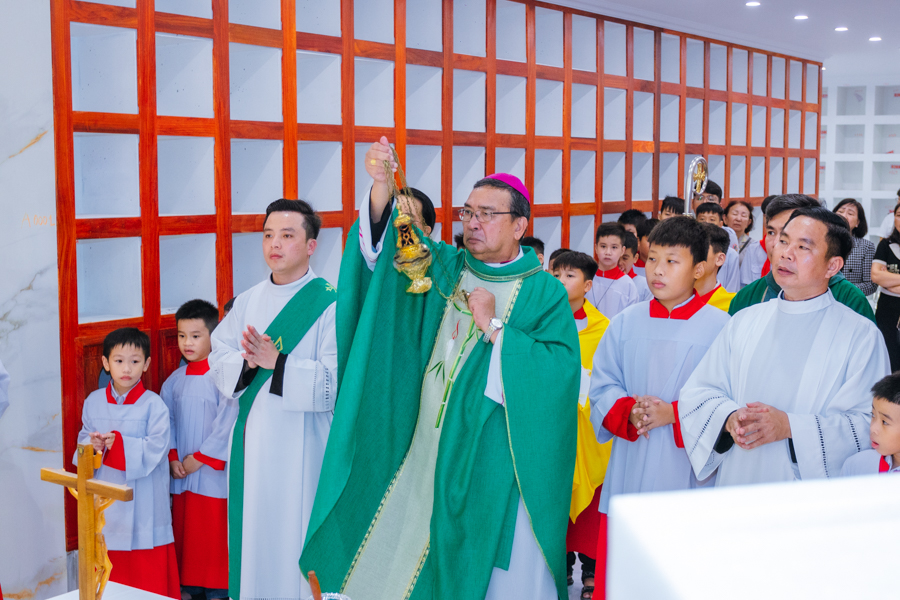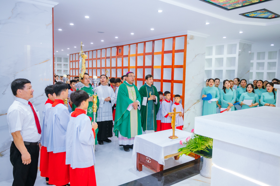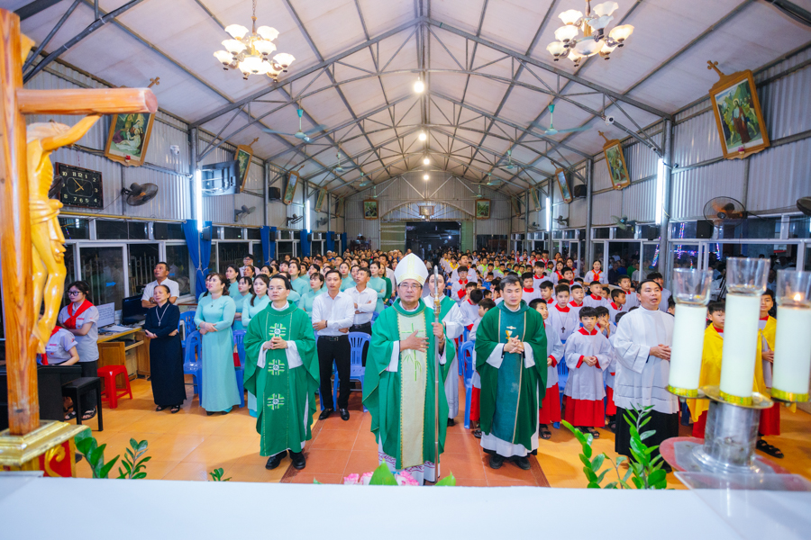 Kết thúc nghi thức, đoàn rước tiến vào nhà thờ để tham dự Thánh lễ tạ ơn. Đồng tế với Đức cha có sự hiện diện của cha xứ Đaminh và cha Thư ký Tòa giám mục.