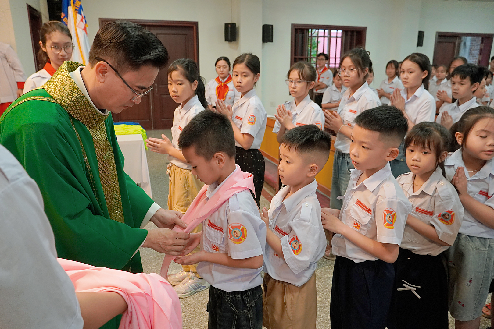Sau bài giảng, cha chủ sự nghi thức làm phép và trao khăn cho các em theo chương trình của Phong trào TNTT. Nghi thức gia nhập và nâng khăn trở thành dấu mốc trưởng thành, đồng thời cũng là lời nhắc nhở các em sống đúng tinh thần của Thiếu nhi Thánh Thể trong đời sống hằng ngày.