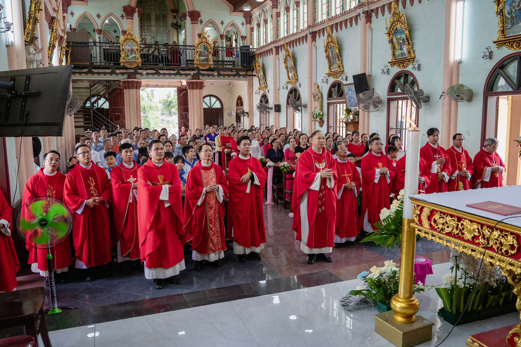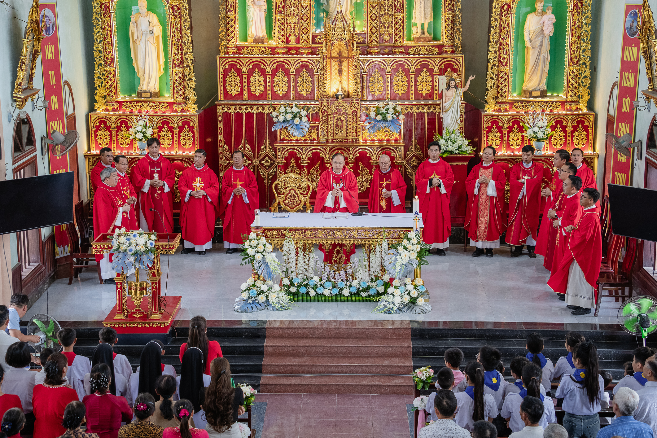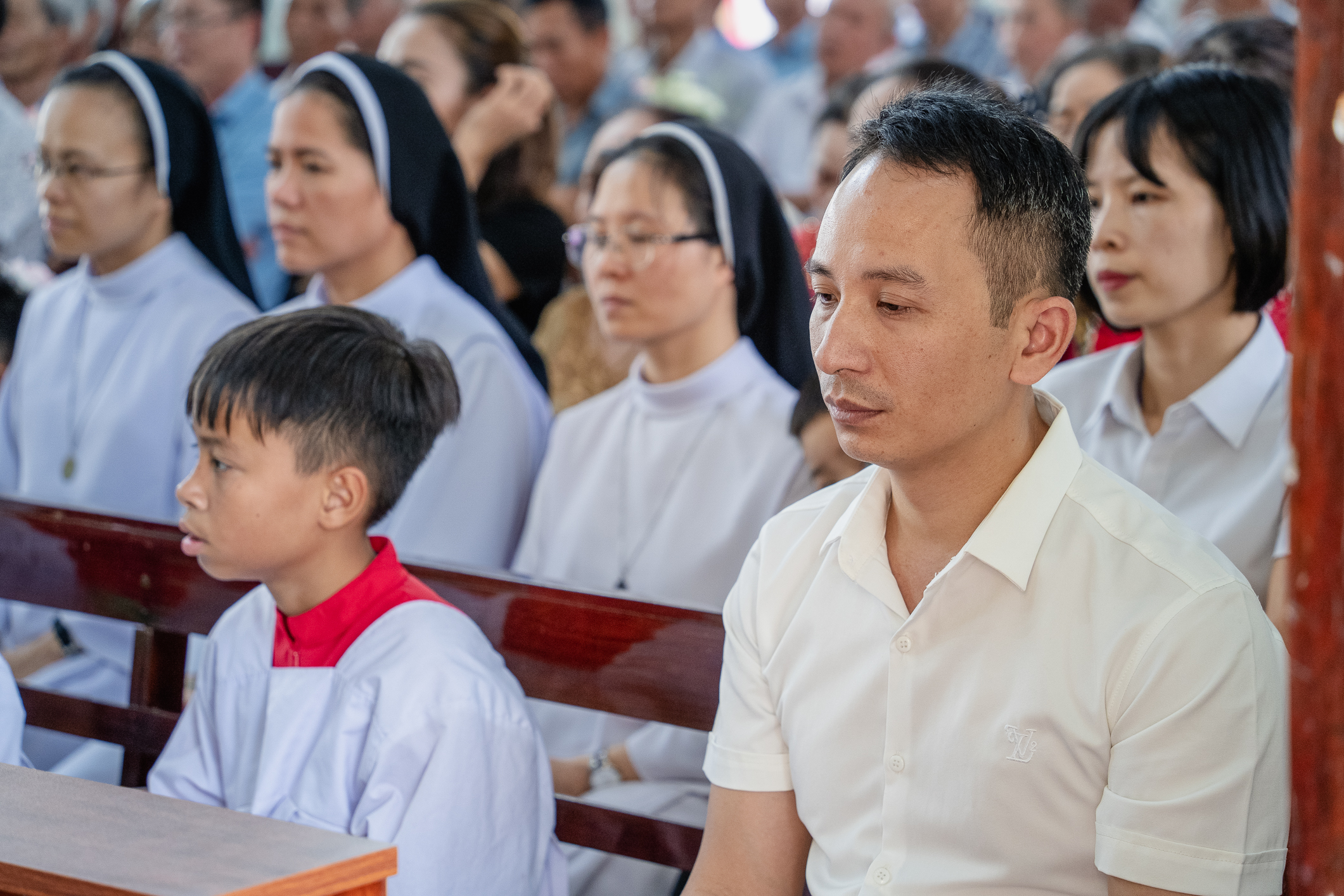 Đúng 9h30, cha Tổng Đại diện Phê-rô đã cử hành nghi thức làm phép thánh hoá ngôi nhà mục vụ của giáo xứ. Sau đó, đoàn đồng tế tiền vào thành đường để hiệp dâng thánh lễ tạ ơn.