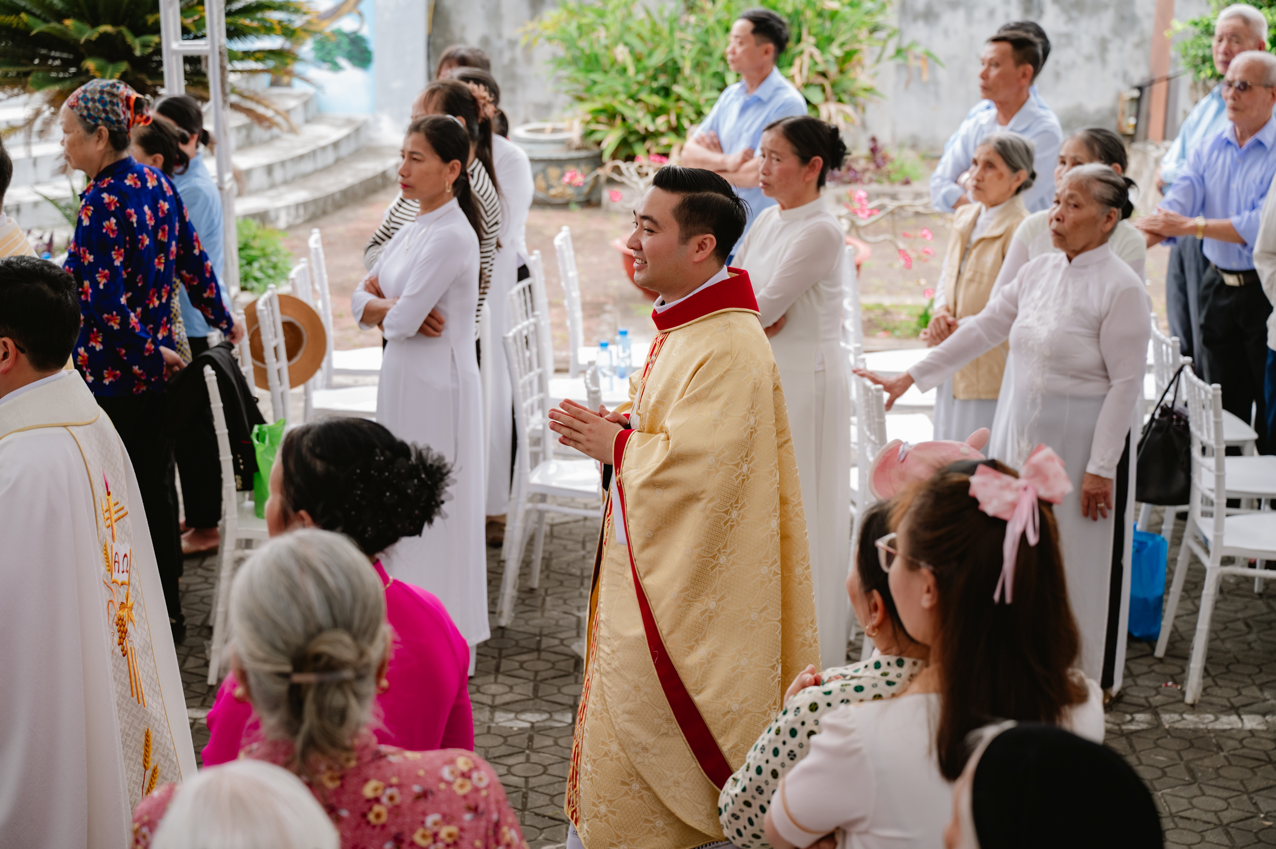 Trước thánh lễ, Tân Linh mục được đón nhận những lẵng hoa chúc mừng của các hội đoàn trong và ngoài giáo xứ, cùng đông đảo quan khách. Trong niềm vui ấy, ngài mời gọi cộng đoàn cùng hiệp ý dâng lời tạ ơn Thiên Chúa vì hồng ân được gọi và chọn làm linh mục, đồng thời tha thiết xin mọi người hiệp lời cầu nguyện cho các bậc tiền nhân.