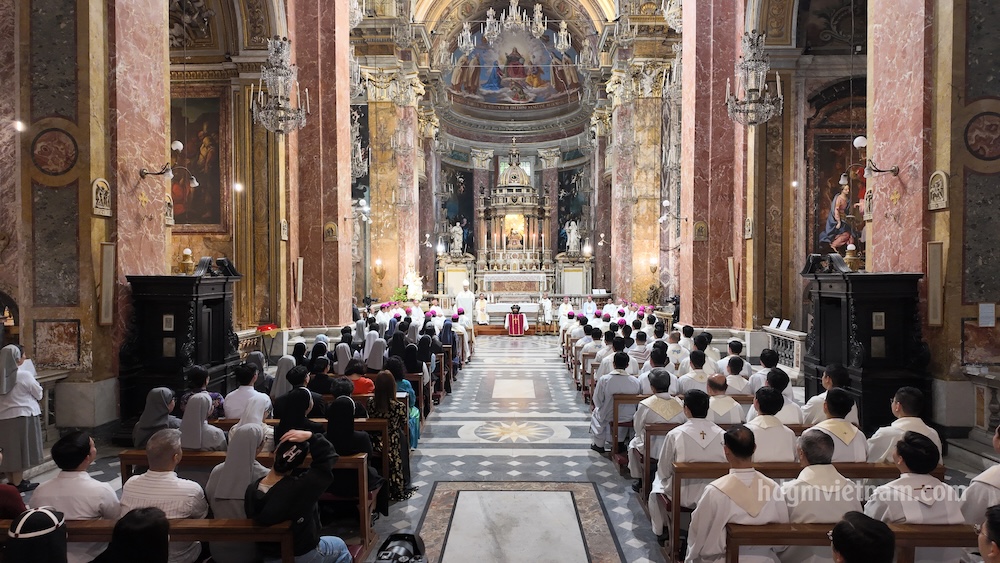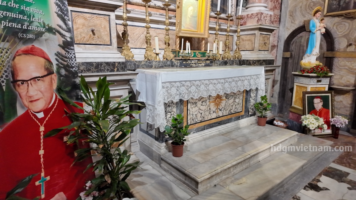 Vào lúc 17h00 theo giờ Roma, HĐGMVN đã dâng thánh lễ cầu nguyện cho Đấng đáng kính Đức Hồng y Phanxicô Xaviê Nguyễn Văn Thuận tại nhà thờ Santa Maria della Scala, nơi có phần mộ của Đức Hồng Y. Cùng tham dự có quý cha, tu sĩ nam nữ và anh chị em giáo dân đang học tập và làm việc tại Roma. Thánh lễ do Đức cha Matthêô Nguyễn Văn Khôi, Giám mục Giáo phận Qui Nhơn chủ tế. Trong phần giảng lễ, khởi đi từ việc Đức Hồng y Phanxicô dâng thánh lễ trong ngục tù như bằng chứng sống động về lòng yêu mến thánh lễ và sống Thánh Thể. Đức Cha giảng lễ đã dẫn đưa cộng đoàn vào tìm hiểu các bài đọc Lời Chúa để thấy được tình yêu Thiên Chúa lớn lao thế nào khi Đức Giêsu đã trao ban chính mình làm lương thực nuôi sống con người. Thánh lễ diễn ra trong bầu khí trang nghiêm sốt sắng và được kết thúc bằng giờ viếng mộ Đấng Đáng kính Đức Hồng y Phanxicô Xaviê.