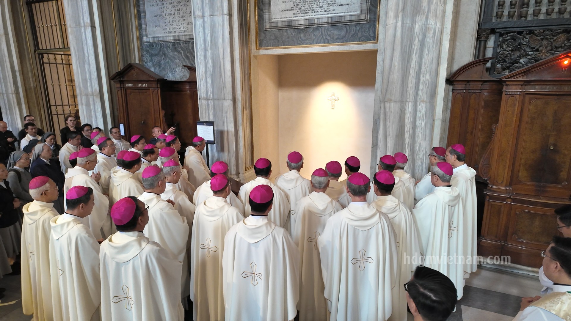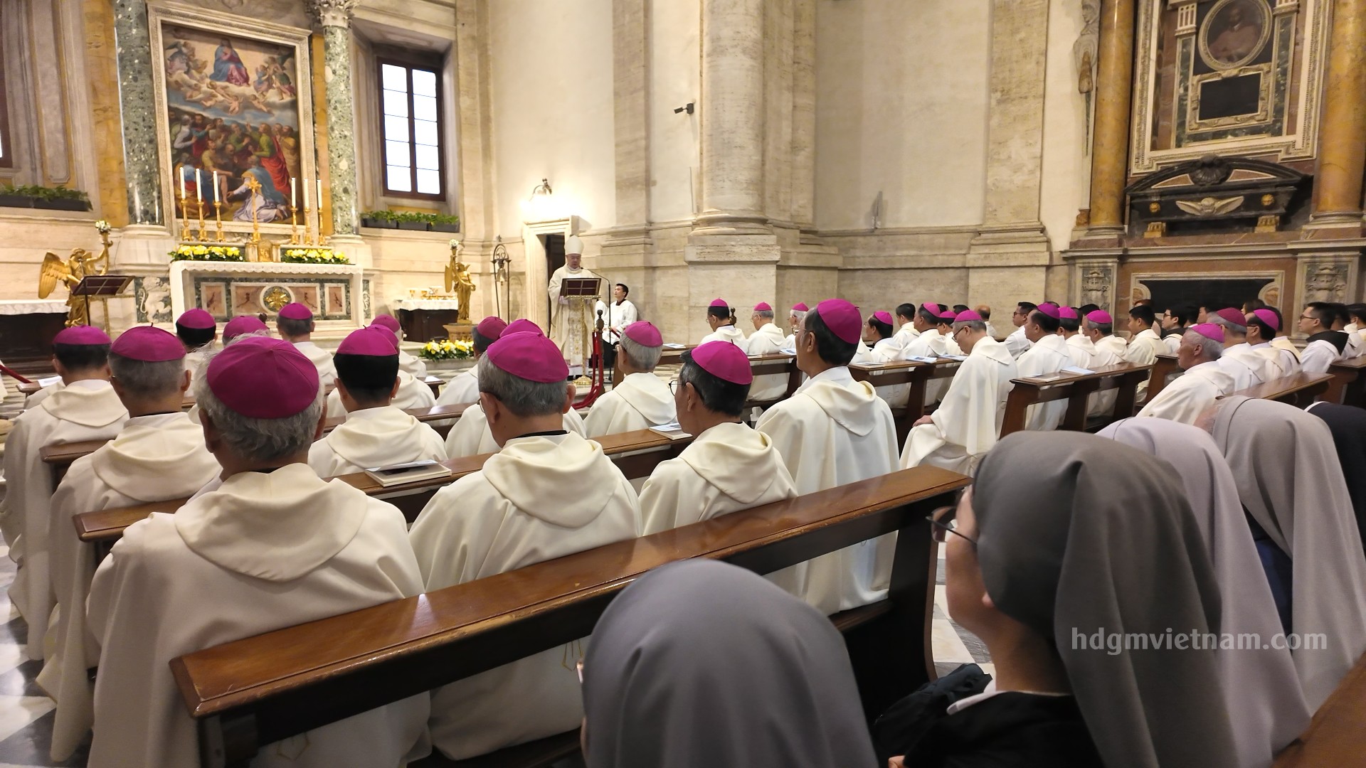 Vào lúc 5g00 sáng, các Đức Giám mục đã cùng nhau dành những giây phút tĩnh lặng hiệp thông bên Thánh Thể và cử hành giờ kinh Sáng tại nhà nguyện Foyer Phát Diệm. Sau giờ điểm tâm sáng, đoàn di chuyển đến Vương cung Thánh đường Đức Bà Cả và dâng thánh lễ cầu nguyện cho Giáo Hội hoàn vũ lúc 07g15. Thánh lễ được chủ tế bởi Đức cha Giuse Đặng Đức Ngân, Tổng Giám mục Tổng giáo phận Huế, có sự đồng tế của quý Đức cha HĐGMVN, quý linh mục đang học tập và phục vụ tại Rôma, và sự hiệp thông của quý tu sĩ nam nữ và anh chị em giáo dân.