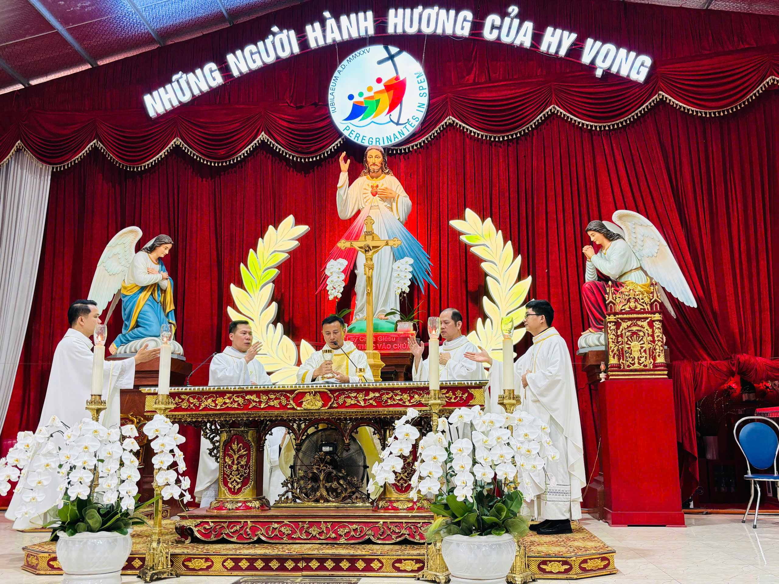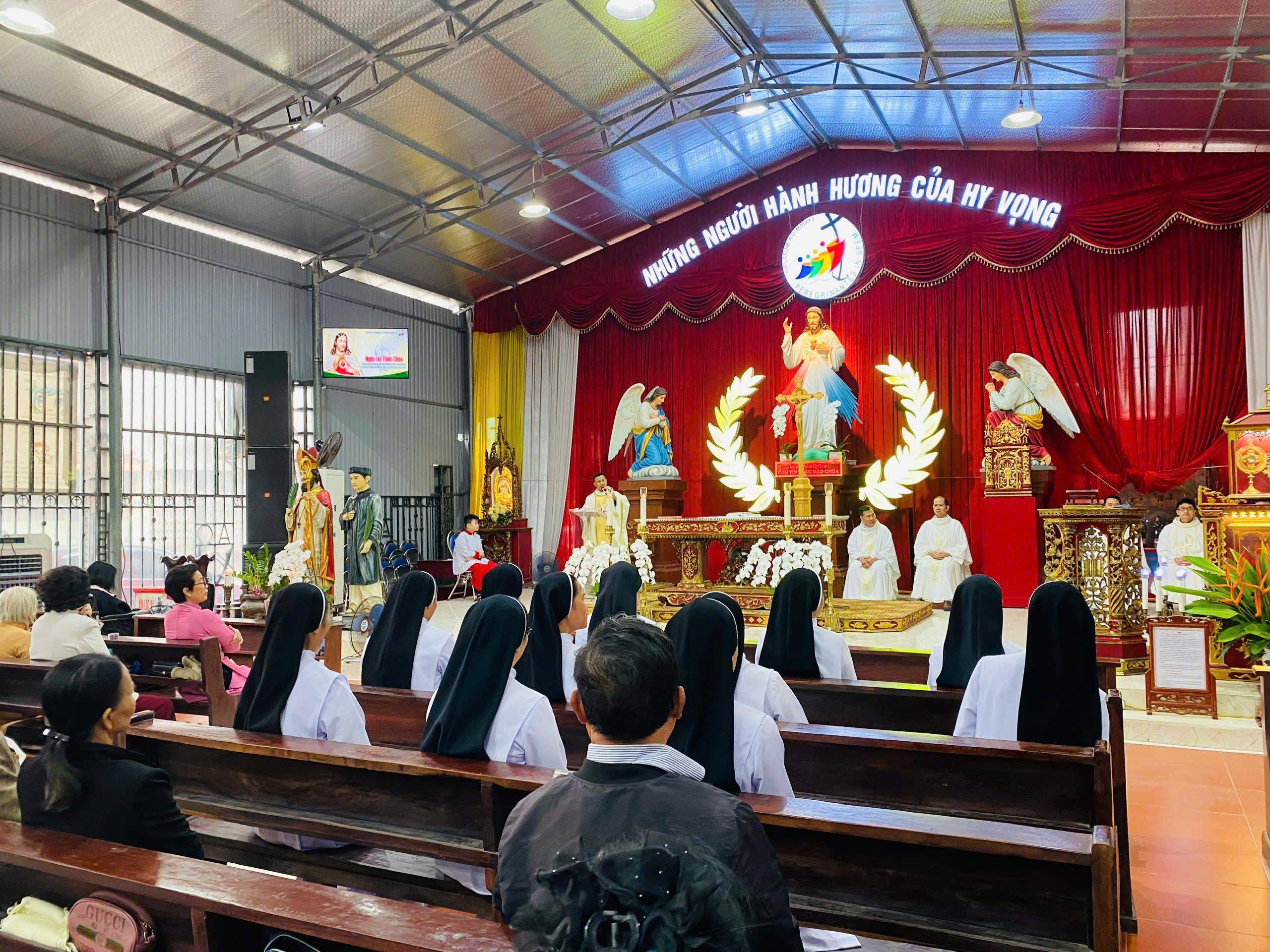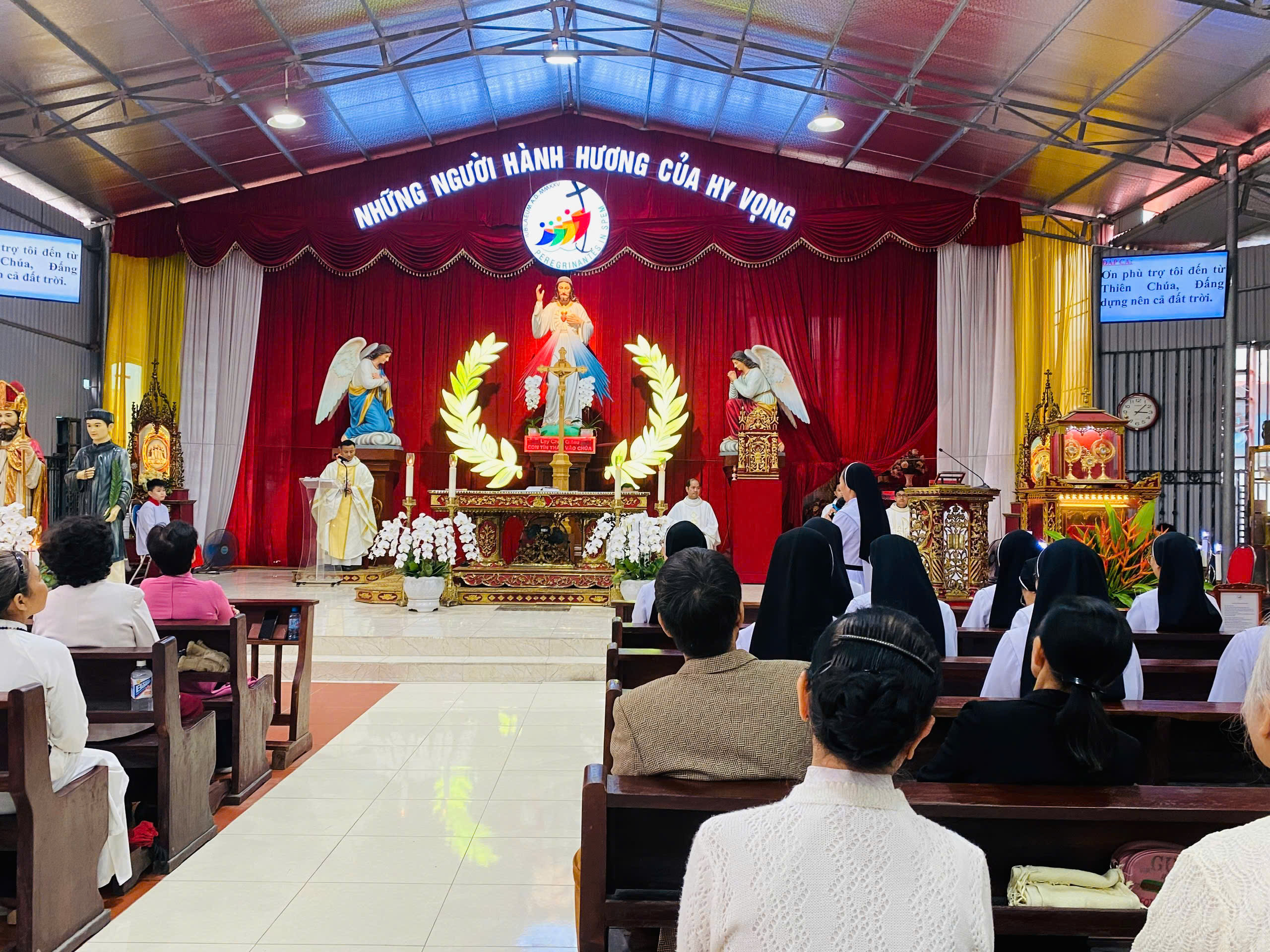 Đúng 15h00, cha Giuse Nguyễn Văn Vang – Quản hạt Hải Dương, Giám đốc Đền Thánh, đã long trọng chủ sự thánh lễ tạ ơn. Cùng hiệp dâng Thánh lễ có sự hiện diện của quý cha đồng tế trong giáo hạt Hải Dương, Dì Tổng Phụ trách Maria Trần Thị Hoa cùng quý chị em trong Hiệp Hội và đông đảo giáo dân trong và ngoài giáo xứ.