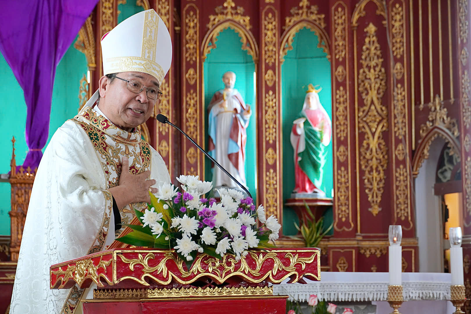 Trong phần bài giảng, dựa trên bản văn Tin mừng theo thánh Luca 1,26-38, Đức cha giúp cho cộng đoàn hiểu được việc Mẹ Maria được Chúa chọn là để thực hiện lời hứa với dân của Người. Mẹ là “Đấng đầy ân sủng” đã được Chúa tuyển chọn và giữ gìn để cưu mang Đấng Cứu Thế. Khi nghe đây là do quyền năng của Chúa Thánh Thần nên Mẹ đã đặt trọn niềm tin và phó thác hoàn toàn cho Chúa.