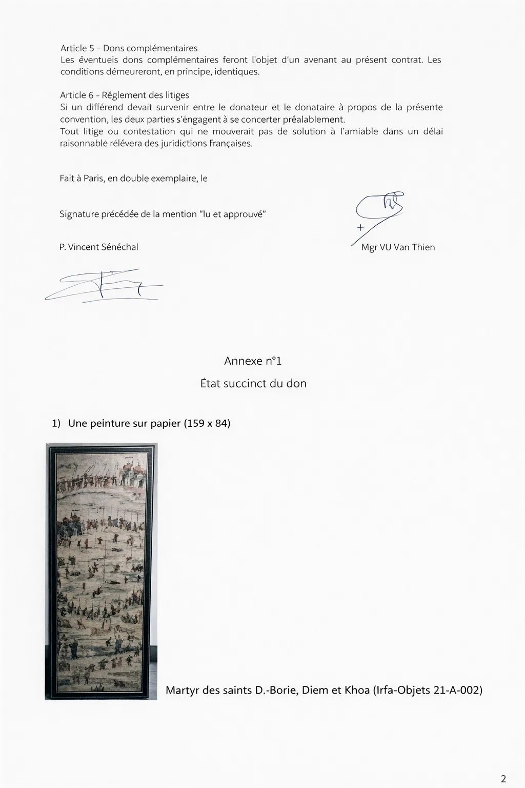 1. Một bức tranh giấy mô tả cuộc tử đạo của Thánh Pierre Dumoulin Borie, Thánh Phêrô Võ Đăng Khoa và Thánh Vinh Sơn Nguyễn Thế Diễm.