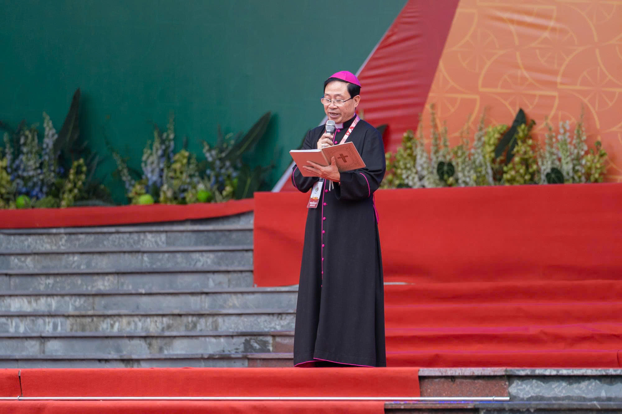 Tiếp đó, Đức cha Đaminh Đặng Văn Cầu – Giám mục Giáo phận Thái Bình, vị chủ nhà của Đại hội – đã ngỏ lời chào mừng và chia sẻ tâm tình: “Chúng ta cảm tạ Chúa vì niềm vui được gặp gỡ nhau nơi đây. Đại hội là dịp để chúng ta được gắn kết, lớn lên trong đức tin và diễn tả tình yêu của Hội Thánh dành cho người trẻ.”