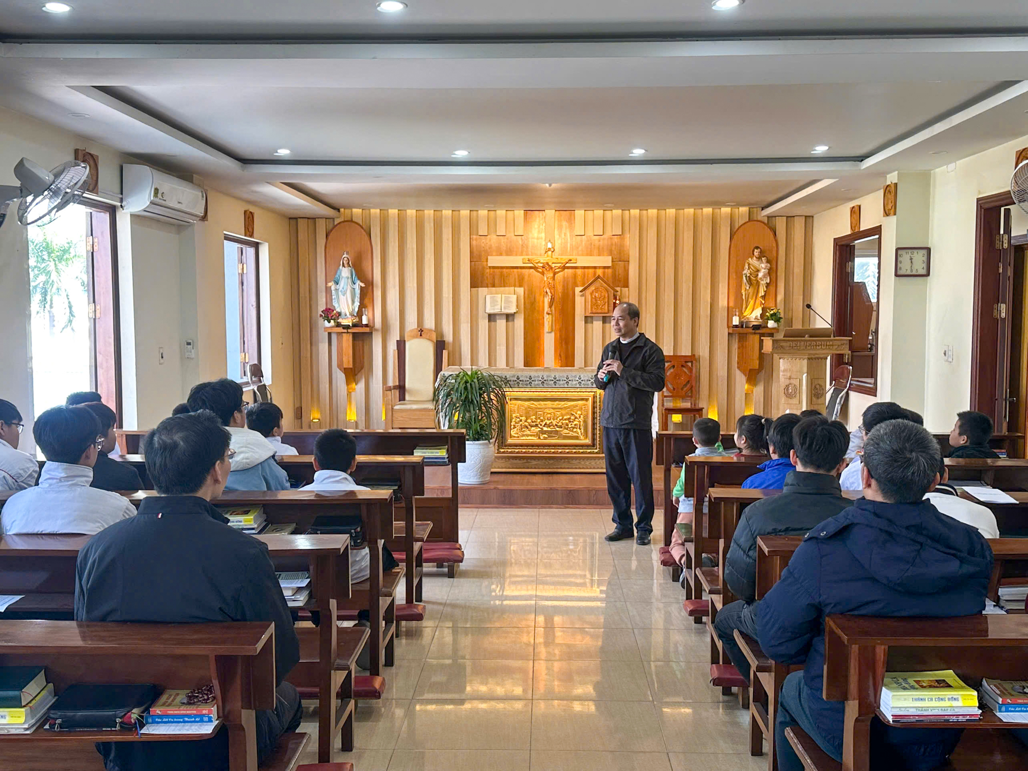 Đón tiếp đoàn có Cha Giám đốc, Cha Phó Giám đốc và các chú ứng sinh đang tu học tại Tiền Chủng viện. Trong buổi gặp gỡ, Cha Giám đốc đã chia sẻ khái quát về đời sống, sinh hoạt và hành trình đào tạo của các ứng sinh linh mục – những người đang ấp ủ ước mơ phục vụ Chúa và Hội Thánh. Các em lễ sinh cũng đã tham dự một số sinh hoạt thường nhật tại Tiền Chủng viện như: giờ Kinh trưa, sinh hoạt thể thao, giao lưu huynh đệ...