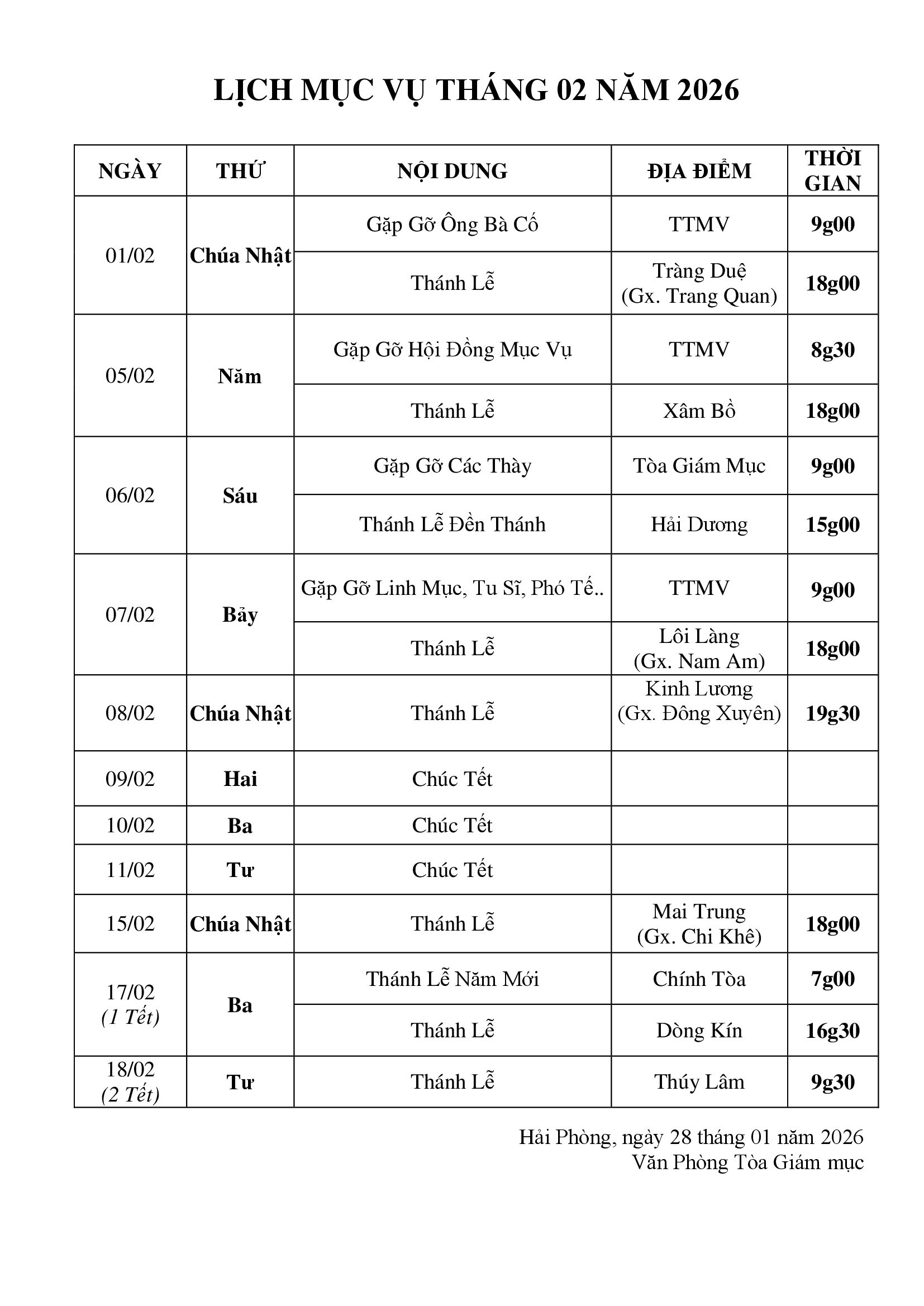 Trong tinh thần hiệp thông, Tòa Giám mục xin trân trọng gửi đến quý độc giả Lịch Mục vụ của Đức Giám mục Giáo phận trong tháng 02 năm 2026.